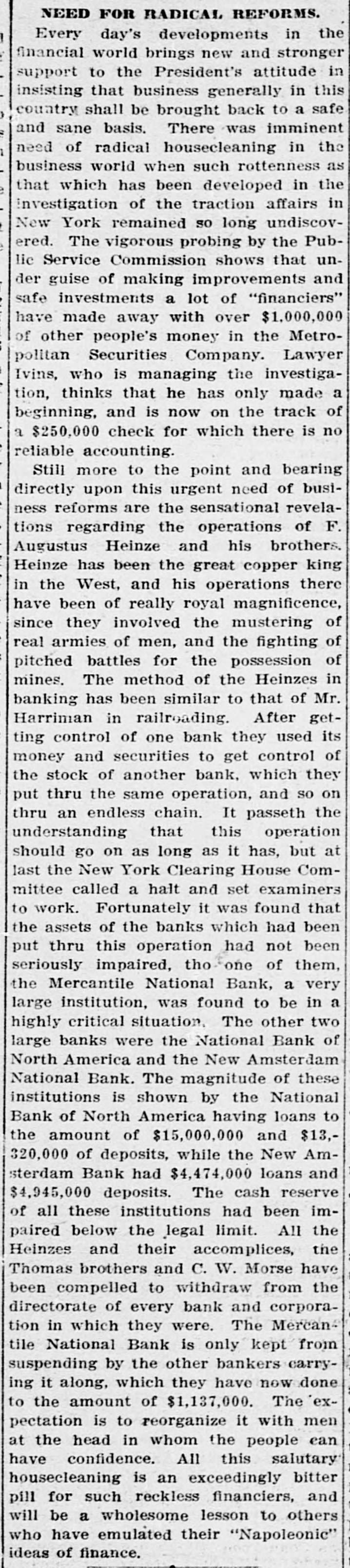NEED FOR RADICAL REFORMS. Every day's developments in the financial world brings new and stronger support to the President's attitude in insisting that business generally in this country shall be brought back to a safe and sane basis. There was imminent need of radical housecleaning in the business world when such rottenness as that which has been developed in the investigation of the traction affairs in New York remained so long undiscovered. The vigorous probing by the Public Service Commission shows that under guise of making improvements and safe investments a lot of "financiers" have made away with over $1,000,000 of other people's money in the Metropolitan Securities Company. Lawyer Ivins, who is managing the investigation, thinks that he has only made a beginning, and is now on the track of a $250,000 check for which there is no reliable accounting. Still more to the point and bearing directly upon this urgent need of business reforms are the sensational revelations regarding the operations of F. Augustus Heinze and his brothers. Heinze has been the great copper king in the West, and his operations there have been of really royal magnificence, since they involved the mustering of real armies of men, and the fighting of pitched battles for the possession of mines. The method of the Heinzes in banking has been similar to that of Mr. Harriman in railroading. After getting control of one bank they used its money and securities to get control of the stock of another bank, which they put thru the same operation, and SO on thru an endless chain. It passeth the understanding that this operation should go on as long as it has, but at last the New York Clearing House Committee called a halt and set examiners to work. Fortunately it was found that the assets of the banks which had been put thru this operation had not been seriously impaired, tho one of them, the Mercantile National Bank, a very large institution, was found to be in a highly critical situation. The other two large banks were the National Bank of North America and the New Amsterdam National Bank. The magnitude of these institutions is shown by the National Bank of North America having loans to the amount of $15,000,000 and $13,320,000 of deposits, while the New Amsterdam Bank had $4,474,000 loans and $4,945,000 deposits. The cash reserve of all these institutions had been impaired below the legal limit. All the Heinzes and their accomplices, the Thomas brothers and C. W. Morse have been compelled to withdraw from the directorate of every bank and corporation in which they were. The Mercantile National Bank is only kept from suspending by the other bankers carrying it along, which they have now done to the amount of $1,137,000. The 'expectation is to reorganize it with men at the head in whom the people can have confidence. All this salutary housecleaning is an exceedingly bitter pill for such reckless financiers, and will be a wholesome lesson to others who have emulated their "Napoleonic" ideas of finance.