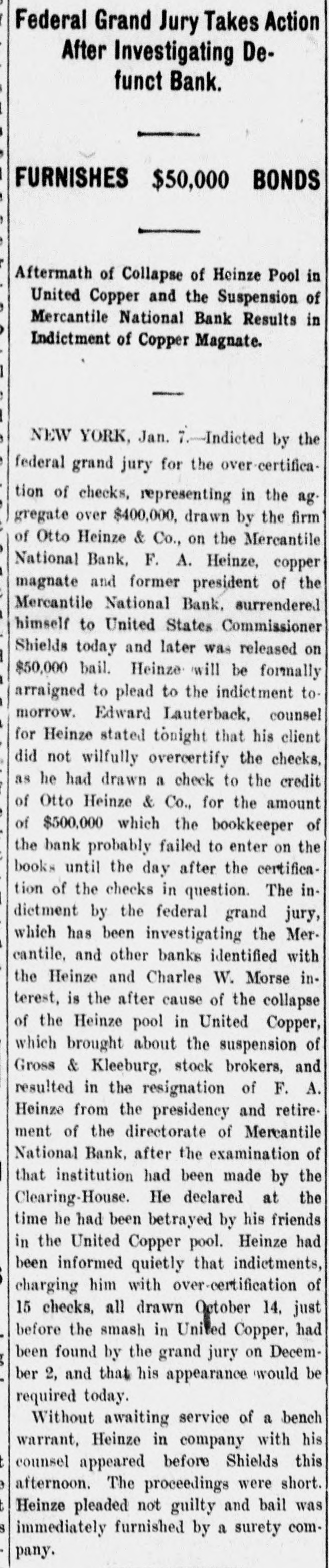 NEW YORK, Jan. 7.-Indicted by the federal grand jury for the over-certification of checks, representing in the aggregate over $400,000, drawn by the firm of Otto Heinze & Co., on the Mercantile National Bank, F. A. Heinze, copper magnate and former president of the Mercantile National Bank, surrendered himself to United States Commissioner Shields today and later was released on $50,000 bail. Heinze will be formally arraigned to plead to the indictment tomorrow. Edward Lauterback, counsel for Heinze stated tonight that his client did not wilfully overcertify the checks, as he had drawn a check to the credit of Otto Heinze & Co., for the amount of $500,000 which the bookkeeper of the bank probably failed to enter on the books until the day after the certification of the checks in question. The indictment by the federal grand jury, which has been investigating the Mercantile, and other banks identified with the Heinze and Charles W. Morse interest, is the after cause of the collapse of the Heinze pool in United Copper, which brought about the suspension of Gross & Kleeburg, stock brokers, and resulted in the resignation of F. A. Heinze from the presidency and retirement of the directorate of Mercantile National Bank, after the examination of that institution had been made by the Clearing-House. He declared at the time he had been betrayed by his friends in the United Copper pool. Heinze had been informed quietly that indictments, charging him with over-certification of 15 checks, all drawn October 14, just before the smash in United Copper, had been found by the grand jury on December 2, and that his appearance would be required today.