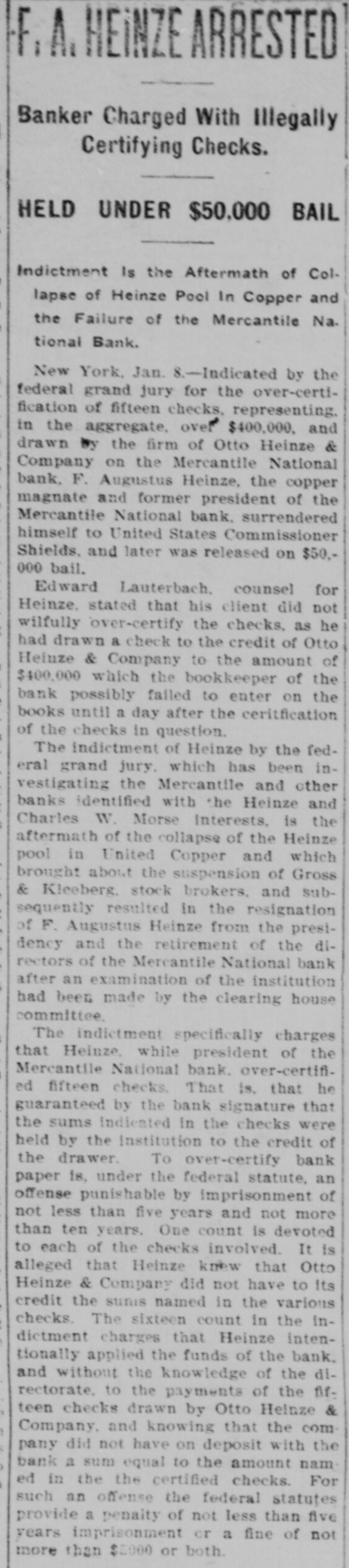 HEiNZE ARRESTED Banker Charged With Illegally Certifying Checks. HELD UNDER $50,000 BAIL Indictment Is the Aftermath of Collapse of Heinze Pool In Copper and the Failure of the Mercantile Na. tional Bank. New York, Jan. 8.-Indicated by the federal grand jury for the over-certification of fifteen checks, representing. in the aggregate, over $400,000. and drawn by the firm of Otto Heinze & Company on the Mercantile National bank, F. Augustus Heinze, the copper magnate and former president of the Mercantile National bank. surrendered himself to United States Commissioner Shields, and later was released on $50,000 bail. Edward Lauterbach. counsel for Heinze, stated that his client did not wilfully over-certify the checks. as he had drawn a check to the credit of Otto Heinze & Company to the amount of $400,000 which the bookkeeper of the bank possibly failed to enter on the books until a day after the ceritfication of the checks in question. The indictment of Heinze by the federal grand jury. which has been investigating the Mercantile and other banks identified with the Heinze and Charles W. Morse Interests, is the aftermath of the collapse of the Heinze pool in United Copper and which brought about the suspension of Gross & Kleeberg. stock brokers. and subsequently resulted in the resignation of F. Augustus Heinze from the presidency and the retirement of the directors of the Mercantile National bank after an examination of the institution had been made by the clearing house committee. The indictment specifically charges that Heinze, while president of the Mercantile National bank. over-certified fifteen checks. That is. that he guaranteed by the bank signature that the sums indicated in the checks were held by the Institution to the credit of the drawer. To over-certify bank paper is, under the federal statute, an offense punishable by imprisonment of not less than five years and not more than ten years. One count is devoted to each of the checks involved. It is alleged that Heinze knew that Otto Heinze & Company did not have to Its credit the sunis named in the various checks. The sixteen count in the indictment charges that Heinze intentionally applied the funds of the bank. and without the knowledge of the directorate, to the payments of the fifteen checks drawn by Otto Heinze & Company. and knowing that the company did not have on deposit with the bank a sum equal to the amount nam ed in the the certified checks. For such an offense the federal statutes provide a penalty of not less than five years imprisonment or a fine of not more than $5000 or both.