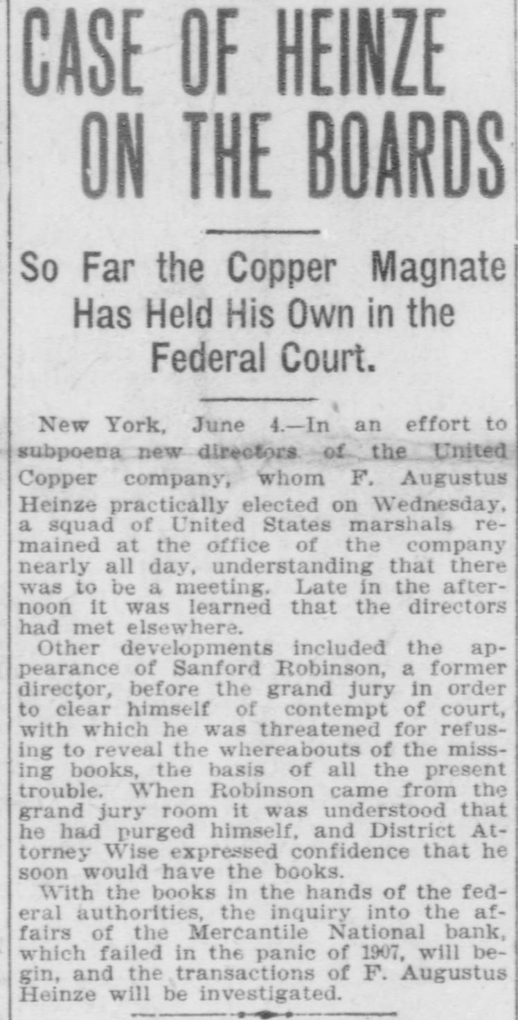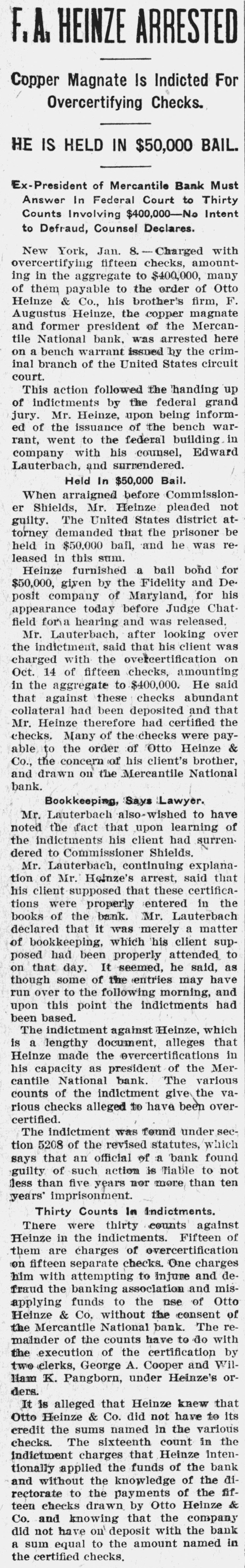 F.A. HEINZE ARRESTED Copper Magnate Is Indicted For Overcertifying Checks. HE IS HELD IN $50,000 BAIL. Ex-President of Mercantile Bank Must Answer In Federal Court to Thirty Counts Involving $400,000-No Intent to Defraud, Counsel Declares. New York, Jan. 8. Charged with overcertifying fifteen checks, amountto ing in the aggregate $400,000, order of many Otto of them payable to the his Heinze, the copper Heinze Augustus & Co., brother's magnate Mercan- firm, F. president of the was and tile National former bank, arrested the crim- here on a bench warrant issued by inal branch of the United States circuit court. action followed the handing up of by the This indictments federal inform- grand jury. Mr. Heinze, upon being the issuance of the warwent to the federal rant, ed of bench building Edward company with his counsel, Lauterbach, and surrendered. Held In $50,000 Bail. before Mr. Heinze When Shields, arraigned Commission- pleaded not The United States atdemanded that the torney er guilty. he prisoner district was re- be held in $50,000 bail, and leased in this sum. Heinze furnished a bail bond for by the of posit $50,000, company given Maryland, Fidelity Judge and for Chat- De- his today before field and was appearance for a hearing looking released. Mr. Lauterbach, after over the said that was with the on charged indictment, overcertification his client of fifteen checks, amounting in to $400,000. Oct. the 14 aggregate abundant He said that against these checks had been deposited therefore had Mr. collateral Heinze certified and that the Many of the checks were paythe order of & concern of his able checks. Co., the to Otto client's Heinze brother, and drawn on the Mercantile National bank. Bookkeeping, Says Lawyer. Mr. Lauterbach also-wished to have noted the fact that upon learning of the indictments his client had surrendered to Commissioner Shields. explanaHeinze's tion Mr. of Lauterbach, Mr. continuing arrest, said certifica- that his that these tions client were supposed properly entered Lauterbach in the books of the bank. Mr. declared that it was merely a matter of bookkeeping, which his client suphad been properly attended to It seemed, as some of the entries may though on posed that day. he said, have to the following and this point the run upon over indictments morning, had been based. The indictment against Heinze, which is a lengthy document, alleges that the as president his Heinze capacity made overcertifications of the various Mer- in cantile National bank. The of the indictment vacounts give been the overrious checks alleged to have certified. The indictment was found under secof the revised statutes, which that an official of a tion says 5208 Tiable 'bank to found not guilty of such action is less than five years nor more than ten years' imprisonment. Thirty Counts In Indictments. were thirty against There counts Fifteen in the indictments. of of on checks. to them Heinze fifteen are separate charges overcertification One charges defraud him with the banking attempting association injure and of and Otto misfunds to the use without the of applying Heinze Mercantile & Co. bank. consent The the National remainder of the counts have to do with the execution of the certification by two elerks, George A. Cooper and William K. Pangborn, under Heinze's orders. that Heinze knew that & Co. did not Otto It is Heinze alleged have to its sums named in the various sixteenth credit checks. the The Heinze count in inten- the indictment charges that the the and tionally without applied knowledge funds of of the the bank fif- dito the payments of the drawn by Otto & teen rectorate checks the Heinze company Co. and knowing that on deposit to the amount did a sum not equal have with named the bank in the certified checks.