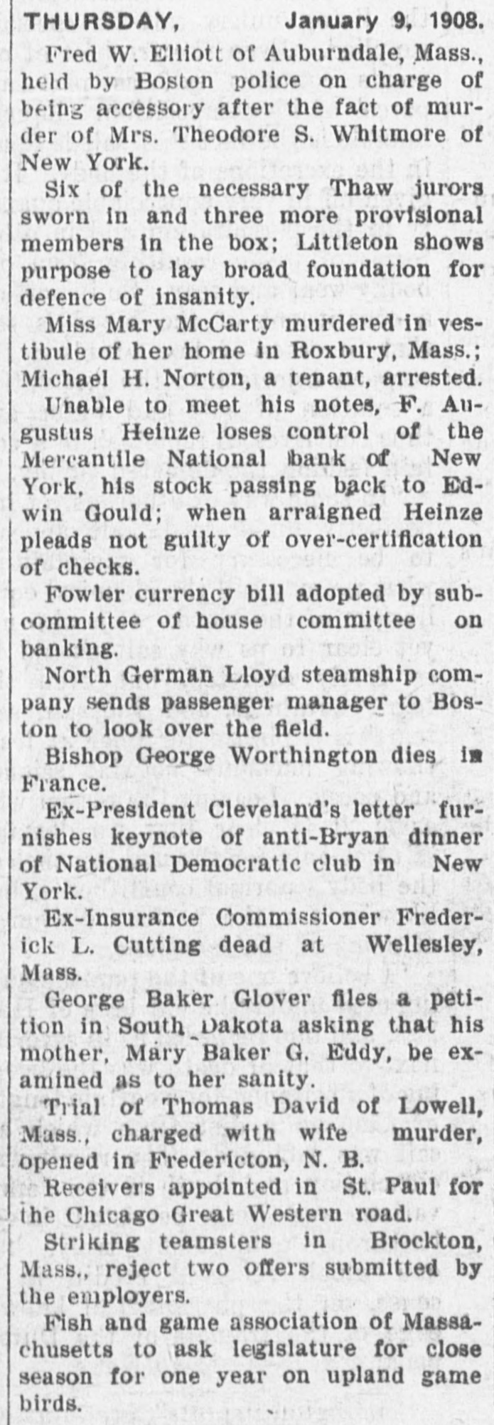 THURSDAY, January 9, 1908. Fred W. Elliott of Auburndale, Mass., held by Boston police on charge of being accessory after the fact of murder of Mrs. Theodore S. Whitmore of New York. Six of the necessary Thaw jurors sworn in and three more provisional members in the box; Littleton shows purpose to lay broad foundation for defence of insanity. Miss Mary McCarty murdered in vestibule of her home in Roxbury, Mass.; Michael H. Norton, a tenant, arrested. Unable to meet his notes, F. Augustus Heinze loses control of the Mercantile National bank of New York, his stock passing back to Edwin Gould; when arraigned Heinze pleads not guilty of over-certification of checks. Fowler currency bill adopted by subcommittee of house committee on banking. North German Lloyd steamship company sends passenger manager to Boston to look over the field. Bishop George Worthington dies in France. Ex-President Cleveland's letter furnishes keynote of anti-Bryan dinner of National Democratic club in New York. Ex-Insurance Commissioner Frederick L. Cutting dead at Wellesley, Mass. George Baker Glover files a petition in South Dakota asking that his mother, Mary Baker G. Eddy, be examined as to her sanity. Trial of Thomas David of Lowell, Mass., charged with wife murder, opened in Fredericton, N. B. Receivers appointed in St. Paul for the Chicago Great Western road. Striking teamsters in Brockton, Mass., reject two offers submitted by the employers. Fish and game association of Massachusetts to ask legislature for close season for one year on upland game birds.