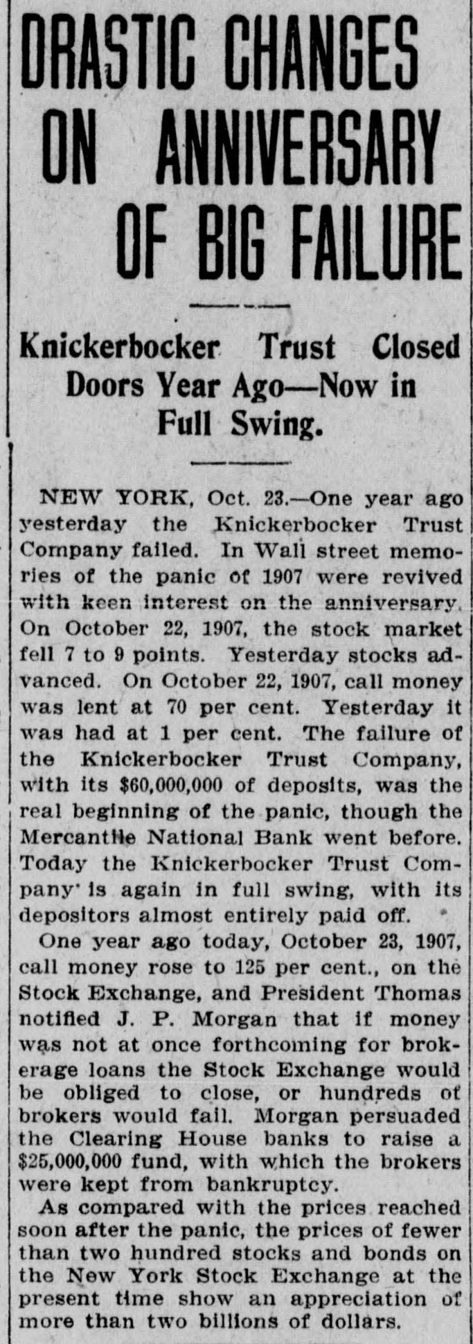 DRASTIC CHANGES ON ANNIVERSARY OF BIG FAILURE Knickerbocker Trust Closed Doors Year Ago-Now in Full Swing. NEW YORK, Oct. 23.-One year ago yesterday the Knickerbocker Trust Company failed. In Wall street memories of the panic of 1907 were revived with keen interest on the anniversary On October 22, 1907, the stock market fell 7 to 9 points. Yesterday stocks advanced. On October 22, 1907, call money was lent at 70 per cent. Yesterday it was had at 1 per cent. The failure of the Knickerbocker Trust Company, with its $60,000,000 of deposits, was the real beginning of the panic, though the Mercantile National Bank went before. Today the Knickerbocker Trust Company' is again in full swing, with its depositors almost entirely paid off. One year ago today, October 23, 1907, call money rose to 125 per cent., on the Stock Exchange, and President Thomas notified J. P. Morgan that if money was not at once forthcoming for brokerage loans the Stock Exchange would be obliged to close, or hundreds of brokers would fail. Morgan persuaded the Clearing House banks to raise a $25,000,000 fund, with which the brokers were kept from bankruptcy. As compared with the prices reached soon after the panic, the prices of fewer than two hundred stocks and bonds on the New York Stock Exchange at the present time show an appreciation of more than two billions of dollars.