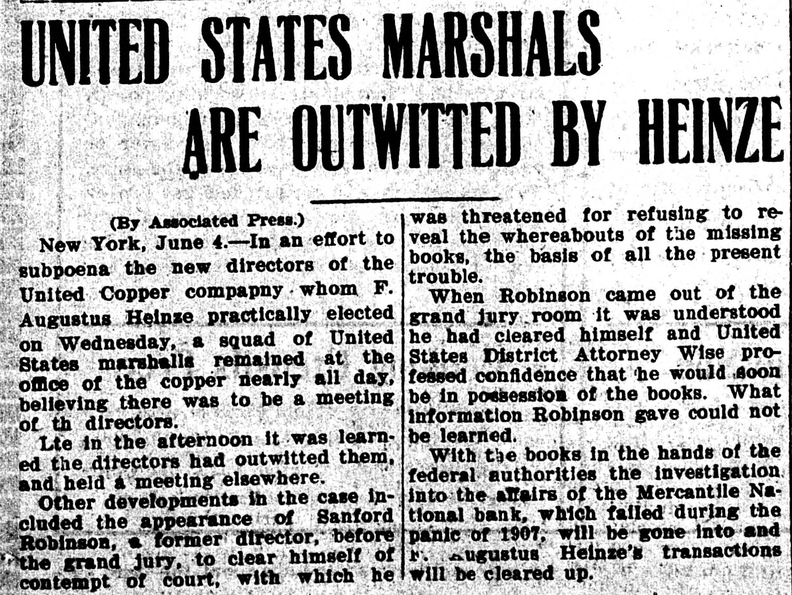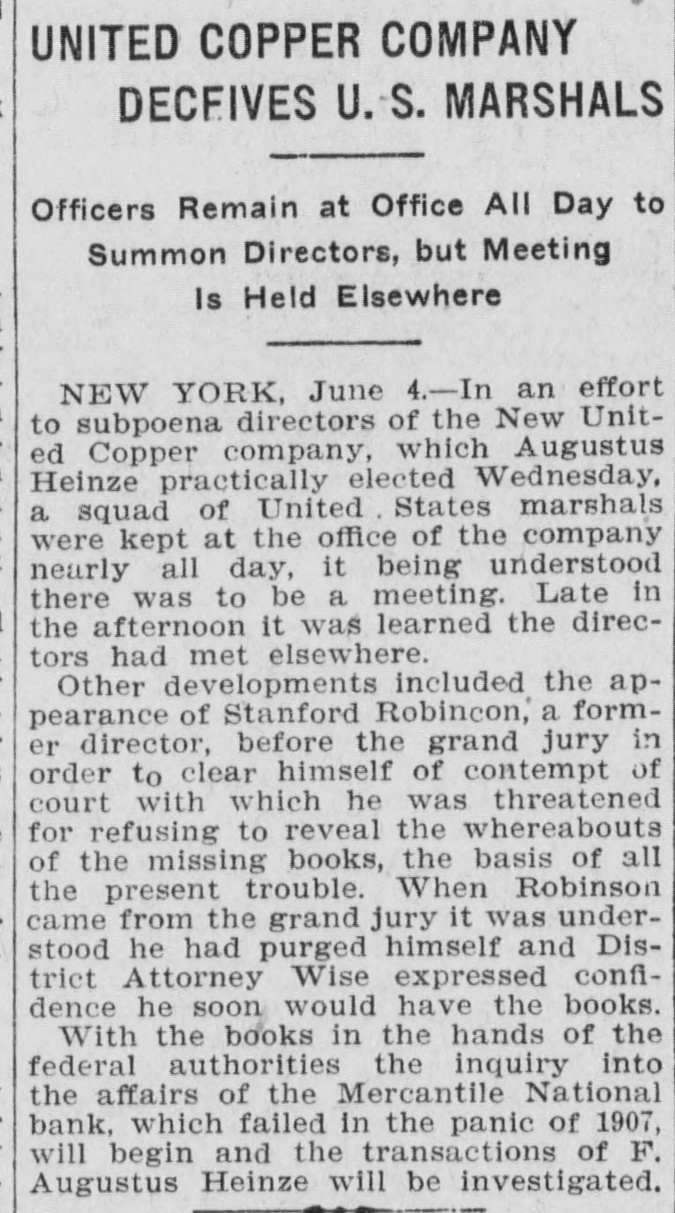 UNITED STATES MARSHALS ARE OUTWITTED BY HEINZE was threatened for refusing to re(By Associated Press.) veal the whereabouts of the missing New York, June 4.-In an effort to books, the basis of all the present subpoena the new directors of the trouble. United Copper compapny . whom F. When Robinson came out of the grand jury room it was understood Augustus Heinze practically elected he had cleared himself and United on Wednesday, a squad of United States District Attorney Wise proStates marshalls remained at the fessed confidence that he would soon office of the copper nearly all day, be in poesession of the books. What believing there was to be a meeting information Robinson gave could not of th directors. be learned. Lte in the afternoon it was learnWith the books in the hands of the ed the directors had outwitted them, federal authorities the investigation and held a meeting elsewhere. into the affairs of the Mercantile NaOther developments in the case included the appearance of Sanford tional bank, which failed during the Robinson, a former director, before panic of 1907, will be gone into and the grand jury, to clear himself of N. augustus Heinze's transactions contempt of court, with which he will be cleared up.