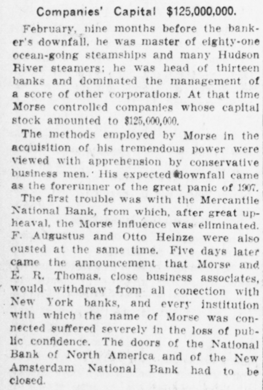 Companies' Capital $125,000,000. February, nine months before the banker's downfall. he was master of eighty-one ocean-going steamships and many Hudson River steamers: he was head of thirteen banks and dominated the management of a score of other corporations. At that time Morse controlled companies whose capital stock amounted to $125,000,000. The methods employed by Morse in the acquisition of his tremendous power were viewed with apprehension by conservative business men. His expected downfall came as the forerunner of the great panic of 1907. The first trouble was with the Mercantile National Bank, from which, after great upheaval. the Morse influence was eliminated. F. Augustus and Otto Heinze were also ousted at the same time. Five days later came the announcement that Morse and E. R. Thomas. close business associates, would withdraw from all conection with New York banks, and every institution with which the name of Morse was connected suffered severely in the loss of public confidence. The doors of the National Bank of North America and of the New Amsterdam National Bank had to be closed.
