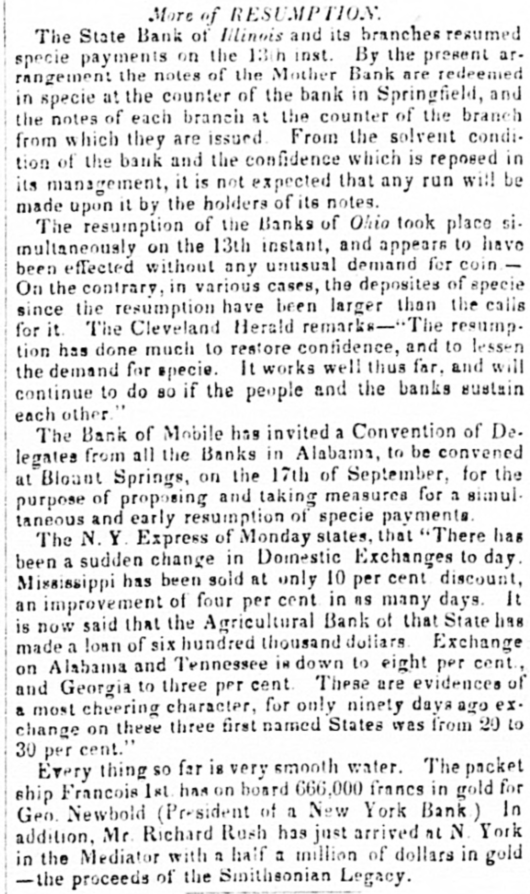 By the Express Mail. We have dates from New Orleans to the 7th of July. Signora Pantanelli was to have a benefit on the evening of the 7th. The papers are filled with puffs for the occasion. The Mobile papers are blowing up the Whigs for turning Bentonians. Samuel W. Oliver, of Conecuh, has been nominated for Governor of Alabama, as the reform and relief candidate. A. P. Bagby is the anti-bank candidate. He is a convert. BENNETT AND HIS HERALD.-Bennett has almost as many different characters (in report) as he has whims and ideas, (and of the latter he has more than any other man in the great city of Gotham.) He is highly educated, and as enterprising as he is learned and amusing. He now publishes no less than four papers, like Gen. Jackson, taking the sole responsibility' on himself. He publishes the Morning Herald and Evening Chronicle, the weekly Herald and the Weekly Chronicle. The latter is, without exception, the ablest, hanisemest, most amusing, and edifying paper in the United States.-Mobile Exam. MOBILE, July 8.-Money Market.-Nothing has transpired worthy of notice in our market during the last three days. The ever memorable Fourth was celebrated with becoming spirit, which has been duly noticed in the Examiner. There was one or two errors in our report of Tuesday, which should be corrected. We should have stated that a strictly good article of cotton would bring 11 cents. We stated also that many would not avail themselves of the bank system. It should be the bond system. Again, in speaking of the laws passed by the legislature, in reference to the banks, we stated that they were allowed to suspend specie payments until 1840. The Bank of Mobile and the Merchants' and Planters' only were included in the law, and that, too, by complying with certain conditions. The State Banks and its branches may suspend till doomsday, for aught we can tell. The relief law itself, as it is called, is most bunglingly drawn up, and some parts much mystified. We could draft a better one ourselves. We regard the bond system as a complete juggle, and happy is the man that does not meddle with it. Whoever shall be caught in its meshes will find himself completely used up. What person would buy real estate or any other property when he finds that the banks hold a mortgage on the same for double its value? Not one.-Ib. Mr. James E. Murdock, of Bosten, one of the best actors on the American stage, is engaged, during the recess of the Tremont, is giving lessons in Elocution. We know no one who is better qualified. D The Boston Times is out on grand juries, for finding bills of indictment, which prove upon trial to have been without good and sufficient cause. We shall cogitate little on this, some day. p How comesit that the agent of the Wilsons & Co. of London, said he had no intelligence of their failure of the Oxford, and yet they have made an assignment of their effects here? Henry A. Wise, of Virginia, has written a letter, stating that he is a temperate and sober man in eating and drinking. We are glad to bear it, and wish he would regulate his tongue on the same principles. Dr The weather thus far has been uncommonly cold in the south of France, and large crops of fruit destroyed in consequence. The oil crop in particular is expected to be short. A RECOMMENDATION-"Patrick do you know how to drive a Phayton? Sure, I do, your honor. Was'nt it I that turned you over two years ago?" I A man at East Boston made a desperate attempt to furnish the worms with a banquet, and make his wife a widow, by cutting his throat. Not sucf ceeding to his wish, he then tried to drown himself. The papers have been blowing up the omnih busses for years, and they are worse than ever. We t shall puff them and try the effect of that. a What's the matter with Commodors Elliott D again He does nothing but agree to disagree with e his brother officers. s Dr How the Hickory leaves are falling! The f Ohio Rail Road Company intend issuing $200,000 in shin plasters. I or A contemporary says it is a sin and a shame to use up such quantities of beautiful silk paper, for promises to pay, where nothing is paid. The French have banished several regicides to this country, where, they say, there are ne kings to be killed. or Chains must be substituted for tiller ropes in our steamers. Remember the Ben Sherrod. I What amount of goods, liable to cash duties, 1 are now in the public stores? or What is the reason that Mr. Locofoco Ming gets his salary in specie, and few of the other clerks? or The riot trials at Boston egettingalong slowly. Cooke is driving business at the Lion Theatre. COURT OF SESSIONS.-Before the Recorder, Alderman Hoxie and RJ Smith. Francis Randall, a sailor, charged with grand larceny, robbing a brother r-pleaded guilty to petit lare ceny. Plea received. Robert Duff and Martin Nicholas, charged with I grand larceny, robbing Mr. Patrick Finney. Patrick Finney, examined. was passenger OR board the Philadelphia boat to New York. When we g arrived I missed my trunk. The clothes it contained were worth $30. I The prisoners were arrested by a watchman, who found the trunk in their possession. They had carried it into a lumber yard, and were endeavouring to force it open. The jury found the prisoners guilty of petit larceny only. Sentenced for six months.