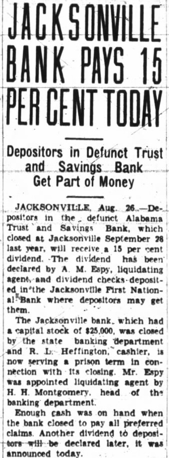 JACKSONVILLE BANK PAYS 15 Depositors in Defunct Trust and Savings Bank Get Part of Money JACKSONVILLE Aug. positors the defunct Alabama Trust and Savings Bank. which closed at Jacksonville September 28 last year. will receive 15 per cent dividend. The dividend has been declared by M. Espy, liquidating agent, and dividend checks depositin the Jacksonville First Nationwhere depositors may get them. The Jacksonville bank. which had capital stock of $25,000, was closed by the state banking department now serving prison term in connection with its closing Mr. Espy was appointed liquidating agent by H. H. Montgomery. head of the banking department Enough cash was on hand when the bank closed to pay all preferred claims Another dividend to deposttors will be declared later, it was announced today.