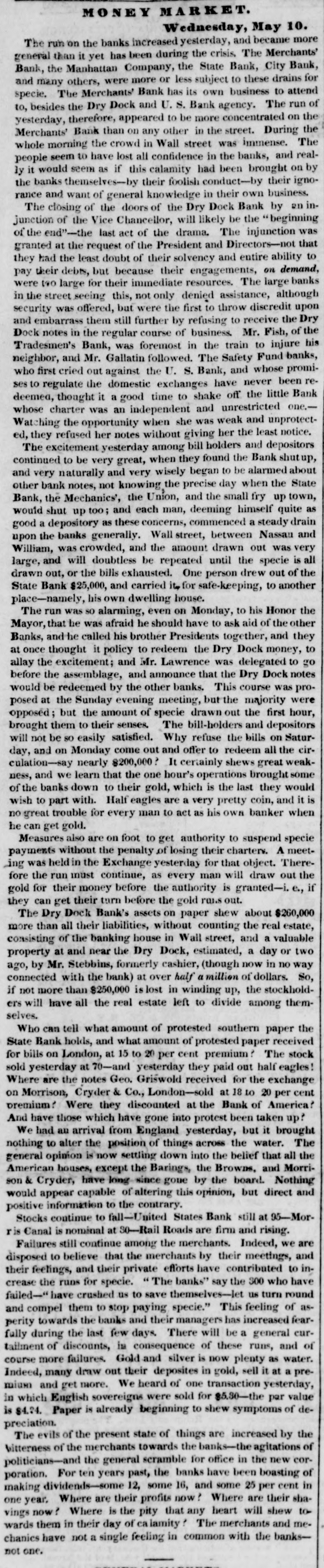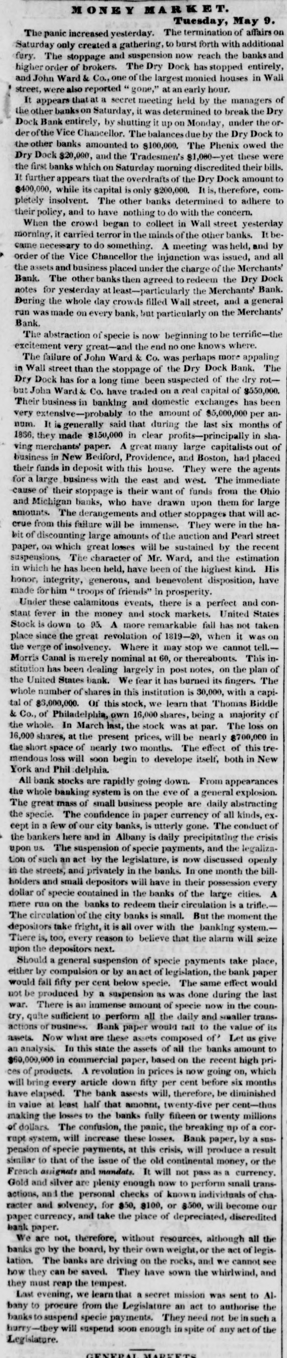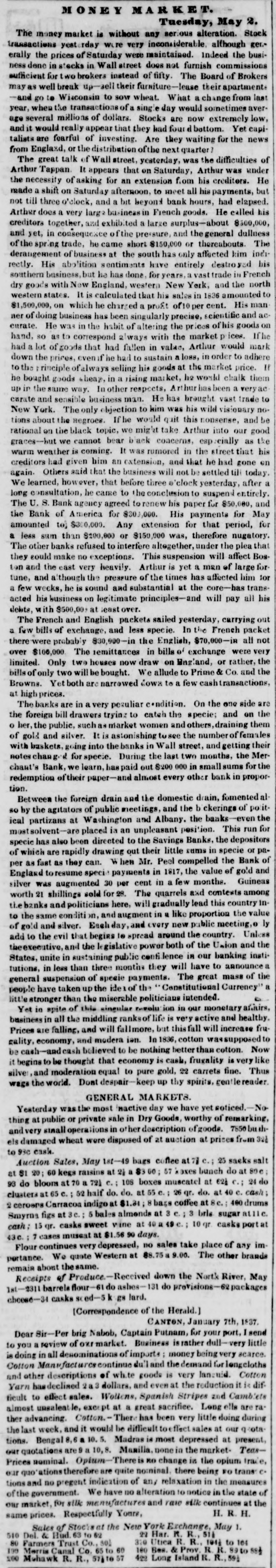 M o E Y M A R K Tuesday, May 2. The money market is without any serious alteration. Stock transactions yesterday were very inconsiderable. although ger. erally the prices of Saturday were maintained. Indeed the business done in stocks in Wall street does not furnish commissions sufficient for two brokers instead of fifty. The Board of Brokers mayas well break up-sell their furniture-lease their apartment -and go to Wisconsin to sow wheat. What a change from last year, when the transactions of single day would sometimes average several millions of dollars. Stocks are now extremely low, and it would really appear that they had four bottom. Yet capitalists are fearful of investing. Are they waiting for the news from England, or the distribution of the next quarter ? The great talk of Wall street, yesterday, was the difficulties of Arthur Tappan. It appears that on Saturday, Arthur was under the necessity of asking for an extension f.om his creditors. He made a shift on Saturday afternoon. to meet all his payments, but not till three o'clock, and a bit beyond bank hours, had elapsed. Arthur does a very larga busineas in French goods. He called his creditors together, and exhibited a large surplus-about 8500,000, and yet, in consequence of the pressure, and the general dullness of the spr.ng trade, he came short $150,000 or thereabouts. The derangement of business at the south has only affected him incirectly. His abolition sentiments have entirely destroyed his southern business, but he has done, for years, vast trade in French dry goods with New England, western New York, and the north western states. It is calculated that his sales in 1836 amounted to $1,500,000, OR which he charged proft of per cent. His man ner of doing business has been singularly precise, scientific and aceurate. He was in the habit of altering the prices of his goods on hand. so as to correspond always with the market p ices. If he had lot of goods that had fallen in value, Arthur would mark down the prices, even if he had to sustain a loss, in order to adhere If to the rinciple of always selling his goods at the market price. he bought goods hear, in a rising market, he world chalk them up in the same way. In other respects, Ar hur has been a very carate and sensible business man. He has brought vast trade to New York. The only objection to him was his wild visionary notions about the negroes. If he would quit this nonsense, and be rational on the black topic, we might take Arthur into our good graces-but we cannot bear black concerns, especially as the warm weather is coming. It was rumored in the reet that his creditors had given him an extension, and that he had gone en again. Others said that the business will not be settled tili today. We learned, however, that before three 'clock yesterday, after a long consultation, he came to the conclusion to suspend entirely. The U. S. Bank agency agreed to renew his paper for $50,000. and the Bank of America for $303,000 His payments for May amounted to) $300,000. Any extension for that period, for a less sun than $200,000 or $150,000 was, therefore nugatory. The other banks refused to interfere altogether, under the plea that they could make no exceptions. This suspension will affect Bos ten and the east very heavily. Arthur is yet a man of large for tune, and although the pressure of the times has affected him for a few weeks, he is sound and substantial at the core-has transacted his business on legitimate principles-and will pay all his debts, with $500,00 at least over. The French and English packets sailed yesterday, carrying out a few bills of exchange, and less specie. In the French packet there-were probably $30,900-in the English, $70,000-in all not over $100,000 The lemittances in bills e' exchange were very limited. Only two houses now draw on Ung'and, or rather, the bills of only two will be bought. We allude to Prime & Co. and the Browns. Yet both are narrowed Lows to a few cash transactions, at high prices. The banks are in a very pesuliar condition. On the one side are the foreign bill drawers trying to catch the specie; and on the o her, the public, such as market women and others, draining them of gold and silver. It is astonishing to see the number of females with baskets. going into the banks in Wall street, and getting their notes chan g.d for specie. During the last two months, the Merchant's Bank, we learn, has paid out $200 000 in small sums for the redemption of their paper-and almost every other bank in proportion. Between the foreign drain and the domestic drain, fomented also by the agitators of public meetings, and the b ckerings of political partizans at Washington and Albany. the banks -even the most solvent-are placed in an unpleasant position. This run for specie has also been directed to the Savings Banks, the depositors of which are rapidly drawing out their little sums in specie or paper as fast as they can. W hen Mr. Peel compelled the Bank of England resume special payments in 1817, the value of gold and silver was augmented 30 per cent in a few months. Guineas worth 21 shillings sold for 28. The quarrels and contexts among banks and politicians here, will gradually lead this country into the same conditi on, and augment in a like proportion the value of gold and silver. Eachday and every new public meeting,o ly add to the evil that begies to spread around the country. Unless the executive, and the legislative power both of the Union and the States, unite in sustaining public centi lence in our banking institutions, in less than three months they will have to announce a general suspension of specie payments. The great mass of the people have taken up the ide of the Constitutional Currency stronger than the miserable politicians intended. Yet in spite of this singular revolu ion in our monetary afairs, business in all the middling ranks of life is very active and healthy. Prices are falling, and will llmore, but this fall will increase 