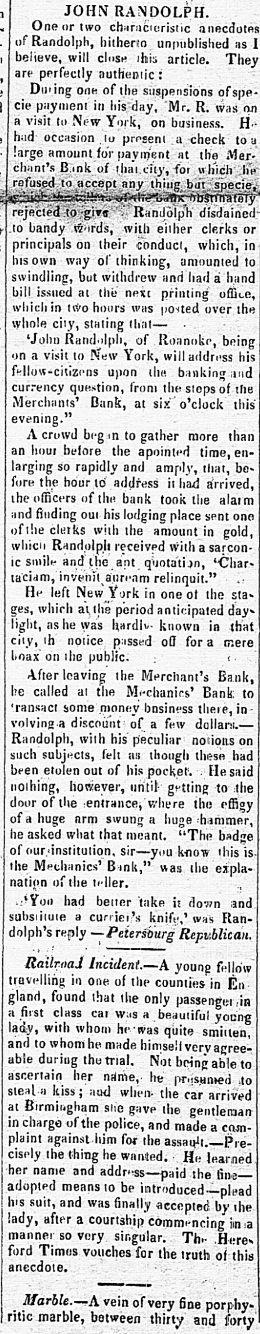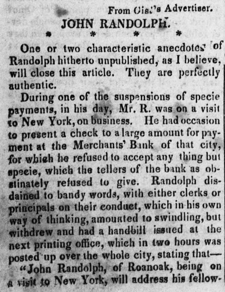 During one of the suspensions of specie payment in his day, Mr. R. was on a visit to New York, on business. He had occasion to present a check to a large amount for payment at the Merchants' Bank of that city, for which he refused to accept anything but specie, which the tellers of the bank as obstinately refused to give. Randolph disdained to bandy words, with either clerks or principals on their conduct, which, in his own way of thinking, amounted to swindling, but withdrew and had a hand bill issued at the next printing office, which in two hours was posted over the whole city, stating that-