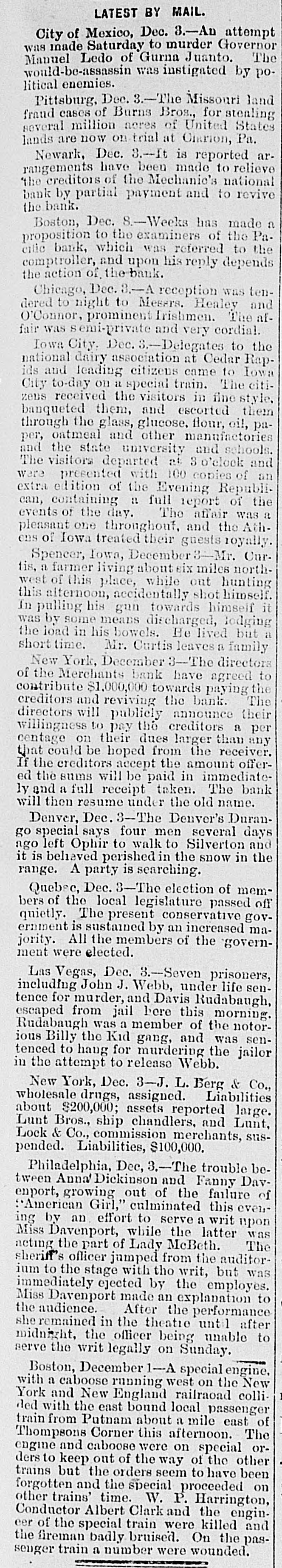 Dec. 0.00 e City of Mexico, Saturday to murder Governor The was made Ledo of Gurna Juanto. would-be-nessassin Manuel was instigated by political enemies. Dec. 3.-The Missouri land Pittsburg, of Burns Bros., for stealing States fraud cases million nores of United Pa. lands several are now on trial at Ciarion, Dec. 3.--It is reported relieve arNewark, have been made to national rangements creditors of the Mechanic's revive the bank by partial payment and to the bank. Dec. s.-Weeks has made Pa- a Boston, to the examiners of the to the proposition bank, which was referred citic comptroller, and upon his reply depends the action of the-bank. Dec. 3.-A reception was ten- and Chicago, to night to Mesers. Healey dered prominent Irishmen. The affair O'Connor, was emi-private and very cordial. Iowa City: Dec. 3.-Delegates to Rap- the dairy association at Cedar Iowa national and lending citizens came to citiids on a special train. The City the visitors in zeus them, and banqueted to-day received escorted fine oil, style, them pathe glass, glucose. Hour, through outmeal and other manufactories per, the state university and schools. and and visitors departed at 3 o'clock of The presented with 100 copies an were edition of the Evening Republi- of the extra containing IL full report was R can, of the day. The affair Athevents one throughout. and the ens pleasant of Iowa treated their guests royally. Spencer, Iowa, December 3-Mr. north- Curfarmer living about six miles tis, a of this place, while out hunting himself. this west alternoon, accidentally shot himself it pulling his gun towards In some means discharged, lodging but a was the by in his bowels. He lived Mr. Curtis leaves a short load time. directors family New York, December 3--The to the Merchants bank have agreed the of $1,000,000 towards paying and reviving the will publicly announce contribute directors creditors bank. their The per willingness to pay the creditors than a on their dues larger receiver. any centage could be hoped from the offerthat creditors accept the amount If the sums will be paid in immediate- bank ed and the full receipt taken. The name. ly will then a resume under the old Dec. 3--The Denver's Duran- days Denver, special says four men Silverton several and go left Ophir to walk to in the ago it is behaved perished in the snow range. A party is searching. Dec. 3-The election of mem- off Quebec, of the local legislature passed bers The present conservative increased gov- maernment quietly. is sustained by an ment were elected. jority. All the members of the governLas Vegas, Dec. 8.--Seven prisoners, John J. Webb, under life senincluding for murder, and Davis Rudabaugh, tence from jail here this morning. notorescaped Rudabaugh was a member of the senBilly the Kid gang, and was tenced ious to hang for murdering the jailor in the attempt to release Webb. New York, Dec. 3-J. L. Berg & Co., wholesale drugs, assigned. Liabilities $200,000; assets reported Lunt, large. about Lunt Bros., ship chandlers. and Lock & Co., commission merchants, suspended. Liabilities, $100,000. Philadelphia, Dec, 3.-The trouble Dav- beAnna Dickinson and Fanny of tween growing out of the failure enport, American Girl," culminated this even by an effort to serve a writ upon ing Miss Davenport, while the latter The was the part of Lady McBeth. officer jumped from ium the stage with tho writ, sheriff's acting to the but auditor- was immediately ejected by the employes. the audience. Miss Davenport made an explanation to After the performance she remained in the theatre until after to midnight, the officer being unable serve the writ legally on Sunday. Boston, December 1-A special engine. New caboose running west on the colliYork with a and New England railraoad with the east bound local passenger of ded from Putnam about a mile east The train Thompsons Corner this afternoon. orand caboose were on special other engine to keep out of the way of the been ders but the orders seem to have trains and the special proceeded on forgotten trains' time. W. P. Harrington, Conductor other Albert Clark and the engin- and the special train were killed the eer of fireman badly bruised. On the passenger train a number were wounded.
