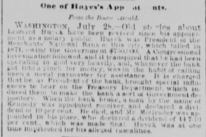 One of Hayes's App are nts. From the Boston derald. WASHINGTON, July 28.-Old sto "tes about Leonard Huyck have been revived since his appointment as a notary public. Huyck was President of the Merchants' National Bank 01 this city, which tailed in 1871, owing the Government $750,000. A Congressional investigation followed. and it transpired that he had been operating in gold very heavily, and, whenever the bank got into a pinch for money, was in the habit of calling upon a naval paymaster for assistance. It is charged that he, as President of the bank. brought special influences to bear on the Treasury Department, which indueed them to make the bank a sort of Government de. pository. When the bank broke, a man by the name of Kennedy was appointed receiver. and declared a dividend of 10 per cent. He died, and Mr. McGruder was appointed in his place, who declared a dividend of 14 7-10 per cent. which was made final. Huyek was at one time imprisoned for his alleged rascalities.