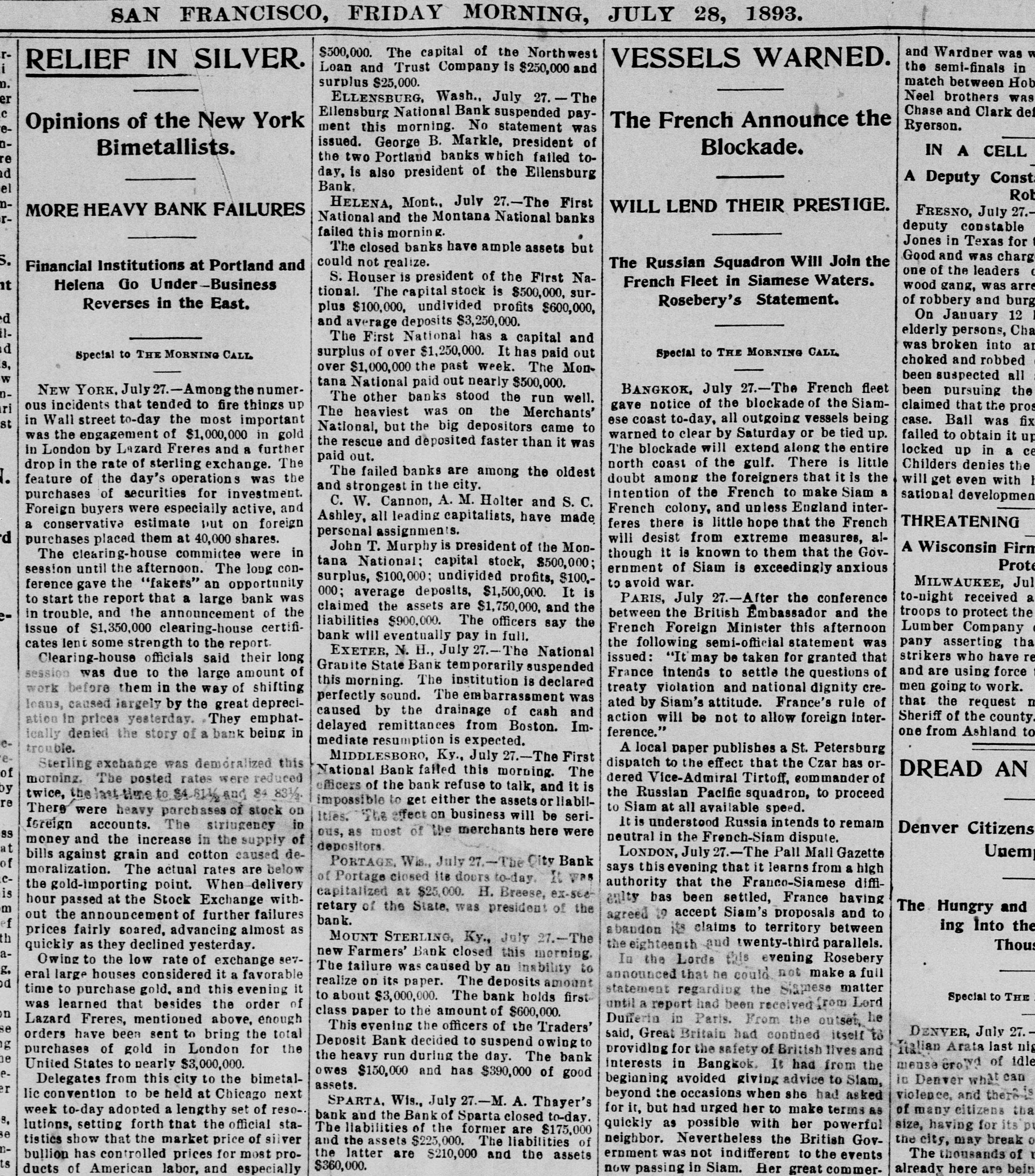 SAN FRANCISCO, FRIDAY MORNING, JULY 28, 1893. and Wardner was W $500,000. The capital of the Northwest VESSELS WARNED. RELIEF IN SILVER. the semi-finals in i Loan and Trust Company is $250,000 and match between Hob n. surplus $25,000. er ELLENSBURG, Wash., July 27. - The Neel brothers was Chase and Clark def c Ellensburg National Bank suspended payThe French Announce the Ryerson. ement this morning. No statement was Opinions of the New York issued. George B. Markle, president of Blockade. Bimetallists. IN A CELL the two Portland banks which failed tore d day, is also president of the Ellensburg A Deputy Consta Bank, el Rob nHELENA, Mont., July 27.-The First WILL LEND THEIR PRESTIGE. MORE HEAVY BANK FAILURES FRESNO, July 27.National and the Montana National banks rdeputy constable failed this morning. Jones in Texas for ( The closed banks have ample assets but Good and was charg S. could not realize. The Russian Squadron Will Join the Financial Institutions at Portland and one of the leaders d S. Houser is president of the First NaFrench Fleet in Siamese Waters. t Helena Go Under-Business wood gang, was arre tional. The capital stock is $500,000, surof robbery and burg Rosebery's Statement. Reverses in the East. plus $100,000, undivided profits $600,000, I On January 12 d and average deposits $3,250,000. elderly persons, Cha ilThe First National has a capital and was broken into an d surplus of over $1,250,000. It has paid out Special to THE MORNING CALL Special to THE MORNING CALL I choked and robbed s, over $1,000,000 the past week. The Monbeen suspected all W tana National paid out nearly $500,000. BANGKOK, July 27.-The French fleet NEW YORK, July 27.-Among the numerbeen pursuing the nThe other banks stood the run well. ous incidents that tended to fire things up gave notice of the blockade of the Siamclaimed that the pros ri The heaviest was on the Merchants' ese coast to-day, all outgoing vessels being case. Ball was fix in Wall street to-day the most important st National, but the big depositors came to warned to clear by Saturday or be tied up. was the engagement of $1,000,000 in gold failed to obtain it up the rescue and deposited faster than it was The blockade will extend along the entire in London by Lazard Freres and a further locked up in a ce paid out. north coast of the gulf. There is little Childers denies the drop in the rate of sterling exchange. The The failed banks are among the oldest doubt among the foreigners that it is the feature of the day's operations was the will get even with 1 and strongest in the city. intention of the French to make Siam a purchases of securities for investment. sational developmen C. W. Cannon, A. M. Holter and S. C. French colony, and unless England interForeign buyers were especially active, and Ashley, all leading capitalists, have made THREATENING a conservativa estimate but on foreign feres there is little hope that the French personal assignments. d will desist from extreme measures, alpurchases placed them at 40,000 shares. John T. Murphy is president of the MonA Wisconsin Firm though it is known to them that the GovThe clearing-house committee were in tana National; capital stock, $500,000; Prote ernment of Siam is exceedingly anxious session until the afternoon. The long consurplus, $100,000; undivided profits, $100.to avoid war. MILWAUKEE, Jul ference gave the "fakers" an opportunity 000; average deposits, $1,500,000. It is to-night received a PARIS, July 27.-After the conference to start the report that a large bank was claimed the assets are $1,750,000, and the between the British Embassador and the troops to protect the in trouble. and the announcement of the liabilities $900,000. The officers say the Lumber Company o issue of $1,350,000 clearing-house certifiFrench Foreign Minister this afternoon bank will eventually pay in full. pany asserting tha the following semi-official statement was cates lent some strength to the report. EXETER, N. H., July 27.-The National strikers who have re issued: "It may be taken for granted that Clearing-house officials said their long Granite State Bank temporarily suspended and are using force 1 France intends to settle the questions of session was due to the large amount of this morning. The institution is declared men going to work. treaty violation and national dignity crework before them in the way of shifting perfectly sound. The embarrassment was that the request n ated by Siam's attitude. France's rule of leans, caused largely by the great deprecicaused by the drainage of cash and Sheriff of the county. action will be not to allow foreign interation In prices yesterday. They emphatdelayed remittances from Boston. Imone from Ashland to ference." ically denied the story of a bank being in mediate resumption is expected. trouble. A local paper publishes a St. Petersburg eMIDDLESBORO, Ky., July 27.-The First dispatch to the effect that the Czar has orSterling exchange was demoralized this of DREAD AN National Bank failed this morning. The dered Vice-Admiral Tirtoff, commander of morning. The posted rates were reduced officers of the bank refuse to talk, and it is by the Russian Pacific squadron, to proceed twice, the last time to $4.811/2 and impossible to get either the assets or liabilre to Siam at all available speed. There were heavy parebases of stock on ities. 568 effect on business will be seriit is understood Russia intends to remain foreign accounts. The striugency in Denver Citizens ous, as most of the merchants here were 88 neutral in the French-Siam dispute. money and the increase in the supply of depositors. at LONDON, July 27.-The Pall Mall Gazette Unem bills against grain and cotton caused deof PORTAGE, Wis., July 27.-The Qity Bank moralization. The actual rates are below says this evening that it learns from a high cof Portage closed ite doors to-day. It authority that the Franco-Siamese diffithe gold-importing point. When-delivery is capitalized at $25,000. H. Breese, ex-s