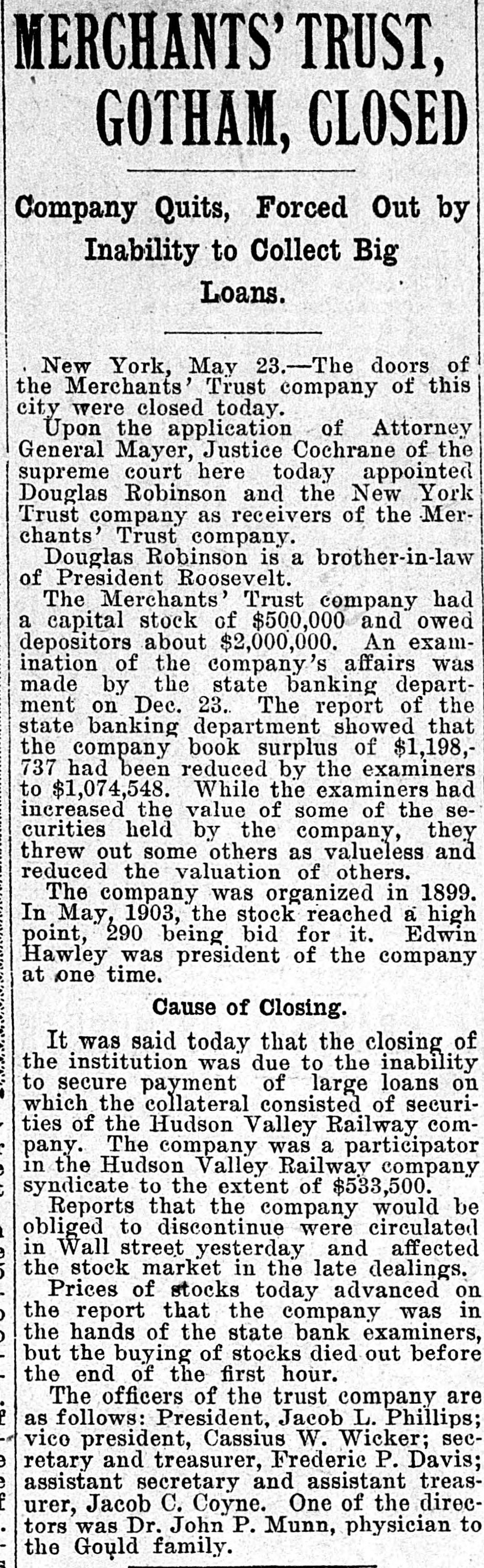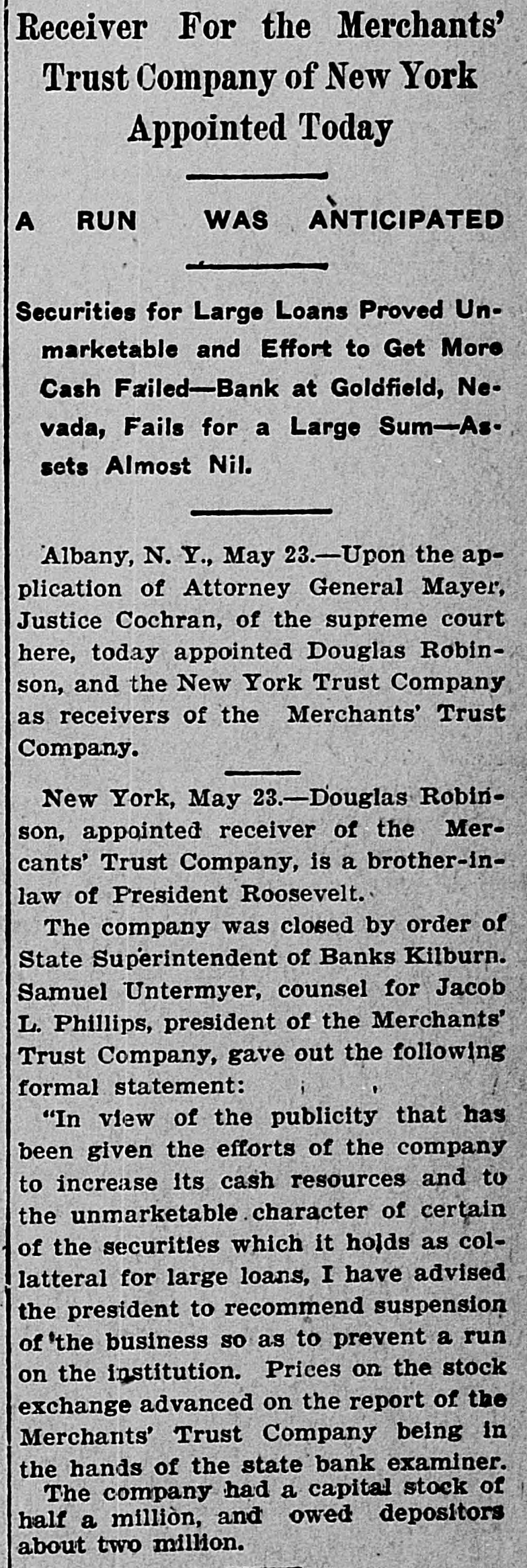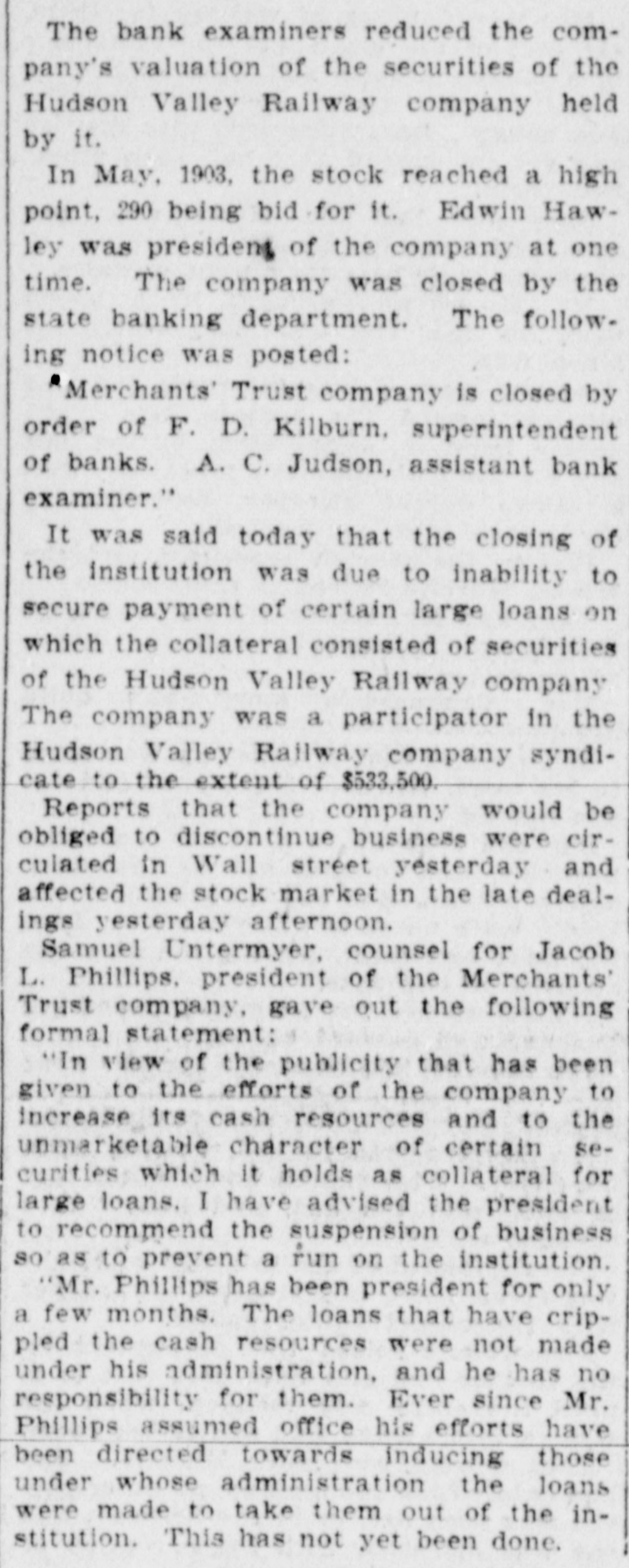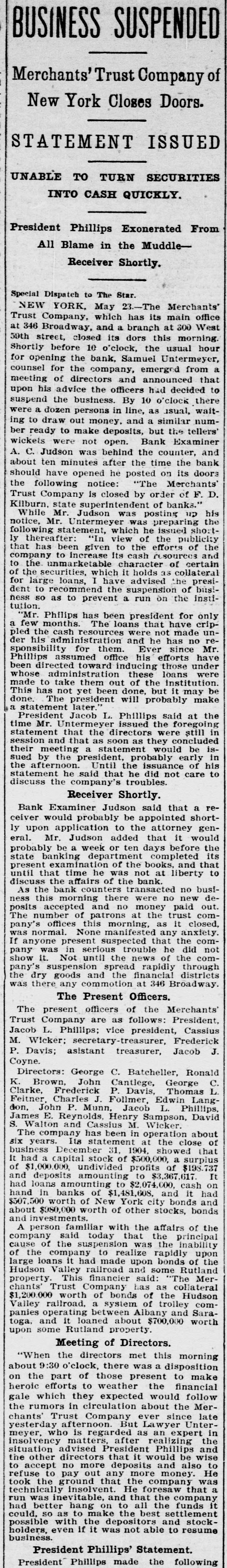 BUSINESS SUSPENDED Merchants' Trust Company of New York Closes Doors. STATEMENT ISSUED UNABLE TO TURN SECURITIES INTO CASH QUICKLY. President Phillips Exonerated From All Blame in the MuddleReceiver Shortly. Special Dispatch to The Star. NEW YORK, May 23.-The Merchants' Trust Company, which has its main office at 346 Broadway, and a branch at 300 West 59th street, closed its dors this morning. Shortly before 10 o'clock, the usual hour for opening the bank, Samuel Untermeyer, counsel for the company, emerged from a meeting of directors and announced that upon his advice the officers had decided to suspend the business. By 10 o'clock there were a dozen persons in line, as usual, waiting to draw out money, and a similar number ready to make deposits, but the tellers' wickets were not open. Bank Examiner A. C. Judson was behind the counter, and about ten minutes after the time the bank should have opened he posted on its doors the following notice: "The Merchants' Trust Company is closed by order of F. D. Kilburn. state superintendent of banks." While Mr. Judson was posting up his notice, Mr. Untermeyer was preparing the following statement, which he issued shortly thereafter: "In view of the publicity that has been given to the efforts of the company to increase Its cash resources and to the unmarketable character of certain of the securities, which it holds as collateral for large loans, I have advised the president to recommend the suspension of business so as to prevent a run on the institution. "Mr. Philips has been president for only a few months. The loans that have crippled the cash resources were not made under his administration and he has no responsibility for them. Ever since Mr. Phillips assumed office his efforts have been directed toward inducing those under whose administration these loans were made to take them out of the institution. This has not yet been done, but it may be done. The president will probably make a statement later." President Jacob L. Phillips said at the time Mr. Untermeyer issued the foregoing statement that the directors were still in session and that as soon as they concluded their meeting a statement would be issued by the president, probably early in the afternoon. Until the issuance of his statement he said that he did not care to discuss the company's troubles. Receiver Shortly. Bank Examiner Judson said that a receiver would probably be appointed shortly upon application to the attorney general. Mr. Judson added that it would probably be a week or ten days before the state banking department completed its present examination of the books, and that until that time he was not at liberty to discuss the affairs of the bank. As the bank counters transacted no business this morning there were no new deposits accepted and no money paid out. The number of patrons at the trust company's offices this morning, as It closed, was normal. None manifested any anxiety. If anyone present suspected that the company was in serious trouble he did not show it. Not until the news of the company's suspension spread rapidly through the dry goods and the financial districts was there any commotion at 346 Broadway. The Present Officers. The present officers of the Merchants' Trust Company are as follows: President, Jacob L. Phillips; vice president, Cassius M. Wicker; secretary-treasurer, Frederick P. Davis; asistant treasurer, Jacob J. Coyne. Directors: George C. Batcheller, Ronald K. Brown, John Cantlege, George C. Clarke, Frederick P. Davis, Thomas L. Feitner, Charles J. Follmer, Edwin Langdon, John P. Munn, Jacob L. Phillips, James E. Reynolds, Henry Sampson, David S. Walton and Cassius M. Wicker. The company has been in operation about six years. Its statement at the close of business December 31, 1904. showed that It had a capital stock of $500,000, a surplus of $1,000,000, undivided profits of $198.737 and deposits amounting to $3,367,617. It had loans amounting to $2,074,000, cash on hand in banks of $1,481,608, and it had $507,500 worth of New York city bonds and about $980,000 worth of other stocks, bonds and investments. A person familiar with the affairs of the company said today that the principal cause of the suspension was the inability of the company to realize rapidly upon large loans it had made upon bonds of the Hudson Valley railroad and some Rutland property. This financier said: "The Merchants' Trust Company has as collateral $1,200.000 worth of bonds of the Hudson Valley railroad, a system of trolley companies operating between Albany and Saratoga, and it loaned about $700,000 worth upon some Rutland property. Meeting of Directors. "When the directors met this morning about 9:30 o'clock, there was a disposition on the part of those present to make heroic efforts to weather the financial gale which they expected would follow the rumors in circulation about the Merchants' Trust Company ever since late
