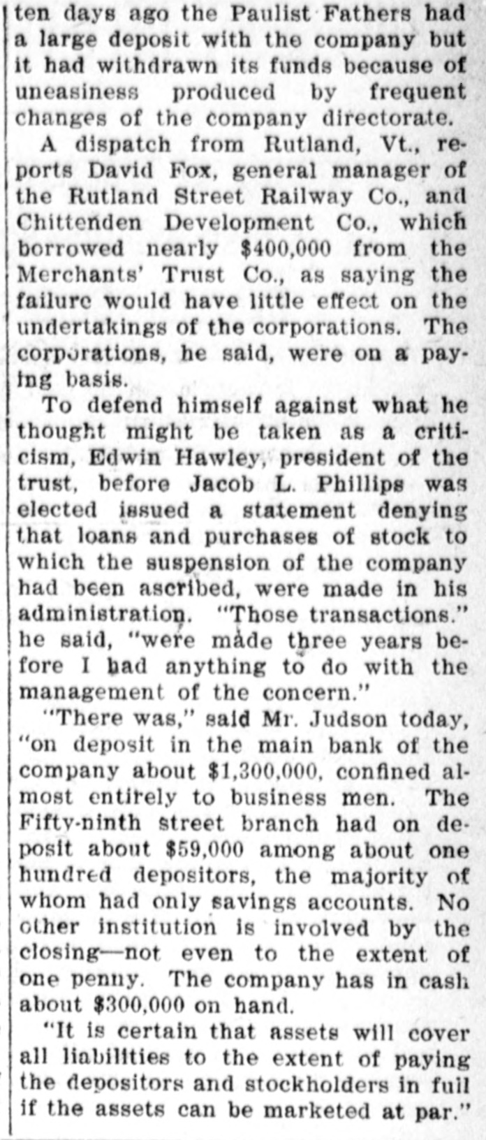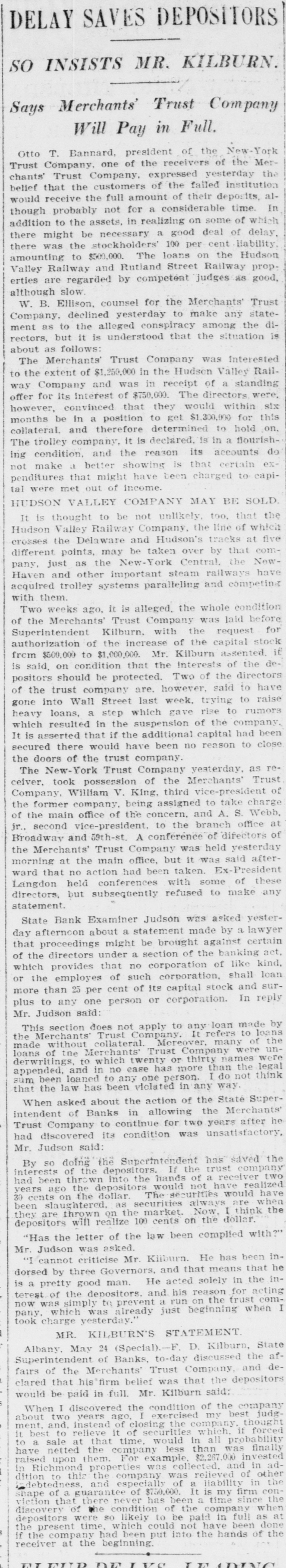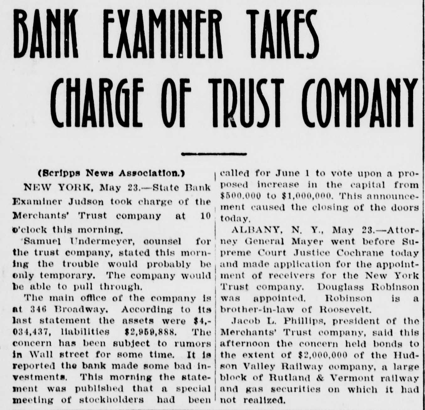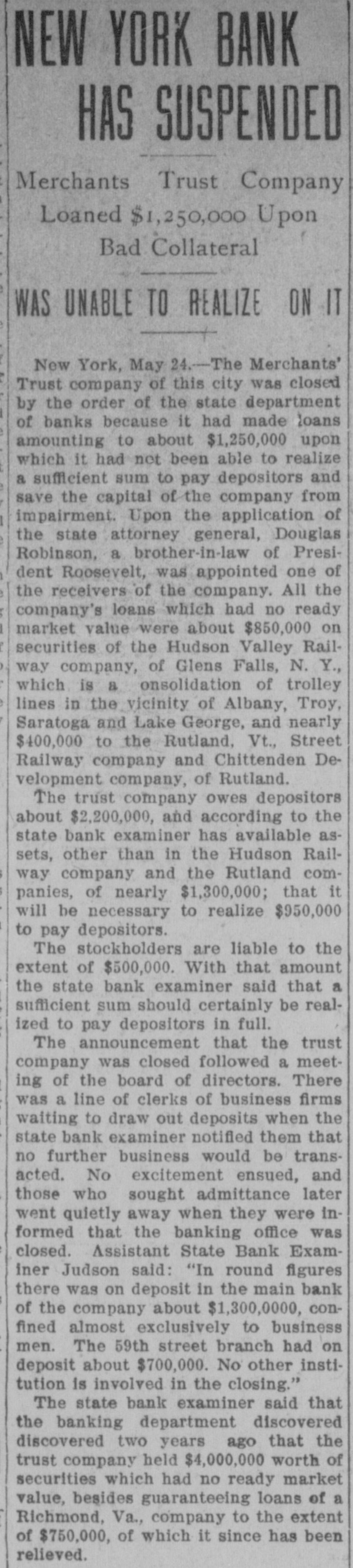 BUSINESS SUSPENDED Merchants' Trust Company of New York Closes Doors. STATEMENT ISSUED UNABLE TO TURN SECURITIES INTO CASH QUICKLY. President Phillips Exonerated From All Blame in the MuddleReceiver Shortly. Special Dispatch to The Star. NEW YORK, May 23.-The Merchants' Trust Company, which has its main office at 346 Broadway, and a branch at 300 West 59th street, closed its dors this morning. Shortly before 10 o'clock, the usual hour for opening the bank, Samuel Untermeyer, counsel for the company, emerged from a meeting of directors and announced that upon his advice the officers had decided to suspend the business. By 10 o'clock there were a dozen persons in line, as usual, waiting to draw out money, and a similar number ready to make deposits, but the tellers' wickets were not open. Bank Examiner A. C. Judson was behind the counter, and about ten minutes after the time the bank should have opened he posted on its doors the following notice: "The Merchants' Trust Company is closed by order of F. D. Kilburn. state superintendent of banks." While Mr. Judson was posting up his notice, Mr. Untermeyer was preparing the following statement, which he issued shortly thereafter: "In view of the publicity that has been given to the efforts of the company to increase Its cash resources and to the unmarketable character of certain of the securities, which it holds as collateral for large loans, I have advised the president to recommend the suspension of business so as to prevent a run on the institution. "Mr. Philips has been president for only a few months. The loans that have crippled the cash resources were not made under his administration and he has no responsibility for them. Ever since Mr. Phillips assumed office his efforts have been directed toward inducing those under whose administration these loans were made to take them out of the institution. This has not yet been done, but it may be done. The president will probably make a statement later." President Jacob L. Phillips said at the time Mr. Untermeyer issued the foregoing statement that the directors were still in session and that as soon as they concluded their meeting a statement would be issued by the president, probably early in the afternoon. Until the issuance of his statement he said that he did not care to discuss the company's troubles. Receiver Shortly. Bank Examiner Judson said that a receiver would probably be appointed shortly upon application to the attorney general. Mr. Judson added that it would probably be a week or ten days before the state banking department completed its present examination of the books, and that until that time he was not at liberty to discuss the affairs of the bank. As the bank counters transacted no business this morning there were no new deposits accepted and no money paid out. The number of patrons at the trust company's offices this morning, as It closed, was normal. None manifested any anxiety. If anyone present suspected that the company was in serious trouble he did not show it. Not until the news of the company's suspension spread rapidly through the dry goods and the financial districts was there any commotion at 346 Broadway. The Present Officers. The present officers of the Merchants' Trust Company are as follows: President, Jacob L. Phillips; vice president, Cassius M. Wicker; secretary-treasurer, Frederick P. Davis; asistant treasurer, Jacob J. Coyne. Directors: George C. Batcheller, Ronald K. Brown, John Cantlege, George C. Clarke, Frederick P. Davis, Thomas L. Feitner, Charles J. Follmer, Edwin Langdon, John P. Munn, Jacob L. Phillips, James E. Reynolds, Henry Sampson, David S. Walton and Cassius M. Wicker. The company has been in operation about six years. Its statement at the close of business December 31, 1904. showed that It had a capital stock of $500,000, a surplus of $1,000,000, undivided profits of $198.737 and deposits amounting to $3,367,617. It had loans amounting to $2,074,000, cash on hand in banks of $1,481,608, and it had $507,500 worth of New York city bonds and about $980,000 worth of other stocks, bonds and investments. A person familiar with the affairs of the company said today that the principal cause of the suspension was the inability of the company to realize rapidly upon large loans it had made upon bonds of the Hudson Valley railroad and some Rutland property. This financier said: "The Merchants' Trust Company has as collateral $1,200.000 worth of bonds of the Hudson Valley railroad, a system of trolley companies operating between Albany and Saratoga, and it loaned about $700,000 worth upon some Rutland property. Meeting of Directors. "When the directors met this morning about 9:30 o'clock, there was a disposition on the part of those present to make heroic efforts to weather the financial gale which they expected would follow the rumors in circulation about the Merchants' Trust Company ever since late