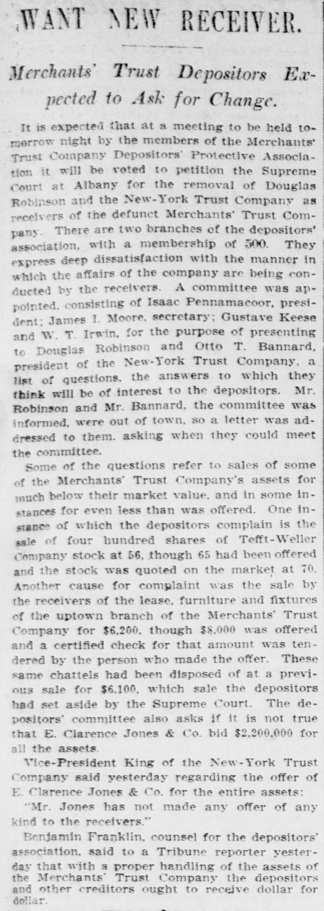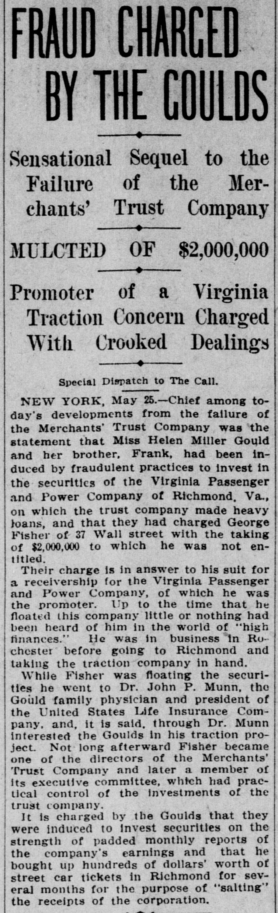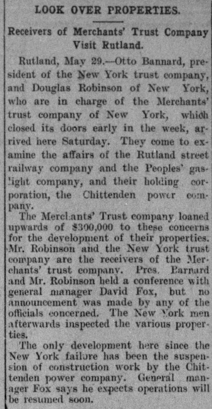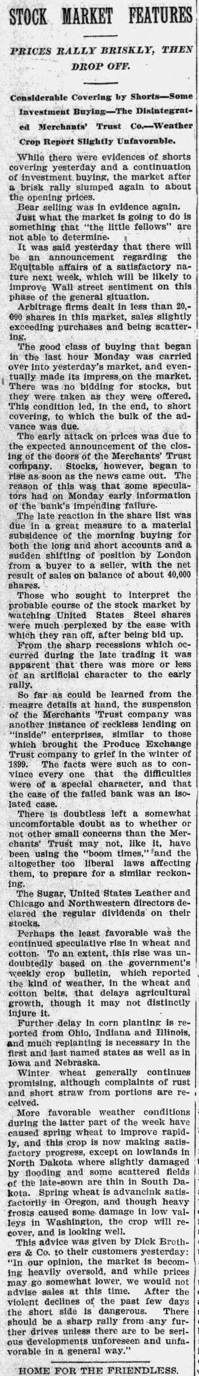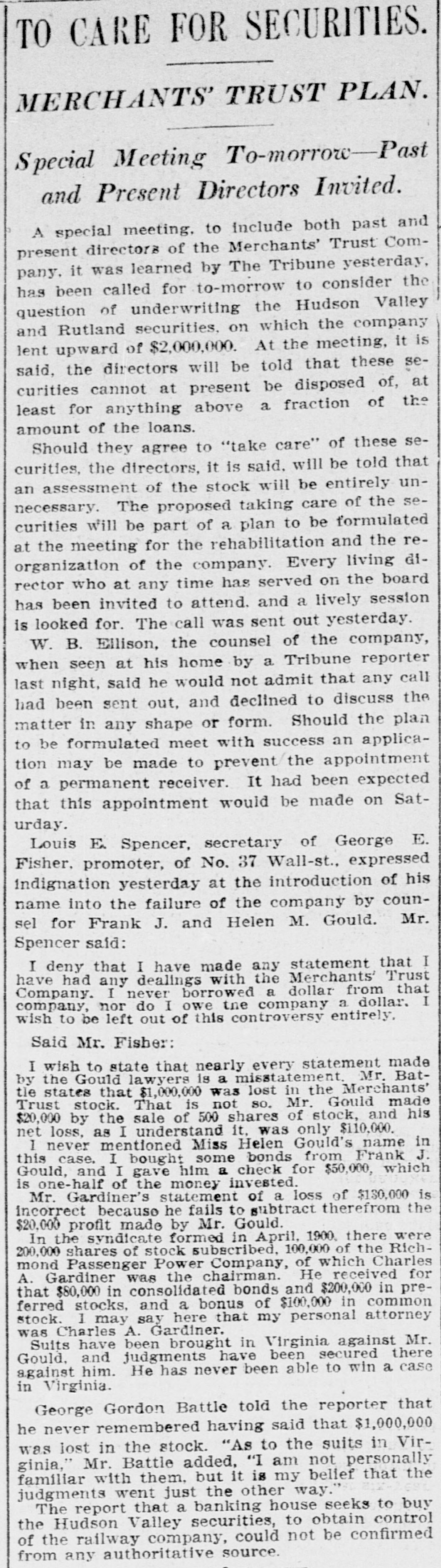 BUSINESS SUSPENDED Merchants' Trust Company of New York Closes Doors. STATEMENT ISSUED UNABLE TO TURN SECURITIES INTO CASH QUICKLY. President Phillips Exonerated From All Blame in the MuddleReceiver Shortly. Special Dispatch to The Star. NEW YORK, May 23.-The Merchants' Trust Company, which has its main office at 346 Broadway, and a branch at 300 West 59th street, closed its dors this morning. Shortly before 10 o'clock, the usual hour for opening the bank, Samuel Untermeyer, counsel for the company, emerged from a meeting of directors and announced that upon his advice the officers had decided to suspend the business. By 10 o'clock there were a dozen persons in line, as usual, waiting to draw out money, and a similar number ready to make deposits, but the tellers' wickets were not open. Bank Examiner A. C. Judson was behind the counter, and about ten minutes after the time the bank should have opened he posted on its doors the following notice: "The Merchants' Trust Company is closed by order of F. D. Kilburn. state superintendent of banks." While Mr. Judson was posting up his notice, Mr. Untermeyer was preparing the following statement, which he issued shortly thereafter: "In view of the publicity that has been given to the efforts of the company to increase Its cash resources and to the unmarketable character of certain of the securities, which it holds as collateral for large loans, I have advised the president to recommend the suspension of business so as to prevent a run on the institution. "Mr. Philips has been president for only a few months. The loans that have crippled the cash resources were not made under his administration and he has no responsibility for them. Ever since Mr. Phillips assumed office his efforts have been directed toward inducing those under whose administration these loans were made to take them out of the institution. This has not yet been done, but it may be done. The president will probably make a statement later." President Jacob L. Phillips said at the time Mr. Untermeyer issued the foregoing statement that the directors were still in session and that as soon as they concluded their meeting a statement would be issued by the president, probably early in the afternoon. Until the issuance of his statement he said that he did not care to discuss the company's troubles. Receiver Shortly. Bank Examiner Judson said that a receiver would probably be appointed shortly upon application to the attorney general. Mr. Judson added that it would probably be a week or ten days before the state banking department completed its present examination of the books, and that until that time he was not at liberty to discuss the affairs of the bank. As the bank counters transacted no business this morning there were no new deposits accepted and no money paid out. The number of patrons at the trust company's offices this morning, as It closed, was normal. None manifested any anxiety. If anyone present suspected that the company was in serious trouble he did not show it. Not until the news of the company's suspension spread rapidly through the dry goods and the financial districts was there any commotion at 346 Broadway. The Present Officers. The present officers of the Merchants' Trust Company are as follows: President, Jacob L. Phillips; vice president, Cassius M. Wicker; secretary-treasurer, Frederick P. Davis; asistant treasurer, Jacob J. Coyne. Directors: George C. Batcheller, Ronald K. Brown, John Cantlege, George C. Clarke, Frederick P. Davis, Thomas L. Feitner, Charles J. Follmer, Edwin Langdon, John P. Munn, Jacob L. Phillips, James E. Reynolds, Henry Sampson, David S. Walton and Cassius M. Wicker. The company has been in operation about six years. Its statement at the close of business December 31, 1904. showed that It had a capital stock of $500,000, a surplus of $1,000,000, undivided profits of $198.737 and deposits amounting to $3,367,617. It had loans amounting to $2,074,000, cash on hand in banks of $1,481,608, and it had $507,500 worth of New York city bonds and about $980,000 worth of other stocks, bonds and investments. A person familiar with the affairs of the company said today that the principal cause of the suspension was the inability of the company to realize rapidly upon large loans it had made upon bonds of the Hudson Valley railroad and some Rutland property. This financier said: "The Merchants' Trust Company has as collateral $1,200.000 worth of bonds of the Hudson Valley railroad, a system of trolley companies operating between Albany and Saratoga, and it loaned about $700,000 worth upon some Rutland property. Meeting of Directors. "When the directors met this morning about 9:30 o'clock, there was a disposition on the part of those present to make heroic efforts to weather the financial gale which they expected would follow the rumors in circulation about the Merchants' Trust Company ever since late