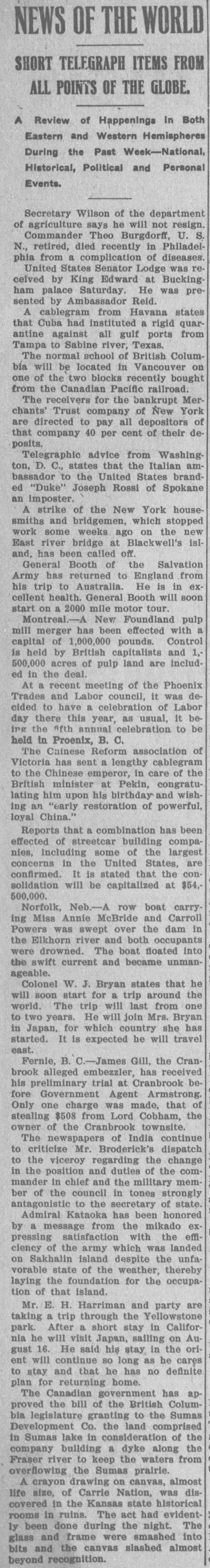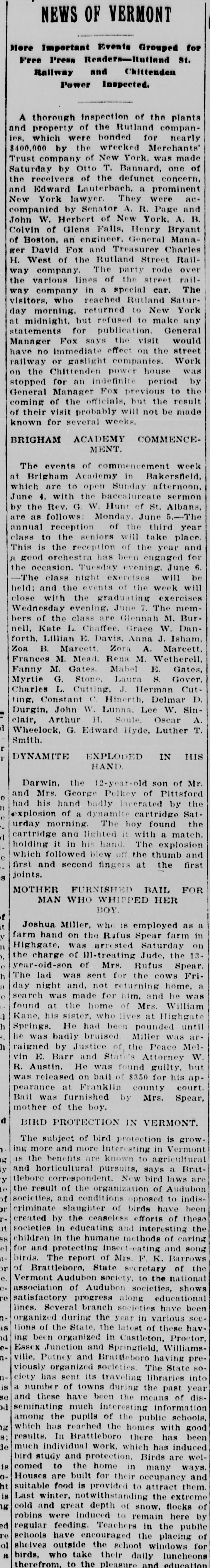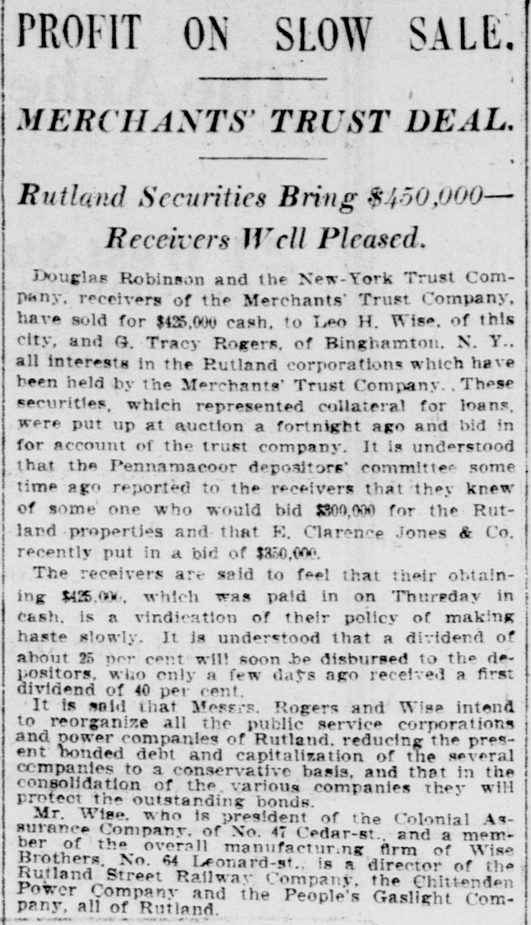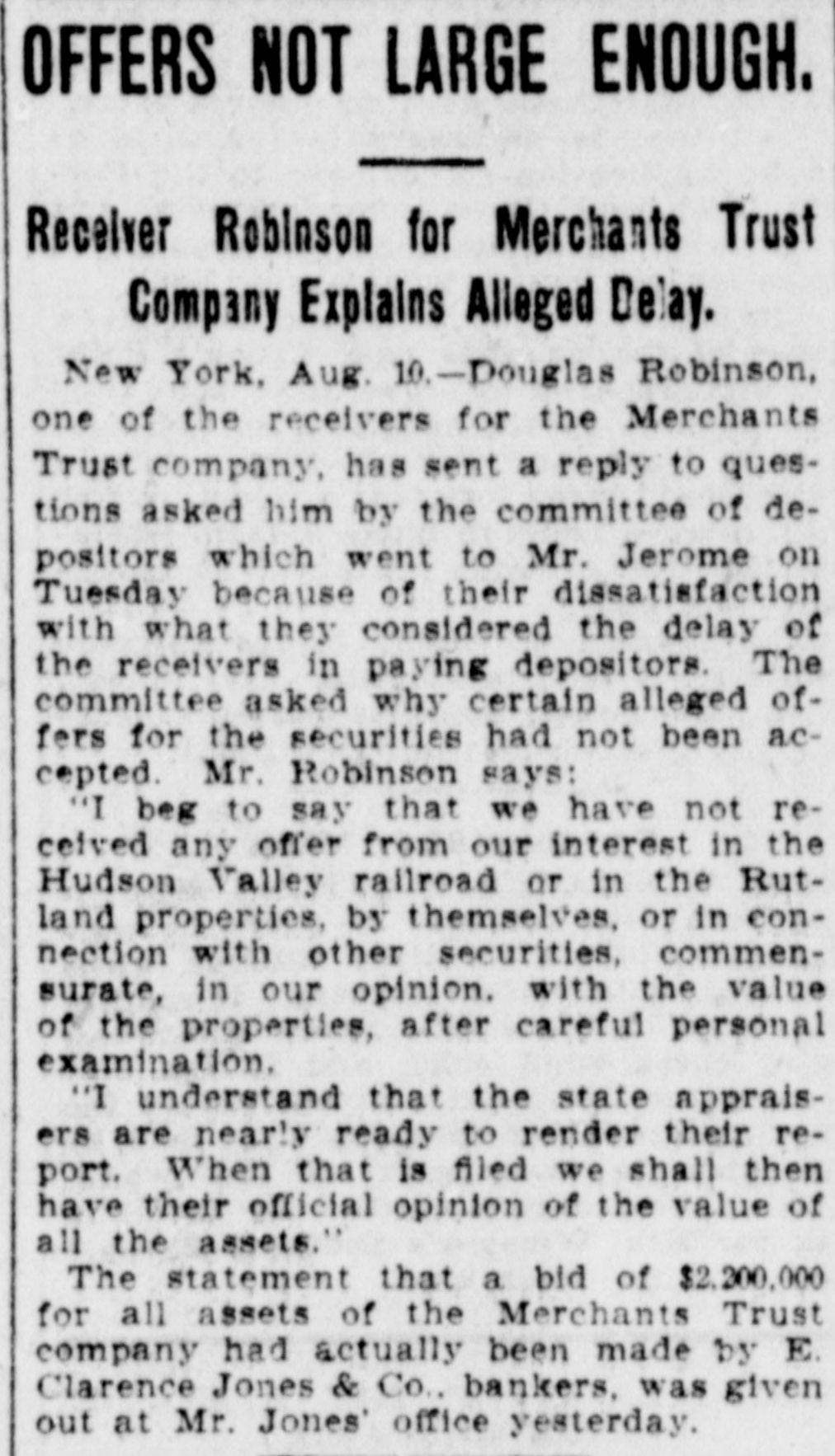 BUSINESS SUSPENDED Merchants' Trust Company of New York Closes Doors. STATEMENT ISSUED UNABLE TO TURN SECURITIES INTO CASH QUICKLY. President Phillips Exonerated From All Blame in the MuddleReceiver Shortly. Special Dispatch to The Star. NEW YORK, May 23.-The Merchants' Trust Company, which has its main office at 346 Broadway, and a branch at 300 West 59th street, closed its dors this morning. Shortly before 10 o'clock, the usual hour for opening the bank, Samuel Untermeyer, counsel for the company, emerged from a meeting of directors and announced that upon his advice the officers had decided to suspend the business. By 10 o'clock there were a dozen persons in line, as usual, waiting to draw out money, and a similar number ready to make deposits, but the tellers' wickets were not open. Bank Examiner A. C. Judson was behind the counter, and about ten minutes after the time the bank should have opened he posted on its doors the following notice: "The Merchants' Trust Company is closed by order of F. D. Kilburn. state superintendent of banks." While Mr. Judson was posting up his notice, Mr. Untermeyer was preparing the following statement, which he issued shortly thereafter: "In view of the publicity that has been given to the efforts of the company to increase Its cash resources and to the unmarketable character of certain of the securities, which it holds as collateral for large loans, I have advised the president to recommend the suspension of business so as to prevent a run on the institution. "Mr. Philips has been president for only a few months. The loans that have crippled the cash resources were not made under his administration and he has no responsibility for them. Ever since Mr. Phillips assumed office his efforts have been directed toward inducing those under whose administration these loans were made to take them out of the institution. This has not yet been done, but it may be done. The president will probably make a statement later." President Jacob L. Phillips said at the time Mr. Untermeyer issued the foregoing statement that the directors were still in session and that as soon as they concluded their meeting a statement would be issued by the president, probably early in the afternoon. Until the issuance of his statement he said that he did not care to discuss the company's troubles. Receiver Shortly. Bank Examiner Judson said that a receiver would probably be appointed shortly upon application to the attorney general. Mr. Judson added that it would probably be a week or ten days before the state banking department completed its present examination of the books, and that until that time he was not at liberty to discuss the affairs of the bank. As the bank counters transacted no business this morning there were no new deposits accepted and no money paid out. The number of patrons at the trust company's offices this morning, as It closed, was normal. None manifested any anxiety. If anyone present suspected that the company was in serious trouble he did not show it. Not until the news of the company's suspension spread rapidly through the dry goods and the financial districts was there any commotion at 346 Broadway. The Present Officers. The present officers of the Merchants' Trust Company are as follows: President, Jacob L. Phillips; vice president, Cassius M. Wicker; secretary-treasurer, Frederick P. Davis; asistant treasurer, Jacob J. Coyne. Directors: George C. Batcheller, Ronald K. Brown, John Cantlege, George C. Clarke, Frederick P. Davis, Thomas L. Feitner, Charles J. Follmer, Edwin Langdon, John P. Munn, Jacob L. Phillips, James E. Reynolds, Henry Sampson, David S. Walton and Cassius M. Wicker. The company has been in operation about six years. Its statement at the close of business December 31, 1904. showed that It had a capital stock of $500,000, a surplus of $1,000,000, undivided profits of $198.737 and deposits amounting to $3,367,617. It had loans amounting to $2,074,000, cash on hand in banks of $1,481,608, and it had $507,500 worth of New York city bonds and about $980,000 worth of other stocks, bonds and investments. A person familiar with the affairs of the company said today that the principal cause of the suspension was the inability of the company to realize rapidly upon large loans it had made upon bonds of the Hudson Valley railroad and some Rutland property. This financier said: "The Merchants' Trust Company has as collateral $1,200.000 worth of bonds of the Hudson Valley railroad, a system of trolley companies operating between Albany and Saratoga, and it loaned about $700,000 worth upon some Rutland property. Meeting of Directors. "When the directors met this morning about 9:30 o'clock, there was a disposition on the part of those present to make heroic efforts to weather the financial gale which they expected would follow the rumors in circulation about the Merchants' Trust Company ever since late