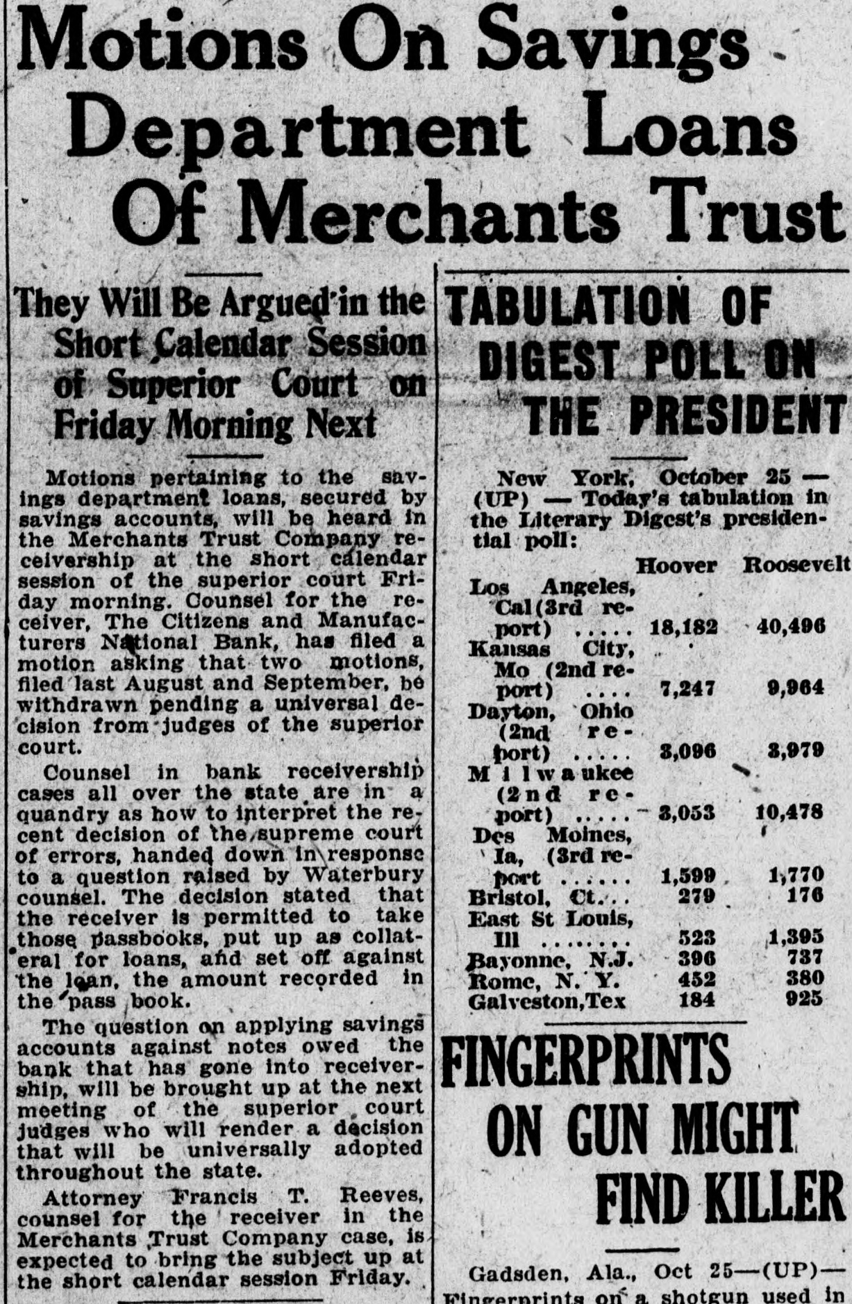 Motions On Savings Department Loans Of Merchants Trust They Will Be Argued in the TABULATION OF Short Calendar Session DIGEST POLL ON of Superior Court on THE PRESIDENT Friday Morning Next New York, October 25 Motions pertaining to the savings department loans, secured by (UP) - Today's tabulation in savings accounts, will be heard in the Literary Digest's presidenthe Merchants Trust Company retial poll: ceivership at the short calendar Hoover Roosevelt session of the superior court FriLos Angeles, day morning. Counsel for the reCal (3rd receiver, The Citizens and Manufac40,496 18,182 port) turers National Bank, has filed a Kansas City, motion asking that two motions, Mo (2nd refiled last August and September, be 9,964 7,247 port) withdrawn pending a universal deDayton, Ohio cision from judges of the superior (2nd recourt. 3,979 3,096 port) Counsel in bank receivership Milw a ukee cases all over the state are in a (2nd re. 10,478 3,053 quandry as how to interpret the report) cent decision of the supreme court Des Moines, of errors, handed down in response Ia, (3rd re1,770 1,599 to a question raised by Waterbury port 176 279 counsel. The decision stated that Bristol. Ct the receiver is permitted to take East St Louis, 523 1,395 III those passbooks, put up as collat737 396 eral for loans, and set off against Bayonne, N.J. 380 452 the loan, the amount recorded in Rome, N. Y. 925 184 the pass book. Galveston, Tex The question on applying savings accounts against notes owed the bank that has gone into receiverFINGERPRINTS ship, will be brought up at the next meeting of the superior court judges who will render a decision ON GUN MIGHT that will be universally adopted throughout the state. Attorney Francis T. Reeves, FIND KILLER counsel for the receiver in the Merchants Trust Company case, is expected to bring the subject up at Gadsden, Ala., Oct 25 5-(UP)- the short calendar session Friday. Wingernrints on a shotgun used in