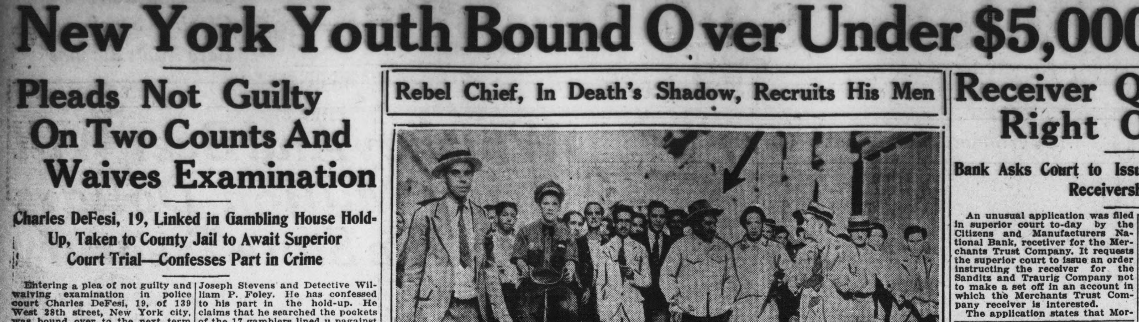 New York Youth Bound O ver Under $5, 000 Rebel Chief, In Death's Shadow, Recruits His Men Receiver Q Pleads Not Guilty a Right On Two Counts And Bank Asks Court to Issu Waives Examination Receiversh An unusual application was filed Charles DeFesi, 19, Linked in Gambling House Holdin superior court to-day by the Citizens and Manufacturers National Bank, recetiver for the MerUp, Taken to County Jail to Await Superior chants Trust Company. It requests the superior court to issue an order Court Trial-Confesses Part in Crime instructing the receiver for the Sanditz and Traurig Company not to make a set off in an account in Joseph Stevens and Detective WilEntering a plea of not guilty and liam P. Foley. He has confessed which the Merchants Trust Comwaiving examination in police court Charles DeFesi, 19, of 139 to his part in the hold-up. He pany receiver is interested. claims that he searched the pockets West 28th street, New York city, The application states that Mornovt of the 17 lined " nagainat form bound