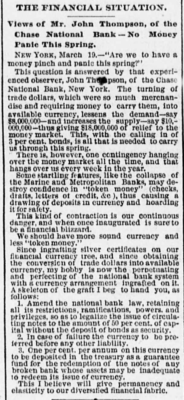 Views of Mr. John Thompson, of the Chase National Bank - No Money Panic This Spring.