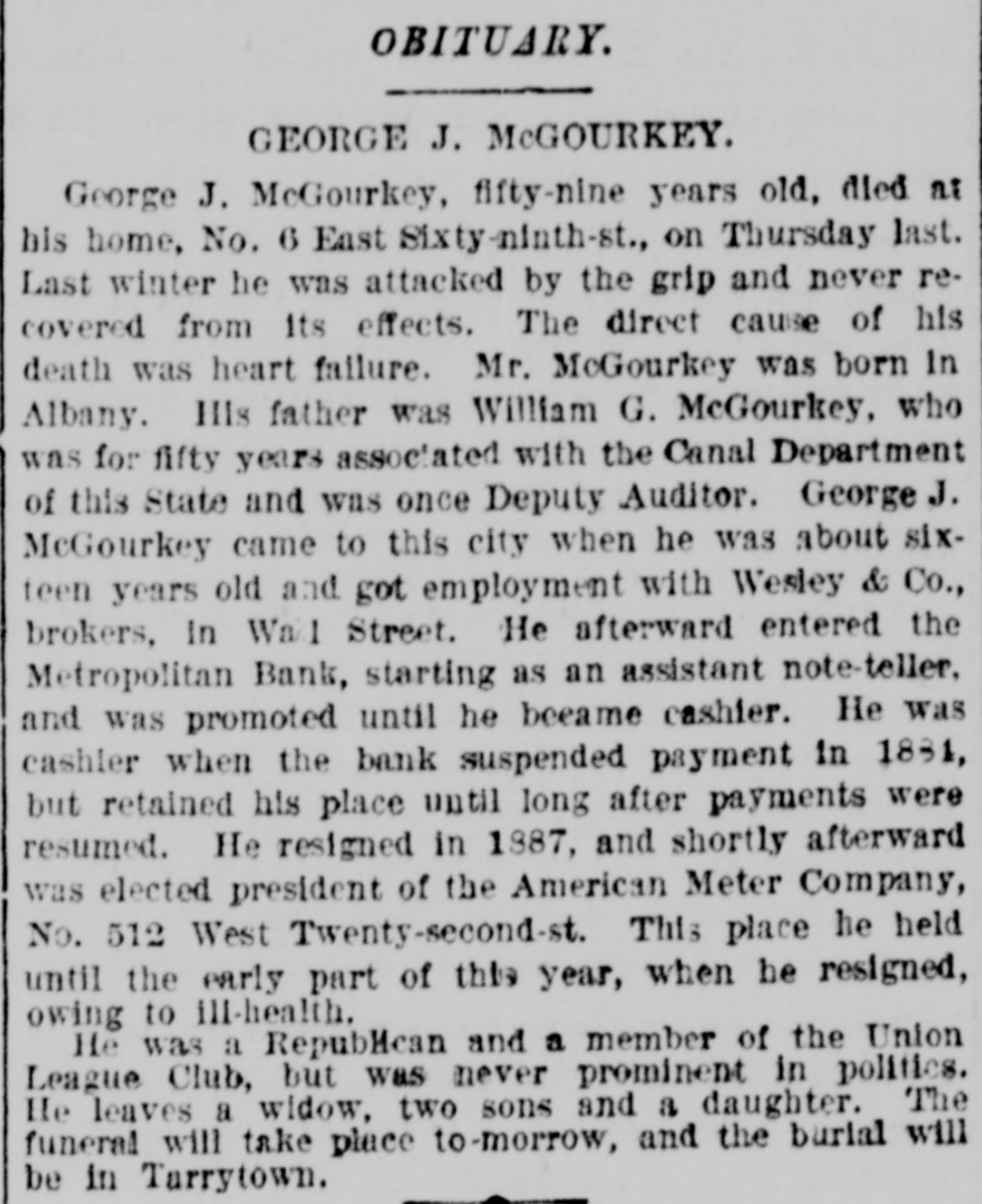 OBITUARY. GEORGE J. McGOURKEY. George J. McGourkey, fifty-nine years old, died at his home, No. 6 East Sixty-ninth-st., on Thursday last. Last winter he was attacked by the grip and never recovered from its effects. The direct cause of his death was heart failure. Mr. McGourkey was born In Albany. His father was William G. McGourkey, who was for fifty years associated with the Canal Department of this State and was once Deputy Auditor. George J. McGourkey came to this city when he was about sixteen years old and got employment with Wesley & Co., brokers, in Wall Street. He afterward entered the Metropolitan Bank, starting as an assistant note-teller. and was promoted until he became cashier. He was cashier when the bank suspended payment in 1881, but retained his place until long after payments were resumed. He resigned in 1887, and shortly afterward was elected president of the American Meter Company, No. 512 West Twenty-second-st. This place he held until the early part of this year, when he resigned, owing to ill-health. He was a RepubMcan and a member of the Union League Club, but was never prominent in politics. He leaves a widow, two sons and a daughter. The funeral will take place to-morrow, and the burial will be in Tarrytown.