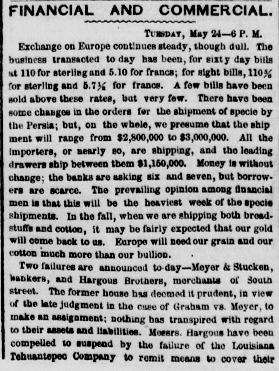 FINANCIAL AND COMMERCIAL. TUESDAY, May 24-6 P. M. Exchange on Europe continues steady, though dull. The business transacted to day has been, for sixty day bills at 110 for sterling and 5.10 for francs; for sight bills, 110% for sterling and 5.736 for francs. A few bills have been sold above these rates, but very few. There have been some changes in the orders for the shipment of specie by the Persia; but, on the whele, we presume that the ship ment will range from $2,800,000 to $3,000,000. All the importers, or nearly so, are shipping, and the leading drawers ship between them $1,150,000. Money is without change; the banks are asking six and seven, but borrowers are scarce. The prevailing opinion among financial men is that this will be the heaviest week of the specie shipments. In the fall, when we are shipping both breadstuffs and cotton, it may be fairly expected that our gold will come back to us. Europe will need our grain and our cotton much more than our bullion. Two failures are announced to-day-Meyer & Stucken, bankers, and Hargous Brothers, merchants of South street. The former house has deemed it prudent, in view of the late judgment in the case of Graham VB. Meyer, to make an assignment; nothing has transpired with regard to their assets and liabilities. Messrs. Hargous have been compelled to suspend by the failure of the Louisiana Tehuantepec Company to remit means to cover their