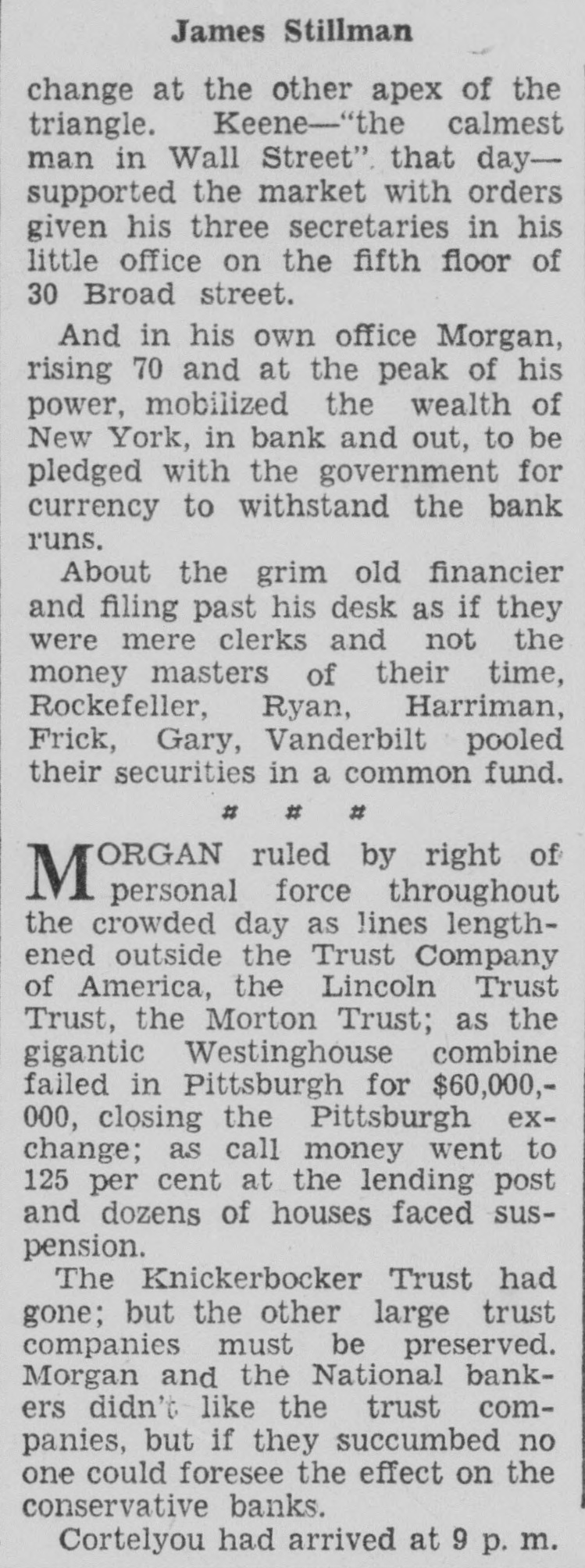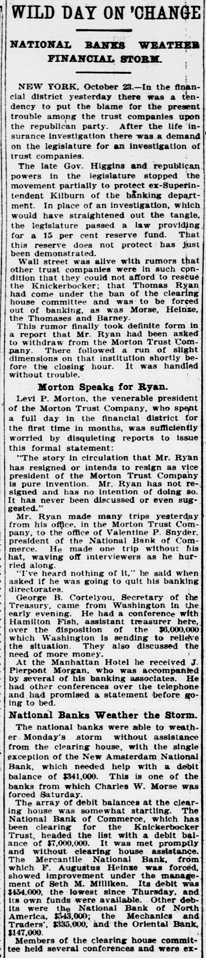 WILD DAY ON 'CHANGE NATIONAL BANKS WEATHER FINANCIAL STORM. NEW YORK, October 23.-In the financial district yesterday there was a tendency to put the blame for the present trouble among the trust companies upon the republican party. After the life insurance investigation there was a demand on the legislature for an investigation of trust companies. The late Gov. Higgins and republican powers in the legislature stopped the movement partially to protect ex-Superintendent Kilburn of the banking department. In place of an investigation, which would have straightened out the tangle, the legislature passed a law providing for a 15 per cent reserve fund. That this reserve does not protect has just been demonstrated. Wall street was alive with rumors that other trust companies were in such condition that they could not afford to rescue the Knickerbocker: that Thomas Ryan had come under the ban of the clearing house committee and was to be forced out of banking, as was Morse, Heinze, the Thomases and Barney. This rumor finally took definite form in a report that Mr. Ryan had been asked to withdraw from the Morton Trust Company. There followed a run of slight dimensions on that institution shortly before the closing hour. It was handled without trouble. Morton Speaks for Ryan. Levi P. Morton, the venerable president of the Morton Trust Company, who spent a full day in the financial district for the first time in months, was sufficiently worried by disquieting reports to issue this formal statement: "The story in circulation that Mr. Ryan has resigned or intends to resign as vice president of the Morton Trust Company is pure invention. Mr. Ryan has not resigned and has no intention of doing so. It has never been discussed or even suggested." Mr. Ryan made many trips yesterday from his office, in the Morton Trust Company, to the office of Valentine P. Snyder, president of the National Bank of Commerce. He made one trip without his hat, waving off interviewers as he hurried along. "I've heard nothing of it," he said when asked if he was going to quit his banking directorates. George B. Cortelyou, Secretary of the Treasury, came from Washington in the early evening. He had a conference with Hamilton Fish, assistant treasurer here, over the disposition of the $6,000,000 which Washington is sending to relieve the situation. They also discussed the need of more money. At the Manhattan Hotel he received J. Pierpont Morgan, who was accompanied by several of his banking associates. He had other conferences over the telephone and had promised a statement before going to bed. National Banks Weather the Storm. The national banks were able to weather Monday's storm without assistance from the clearing house, with the single exception of the New Amsterdam National Bank, which needed help with a debit balance of $341,000. This is one of the banks from which Charles W. Morse was forced Saturday. The array of debit balances at the clearing house was somewhat startling. The National Bank of Commerce, which has been clearing for the Knickerbocker Trust, headed the list with a debit balance of $7,000,000. It was met promptly and without clearing house assistance. The Mercantile National Bank, from which F. Augustus Heinze was forced, showed improvement under the management of Seth M. Milliken. Its debit was $454,000, the lowest since Thursday, and its own funds were available. Other debits were the National Bank of North America, $543,000; the Mechanics and Traders', $335,000; and the Oriental Bank, $147,000. Members of the clearing house committee held several conferences and were ex-