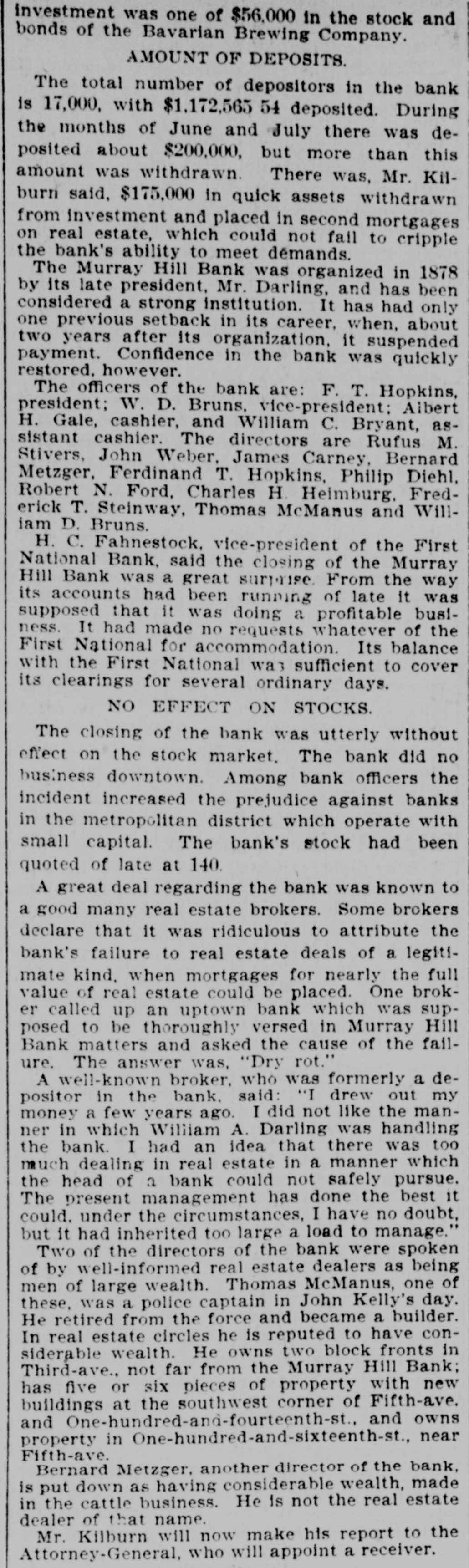 investment was one of $56,000 in the stock and bonds of the Bavarian Brewing Company. AMOUNT OF DEPOSITS. The total number of depositors in the bank is 17,000, with $1,172,565 54 deposited. During the months of June and July there was deposited about $200,000, but more than this amount was withdrawn. There was, Mr. Kilburn said, $175,000 in quick assets withdrawn from investment and placed in second mortgages on real estate, which could not fail to cripple the bank's ability to meet démands. The Murray Hill Bank was organized in 1878 by its late president, Mr. Darling, and has been considered a strong institution. It has had only one previous setback in its career, when, about two years after its organization, it suspended payment. Confidence in the bank was quickly restored, however. The officers of the bank are: F. T. Hopkins, president; W. D. Bruns, vice-president: Albert H. Gale, cashier, and William C. Bryant, assistant cashier. The directors are Rufus M. Stivers, John Weber, James Carney, Bernard Metzger, Ferdinand T. Hopkins, Philip Diehl, Robert N. Ford. Charles H. Heimburg, Frederick T. Steinway, Thomas McManus and William D. Bruns. H. C. Fahnestock, vice-president of the First National Bank, said the closing of the Murray Hill Bank was a great surprise From the way its accounts had been running of late it was supposed that it was doing a profitable business. It had made no requests whatever of the First National for accommodation. Its balance with the First National was sufficient to cover its clearings for several ordinary days. NO EFFECT ON STOCKS. The closing of the bank was utterly without effect on the stock market. The bank did no business downtown. Among bank officers the incident increased the prejudice against banks in the metropolitan district which operate with small capital. The bank's stock had been quoted of late at 140. A great deal regarding the bank was known to a good many real estate brokers. Some brokers declare that it was ridiculous to attribute the bank's failure to real estate deals of a legitimate kind. when mortgages for nearly the full value of real estate could be placed. One broker called up an uptown bank which was supposed to be thoroughly versed in Murray Hill Bank matters and asked the cause of the failure. The answer was, "Dry rot." A well-known broker. who was formerly a depositor in the bank. said: "I drew out my money a few years ago. I did not like the manner in which William A. Darling was handling the bank. I had an idea that there was too much dealing in real estate in a manner which the head of a bank could not safely pursue. The present management has done the best it could. under the circumstances, I have no doubt, but it had inherited too large a load to manage." Two of the directors of the bank were spoken of by well-informed real estate dealers as being men of large wealth. Thomas McManus, one of these, was a police captain in John Kelly's day. He retired from the force and became a builder. In real estate circles he is reputed to have considerable wealth. He owns two block fronts in Third-ave., not far from the Murray Hill Bank: has five or six pieces of property with new buildings at the southwest corner of Fifth-ave. and One-hundred-and-fourteenth-st., and owns property in One-hundred-and-sixteenth-st., near Fifth-ave. Bernard Metzger, another director of the bank, is put down as having considerable wealth, made in the cattle business. He is not the real estate dealer of that name. Mr. Kilburn will now make his report to the Attorney-General, who will appoint a receiver.