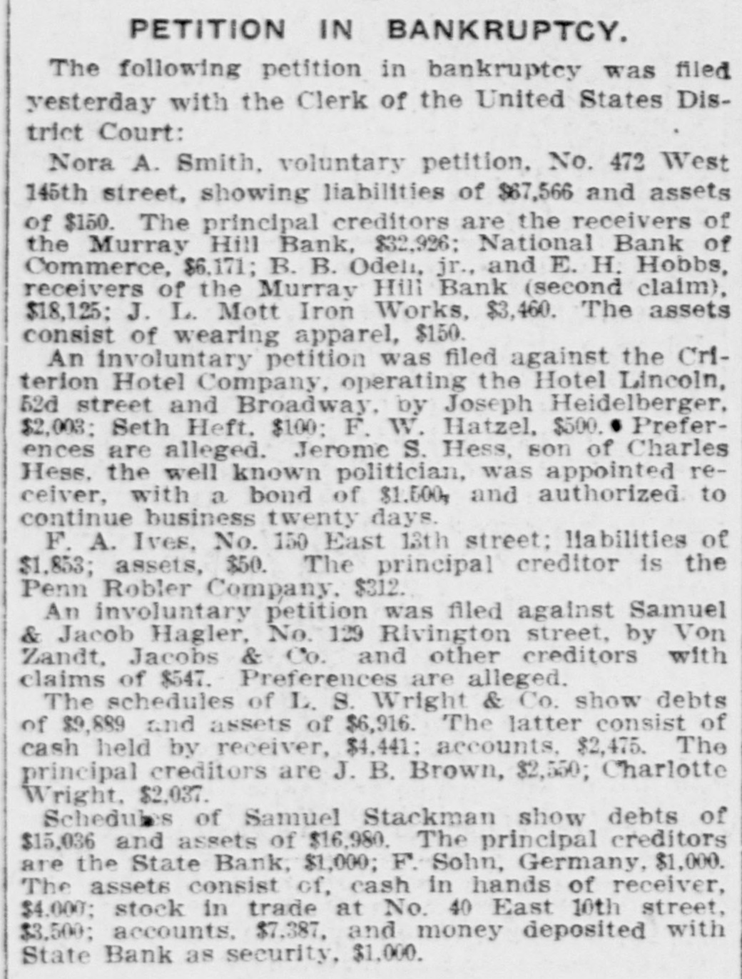 PETITION IN BANKRUPTCY. The following petition in bankruptcy was filed yesterday with the Clerk of the United States District Court: Nora A. Smith. voluntary petition. No. 472 West 145th street, showing liabilities of $67,566 and assets of $150. The principal creditors are the receivers of the Murray Hill Bank, $32,926; National Bank of Commerce, $6,171; B. B. Odeli, jr., and E. H. Hobbs, receivers of the Murray Hill Bank (second claim), $18,125: J. L. Mott Iron Works, $3,460. The assets consist of wearing apparel, $150. An involuntary petition was filed against the Criterion Hotel Company, operating the Hotel Lincoln, 52d street and Broadway, by Joseph Heidelberger, $2,003: Seth Heft. $100: F. W. Hatzel, $500. Preferences are alleged. Jerome S. Hess, son of Charles Hess. the well known politician, was appointed receiver, with a bond of $1.500, and authorized to continue business twenty days. F. A. Ives, No. 150 East 13th street: liabilities of $1,853; assets, $50. The principal creditor is the Penn Robler Company. $312. An involuntary petition was filed against Samuel & Jacob Hagler, No. 129 Rivington street, by Von Zandt, Jacobs & Co. and other creditors with claims of $547. Preferences are alleged. The schedules of L. S. Wright & Co. show debts of $9,889 and assets of $6,916. The latter consist of cash held by receiver, $4.441: accounts. $2,475. The principal creditors are J. B. Brown, $2,550; Charlotte Wright. $2,037. Schedules of Samuel Stackman show debts of $15,036 and assets of $16,980. The principal creditors are the State Bank, $1,000; F. Sohn, Germany, $1,000. The assets consist of, cash in hands of receiver, $4.000; stock in trade at No. 40 East 10th street, $3,500; accounts. $7,387. and money deposited with State Bank as security, $1,000.
