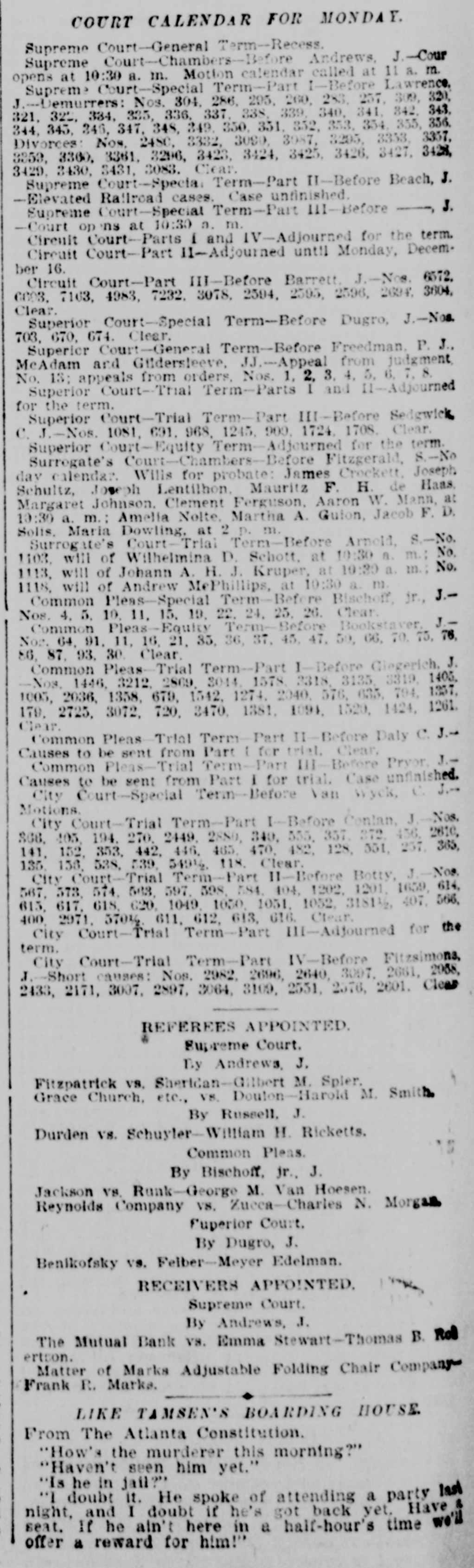 COURT CALENDAR FOR MONDAY. Supreme Court-General Term-Recess. Supreme Court-Chambers-Before Andrews, J.-Cour opens at 10:30 a. m. Motion calendar called at 11 a. m. Supreme Court-Special Term-Part I-Before Lawrence, J.-Demurrers: Nos. 304, 286, 295, 200, 253, 257, 309, 320, 321, 322, 334, 335, 336, 337, 338, 339, 340, 341, 342, 343, 344, 345, 346, 347, 348, 349, 350, 351, 352, 353, 354, 355, 356. Divorces: Nos. 2480, 3332, 3090, 3087, 3295, 3353, 3357, 3959, 3360, 3361, 3296, 3423, 3424, 3425, 3426, 3427, 3428, 3429, 3430, 3431, 3083. Clear. Supreme Court-Specia: Term-Part II-Before Beach, J. -Elevated Railroad cases, Case unfinished. Supreme Court-Special Term-Part 111-Before —, J. -Court opens at 10:30 a. m. Circuit Court-Parts I and IV-Adjourned for the term. Circuit Court-Part 11-Adjourned until Monday, Decem- ber 16. Circuit Court-Part III-Before Barrett, J.-Nos. 6572, 6003, 7163, 4983, 7232, 3078, 2594, 2595, 2596, 2604, 3604, Clear. Superior Court-Special Term-Before Dugro, J.-Nos. 703, 670, 674. Clear. Superior Court-General Term-Before Freedman, P. J., McAdam ard Gildersleeve, JJ.-Appeal from judgment, No. 13; appeals from orders, Nos. 1, 2, 3, 4, 5, 6, 7, 8. Superior Court--Trial Term-Parts I and II-Adjourned for the term. Superior Court-Trial Term Part III-Before Sedgwick C. J.-Nos. 1081, 691, 968, 1245, 900, 1724, 1708. Clear. Superior Court-Equity Term-Adjourned for the term. Surrogate's Court-Chambers-Before Fitzgerald, S.-No day calendar. Wills for probate: James Crockett, Joseph Schultz, Joseph Lentilhon, Mauritz F. H. de Haas, Margaret Johnson, Clement Ferguson, Aaron W. Mann, at 10:30 a. m.; Amelia Nolte, Martha A. Guion, Jacob F. D. Solis, Maria Dowling, at 2 p. m. Surrogate's Court-Triai Term-Before Arnold, S.-No. 1103, will of Wilhelmina D. Schott, at 10:30 a. m.; No. 1113, will of Johann A. H. J. Kruper, at 10:30 a. m.; No. 1118, will of Andrew McPhillips, at 10:30 a. m. Common Pleas Special Term-Before Bischoff, jr., J.- Nos. 4, 5, 10, 11, 15, 19, 22, 24, 25, 26. Clear. Common Pleas-Equity Term-Before Bookstaver, J.- Nor. 64, 91, 11, 16, 21, 35, 36, 37, 45, 47, 50, 66, 70, 75, 76, 86, 87, 93, 30. Clear. Common Pleas-Trial Term-Part I-Before Giegerich, J. -Nos. 1446, 3212, 2869, 3044, 1578, 3318, 3135, 3319, 1405. 1005, 2036, 1358, 679, 1542, 1274, 2040, 576, 635, 704, 1357, 170, 2725, 3072, 720, 3470, 1381, 1094, 1520, 1424, 1261. Clear. Common Pleas Trial Term-Part II-Before Daly C. J. Causes to be sent from Part I for trial, Clear. Common Pleas-Trial Term-Part III-Before Pryor. J.- Causes to be sent from Part I for trial. Case unfinished. City Court-Special Term-Before Van Wyck, C. J. Motions. City Court-Trial Term-Part I-Before Conlan, J.-Nos. 866, 105, 194, 270, 2449, 2880, 340, 555, 357, 372, 456, 2610, 141, 152, 353, 442, 446, 465, 470, 482, 128, 551, 257, 365, 135, 156, 538, 539, 549½, 118. Clear. City Court-Trial Term-Part II-Before Botty, J.-Nos. 567, 573, 574, 568, 597, 598, 584, 404, 1202, 1201, 1659, 614, 615, 617, 618, 620, 1049, 1050, 1051, 1052, 3181½, 407, 506, 400, 2971, 570½, 611, 612, 613, 616. Clear. City Court-Trial Term-Part III-Adjourned for the term. City Court-Trial Term-Part IV-Before Fitzsimons, J.-Short causes: Nos. 2982, 2696, 2640, 3007, 2661, 2668, 2433, 2171, 3007, 2897, 3064, 3109, 2551, 2576, 2601. Clear REFEREES APPOINTED. Supreme Court. By Andrews, J. Fitzpatrick vs. Sheridan-Gilbert M. Spier, Grace Church, etc., vs. Doulon-Harold M. Smith. By Russell, J. Durden vs. Schuyler-William H. Ricketts. Common Pleas. By Bischoff, jr., J. Jackson vs. Runk-George M. Van Hoesen. Reynolds Company vs. Zucca-Charles N. Morgan Fuperior Court. By Dugro, J. Benikofsky vs. Felber-Meyer Edelman. RECEIVERS APPOINTED. Supreme Court. By Andrews, J. The Mutual Bank vs. Emma Stewart-Thomas B. Rob- ertson. Matter of Marks Adjustable Folding Chair Company- Frank R. Marks. LIKE TAMSEN'S BOARDING HOUSE. From The Atlanta Constitution. "How's the murderer this morning?" "Haven't seen him yet." "Is he in jail?" "I doubt it. He spoke of attending a party last night, and I doubt if he's got back yet. Have a seat. If he ain't here in a half-hour's time we'll offer a reward for him!"