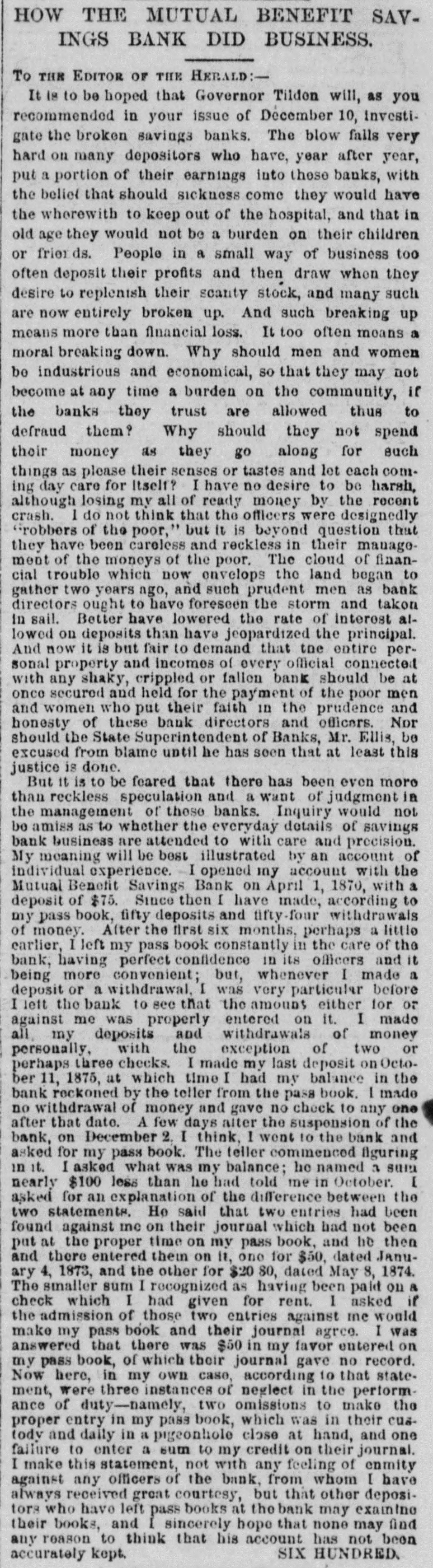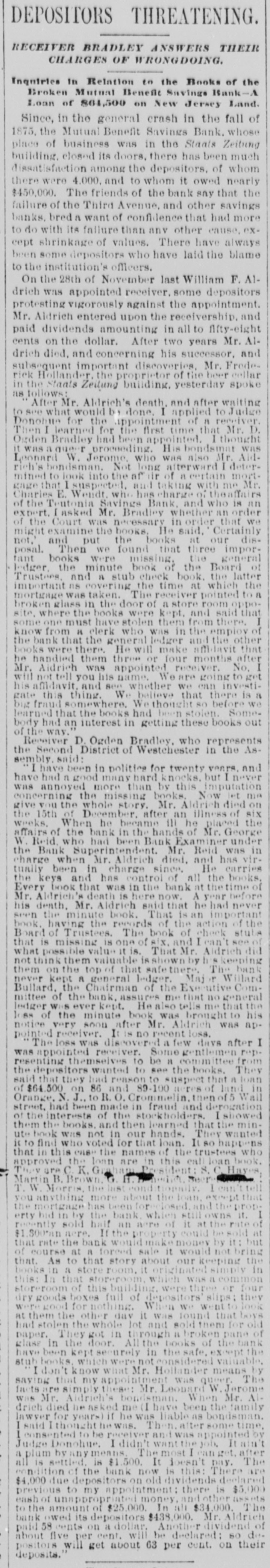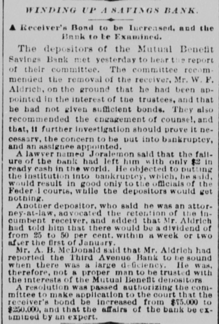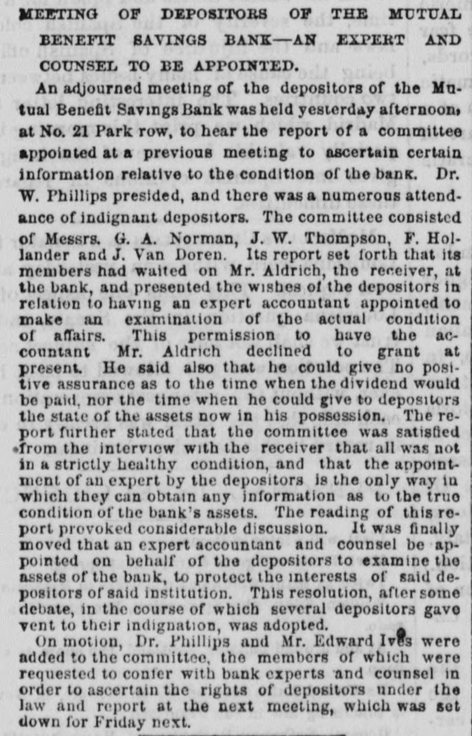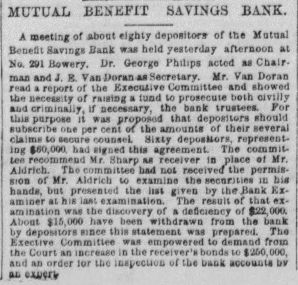 THE SAVINGS BANKS. sOLVENCY OF THE MECHANICS AND TRADERS' SAVINGS INSTITUTION - CLEAR SURPLUS OF $50,000-OTHER BANKS. A number of the depositors of the Mechantes and Traders' Savings Institution, at No. 283 Bowery, applied for their money yesterday. The banking rooms were crowded and the payments were made slowly, and after a careful examination and comparison of the pass-books with the ledger accounts of the bank. Some of the trustees were present endeavoring to reason with the frightened depositors, and to convince them of the solvency of the institution. To & reporter of THE TRIBUNE were shown the books and accounts of the bank, with a statement of the market value of the assets. A. T. Conklin, the President, and Henry C. Fisher, the Secretary, declared that the bank was perfectly safe, and could pay dollar for dollar of liabilities without any difficulty. Mr. Conklin stated that the bank wasexamined on April 1, 1874, by theState bank examiners, who reported a surplus of $82,333 18* The bank property was appraised by appraisers em. ployed by the Bank Department, and was put down to its lowest market value. The market value of the stocks, bonds, and other securities was obtained by the examiners after consultation with leading brokers in Wall-st. The annual report, Jan. 1,1875, said Mr. Conklin, was an honest and true statement of the bank's condition. It showed a large surplus over liabilities, and was in every particular corroot. A8 to the item of suspense account, bankruptcy claim, worth $20,000," that claim was well known by the trustees to be good beyond all question, and would yield, principal and interest, at least $25,000 in a few months. The lawsuit pending in relation to it was merely to determine which of two very rich men was liable to the bank for the full amount. The total market value of the stocks and bonds owned by the bank at the present time was largely in excess of the figures reported by the bank examiners. A profit of $20,000 had been made last year on the sale of Government securities a few days before the examination, which did not appear in the figures of the examiners. This sum alone met all the charges of salaries, taxes, and incidental expenses. Salaries had been reduced $5,000 last year, and a considerable reduction made in advertising, stationery, &c. In every way, Mr. Conklin continued. the bank had economized and sought to merit the confidence of its customers and the public. After deducting this suspense account of $20,000, and making due allowance for any unexpected shrinkage, the bank had a clear surplus of at least $50,000. The trustees had decided to enforce the 60 days' rule in extreme cases, but would pay small amounts and pressing claims without delay. This action had been taken in order to protect depositors in the payment of interest due them at the end of this month. Mr. Conklin said, in conclusion that there had been a want of harmony in the Board of Direction some time ago, and the attack on the bank might have originated from that cause. The Mutual Benefit and the Security Savings Banks continued open yesterday, without transacting any business. The Security, it is understood, will resume in two or three days. A receiver for the People's Savings Bank had not arrived at the bank yesterday afternoon, but it is not doubted that an appointment was made yesterday.