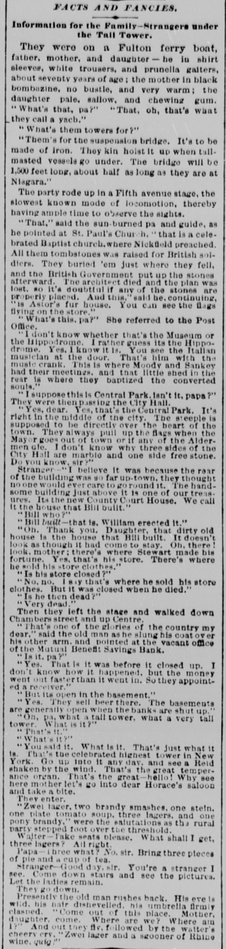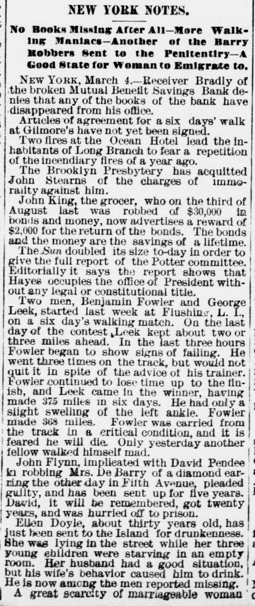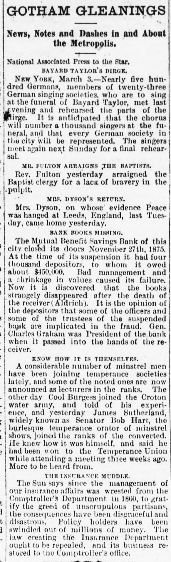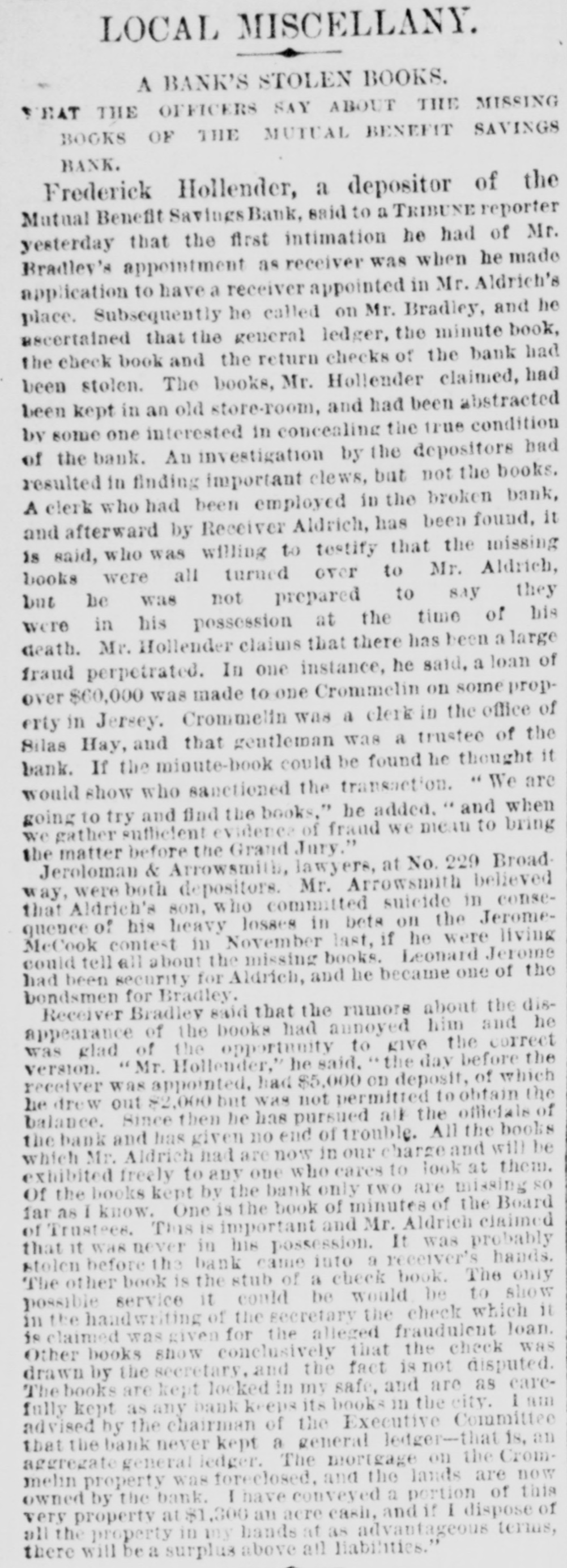 THE SAVINGS BANKS. sOLVENCY OF THE MECHANICS AND TRADERS' SAVINGS INSTITUTION - CLEAR SURPLUS OF $50,000-OTHER BANKS. A number of the depositors of the Mechantes and Traders' Savings Institution, at No. 283 Bowery, applied for their money yesterday. The banking rooms were crowded and the payments were made slowly, and after a careful examination and comparison of the pass-books with the ledger accounts of the bank. Some of the trustees were present endeavoring to reason with the frightened depositors, and to convince them of the solvency of the institution. To & reporter of THE TRIBUNE were shown the books and accounts of the bank, with a statement of the market value of the assets. A. T. Conklin, the President, and Henry C. Fisher, the Secretary, declared that the bank was perfectly safe, and could pay dollar for dollar of liabilities without any difficulty. Mr. Conklin stated that the bank wasexamined on April 1, 1874, by theState bank examiners, who reported a surplus of $82,333 18* The bank property was appraised by appraisers em. ployed by the Bank Department, and was put down to its lowest market value. The market value of the stocks, bonds, and other securities was obtained by the examiners after consultation with leading brokers in Wall-st. The annual report, Jan. 1,1875, said Mr. Conklin, was an honest and true statement of the bank's condition. It showed a large surplus over liabilities, and was in every particular corroot. A8 to the item of suspense account, bankruptcy claim, worth $20,000," that claim was well known by the trustees to be good beyond all question, and would yield, principal and interest, at least $25,000 in a few months. The lawsuit pending in relation to it was merely to determine which of two very rich men was liable to the bank for the full amount. The total market value of the stocks and bonds owned by the bank at the present time was largely in excess of the figures reported by the bank examiners. A profit of $20,000 had been made last year on the sale of Government securities a few days before the examination, which did not appear in the figures of the examiners. This sum alone met all the charges of salaries, taxes, and incidental expenses. Salaries had been reduced $5,000 last year, and a considerable reduction made in advertising, stationery, &c. In every way, Mr. Conklin continued. the bank had economized and sought to merit the confidence of its customers and the public. After deducting this suspense account of $20,000, and making due allowance for any unexpected shrinkage, the bank had a clear surplus of at least $50,000. The trustees had decided to enforce the 60 days' rule in extreme cases, but would pay small amounts and pressing claims without delay. This action had been taken in order to protect depositors in the payment of interest due them at the end of this month. Mr. Conklin said, in conclusion that there had been a want of harmony in the Board of Direction some time ago, and the attack on the bank might have originated from that cause. The Mutual Benefit and the Security Savings Banks continued open yesterday, without transacting any business. The Security, it is understood, will resume in two or three days. A receiver for the People's Savings Bank had not arrived at the bank yesterday afternoon, but it is not doubted that an appointment was made yesterday.