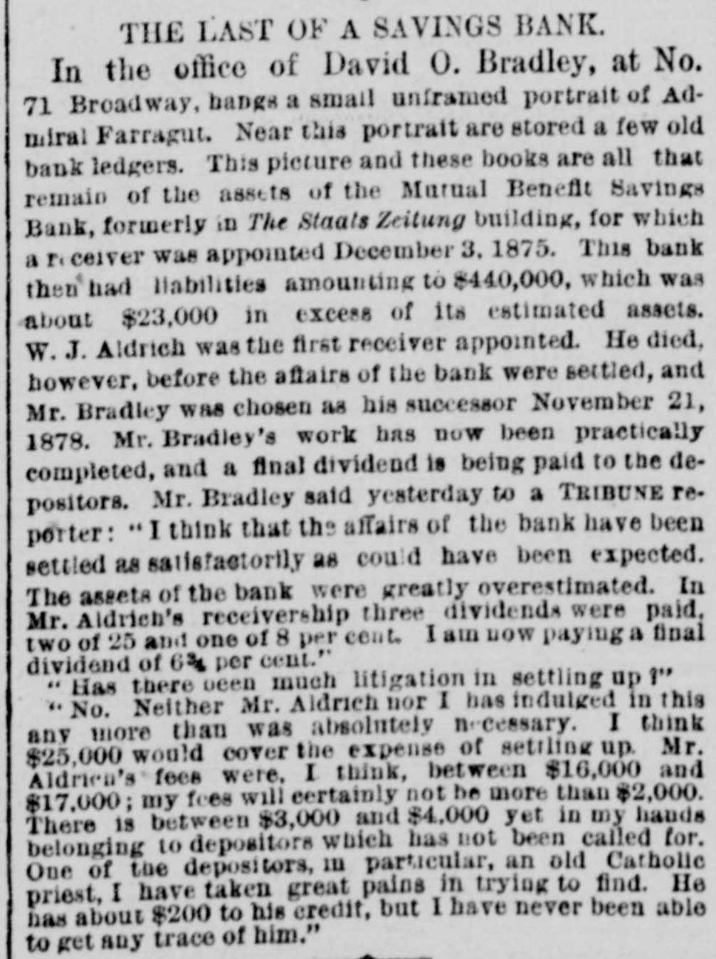 THE LAST OF A SAVINGS BANK. In the office of David O. Bradley, at No. 71 Broadway, bangs a small unframed portrait of Admiral Farragut. Near this portrait are stored a few old bank ledgers. This picture and these books are all that remain of the assets of the Mutual Benefit Savings Bank, formerly in The Staats Zeitung building, for which a ceiver was appointed December 3. 1875. This bank then had liabilities amounting to $440,000, which was about $23,000 in excess of its estimated assets. W. J. Aldrich was the first receiver appointed. He died, however, before the aftairs of the bank were settled, and Mr. Bradley was chosen as his successor November 21, 1878. Mr. Bradley's work has now been practically completed, and a final dividend is being paid to the depositors. Mr. Bradley said yesterday to a TRIBUNE reporter: I think that the affairs of the bank have been settled as satisfactorily as could have been expected. The assets of the bank were greatly overestimated. In Mr. Aldrich's receivership three dividends were paid, two of 25 and one of 8 per cent. I am now paying a final dividend of 6% per cent." " Has there been much litigation in settling up I" " No. Neither Mr. Aldrich nor I has indulged in this any more than was absolutely necessary. I think $25,000 would cover the expense of settling up. Mr. Aldrien's fees were, I think, between $16,000 and $17,000; my fees will certainly not be more than $2,000. There is between $3,000 and $4,000 yet in my hands belonging to depositors which has not been called for. One of the depositors, in particular, an old Catholic priest, I have taken great pains in trying to find. He has about $200 to his credit, but I have never been able to get any trace of him."