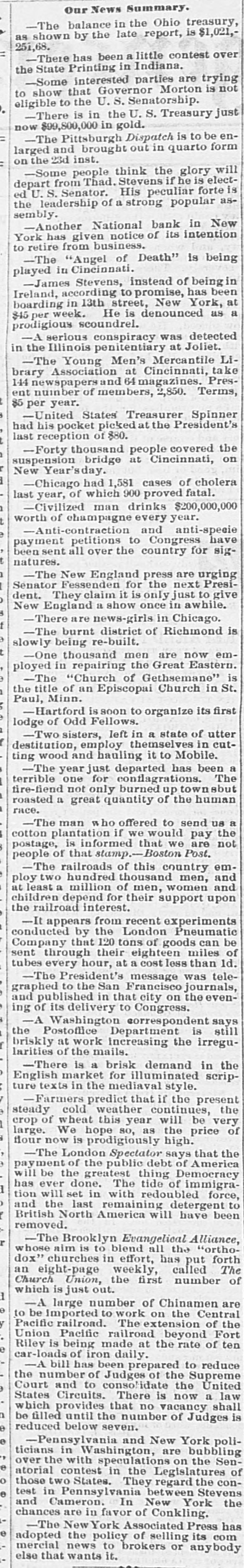 Our News Summary. balance in the Ohio treasury, as shown -The by the late report, is $1,021, 251,68. has been a little contest over There Printing in Indiana. the Some State interested Governor parties Morton are trying is not show that Senatorship. to to the U. S. . eligible There is in the U. S. Treasury just $99,800,000 in gold. now Pittsburgh Dispatch is to be form enlarged The and brought out in quarto = on 23d inst. the people think the he glory is elect- will Some Thad. Stevens if forte is depart from Senator. His peculiar popular asthe ed U.S. leadership of a strong in New sembly. -Another National of bank its intention York has given business. notice to retire -The from "Angel of Death" is being played in Cincinnati. Stevens, instead of has being been in James according to promise, at boarding He is in 13th street, New as a $45 per. Ireland, week. denounced York, prodigious scoundrel. serious conspiracy was Joliet. detected the A Illinois penitentiary at in Young Men's Mercantile take Library -The Association nd at 64 magazines. Cincinnati, Terms, Present 144 newspapers number of members, 2,850. $5 per year. States Treasurer President's Spinner had United his pocket picked at the t last reception of $80. the h thousand people covered on suspension r -Forty bridge at Cincinnati, New Year's day. a had 1,581 cases of fatal. cholera Chicago of which 900 proved a t last -Civilized year, man drinks year. $200,000,000 of champagne every worth -Anti-contraction and anti-specie have petitions to Congress for sigt beensent payment all over the country 1 natures. -The New England press the next are urging Presi) Senator They Fessenden claim it for is only just awhile. to give 8 dent. New England a show once in f are news-girls in Chicago. -The , -There burnt district of Richmond is t slowly being re-built. emnow e One thousand repairing men the Great are Eastern. is ployed in "Church of Gethsemane" St. the title The of an Episcopai Church in Paul, Minn. Hartford is soon to organize its first lodge of Odd Fellows. of utter -Two sisters, employ left themselves in a state Mobile. in cutdestitution, wood and hauling it to been ting -The year just departed has The a terrible one only for conflagrations. burned up towne human abut tire-fiend roasted a not great quantity of the a us race. The plantation man who if offered we would to send pay are the not cotton is informed that we Post. postage, of that stamp.-Boston people railroads of this country and employ two The hundred of thousand men, women men, and the railroad interest. children least a depend million for their support upon experiments -It appears from the London recent Pneumatic be conducted that by 120 tons of goods miles can of sent Company through hour, their at a eighteen cost less than tele- 1d. tubes -The every President's Francisco message was journals, graphed to the San city on the evenpublished in that Congress. ing and its delivery to of Washington correspondent is says still Department irreguthe briskly Postoffice at work increasing the larities of the mails. demand in the -There is a brisk lluminated scripmarket for style. ture texts English in the mediaval predict that if the present the Farmers cold weather continues, will be very i steady crop of We wheat hope this so, year as high. the price of the that large. flour now is prodigiously says of the thing The London public Spectator debt of America Democracy 1 payment will be the greatest The tide of immigra- force, ) has ever done. in with redoubled to tion will set last remaining detergent been and British the North America will have r removed. whose The aim Brooklyn is to in blend effort, Evangelical all has the put Alliance, "ortho- forth The Church dox" churches weekly, called of an eight-page Union, the first number 1 e which is just out. of Chinamen are -A large number work on the Central y be imported to The extension of Fort the to Pacific railroad. railroad beyond of ten e Union is Pacific being made at the rate Riley of iron daily. reduce car-loads -A bill has been prepared of the to Supreme 9 vacancy Court the number and Circuits. to of consolidate Judges There is now the United a shall law n e States which filled provides until the that number no of Judges is e in be reduced below seven. and New York poli, on Pennsylvania Washington, are bubbling the Sene o over the ticians with speculations in the Legislatures of e atorial contest States. They regard the Stevens conthose test in two Pennsylva In New between York the e chances and Cameron. New are in York favor Associated of Conkling. Press its com has mercial adopted The news the policy to brokers of selling or anybody else that wants it.
