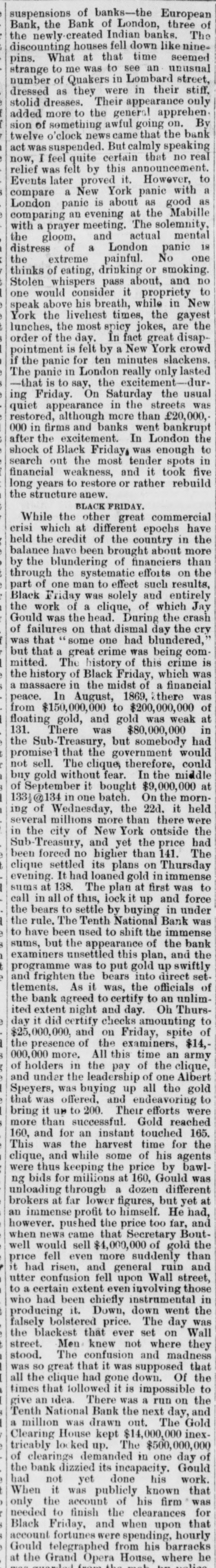 see strange of street, number as were they dressed pins. What to me Quakers was to in Lombard in their stiff. only stolid dresses. appearance the general added apprehen on. of sion winl going something the bank o'clock twelve speaking Butcalmly suspended. no real that certain later Events act was feel quite this announce However, to New compare is as about relief now, was felt proved by York it. panic good with as the at Mabille panevening a with prayer solemnity, the gloom, a of London comparing an meeting. actual The mental 18 the and London No panic one of thinks painful. or smoking. no pass Stolen it one would distress extreme eating, drinking about, and to whiseonsider in his proprietyNew while above breath, the times, gayest liveliest are the jokes, speak the most spicy great disapof the day. by a New slackens. is for ten only lasted durif the panic in London excitement Friday. in the lunches, order York pointment panic the felt the in minutes really fact York the crowd usual was The that is to say, On Saturday streets £20,000, quiet ing appearance although more went than London bankrupt the of shock restored, and In enough to the out most search it and took 000 after in the excitement. Black Friday tender was spots five in financial weakness, to or long rather restore rebuild years the anew. structure BLACK FRIDAY. commercial crisi which have the of the held credit been about While the at other different great country epochs in more the brought than financiers the balance the blundering of efforts such results, on the to effect and of one was of which of a During the the Black part by through work Friday man systematic head. clique, solely day the entirely crash Jay cry Gould was the that dismal had blundered," of failures some on one was being com is a was that that a great history crime of this which crime was but mitted. The Black Friday, of a financial was the history of the midst 1869, there In to weak peace. from gold was 000 was but floating massacre $150,000,000 There gold, in August, $80,000,000 $200,000,000 000 somebody had of in at Treasury, government could of Septem in the the not sell. buy promise 131. Sub gold without that The one it clique, the batch. bought fear. therefore, In On $9,000,00 22d. the the it middle 000 morn- held were at than ing several the of city millions of and New more yet York the outside price 141. The had forced its in in Sub 1331 Wednesday, Treasury, no higher plans than on there Thursday immense the It had loaned at first was at 138. lock it up in in all of settle by Bank but been call evening. the sums clique bears settled to this, The plan National buying gold the and immense under force was to The Tenth to shift the bank unsettled up to the have rule. been the used appearance plan, of and swiftly the tlements. sums, examiners was to bears put gold into officials direct set- of to Oh and As the it was, certify the to an Thurs- unlimto the bank extent agreed night and checks spite of ited certify Friday, $14, day the an army this the $25,000,000, presence it did and of All on examiners, time clique, the 000,000 holders more. the the leadership pay of all of one Albert of in the gold to under buying endeavoring Their reached and was was offered. 200. and Gold efforts were it up to touched 165. than an instant time for and for harvest his were that bring more 160, Speyers, the successful. some of by agents bawl- the for ng was while price was bids through but yet clique, This and keeping millions the dozen 160, Gould different at figures, He had, unloading at far lower to himself. too far, and brokers immense profit the price Boutfell and those however. price when well an it would news risen, pushed came even sell fell $1,000, more that generall wall Secretary suddenly of ruin gold street, than and the had confusion extent even instrumenta the in to a had been Down, day utter who certain it. chiefly price. down set The on went Wall was Men falsely producingine that ever not where madness they it is on the day, a stood. street. times the all was the blackest that great The that had confusion There knew it gone was was the down. supposed impossi and a next run Of ble Gold that and the to Tenth give National idea. drawn Bank out. $14,000,000 The 000 inexmillion House was kept The $500,000,000 one day Clearing lo ked up. done in Gould work. not was his firm for account only of had the When bank the it to account finish yet publicly the of when clearances known upon hourly that that was needed Black Friday, fortung and were spendingarracks his he from House. where