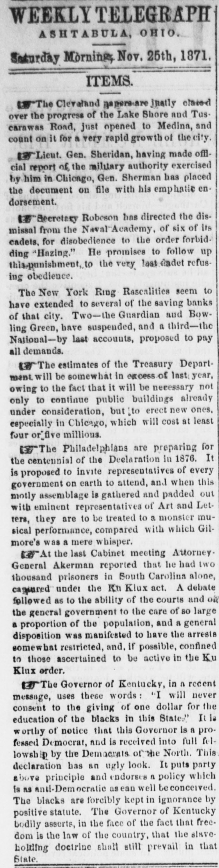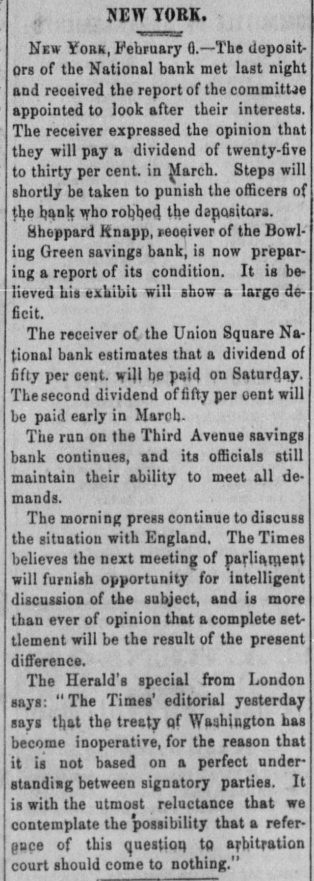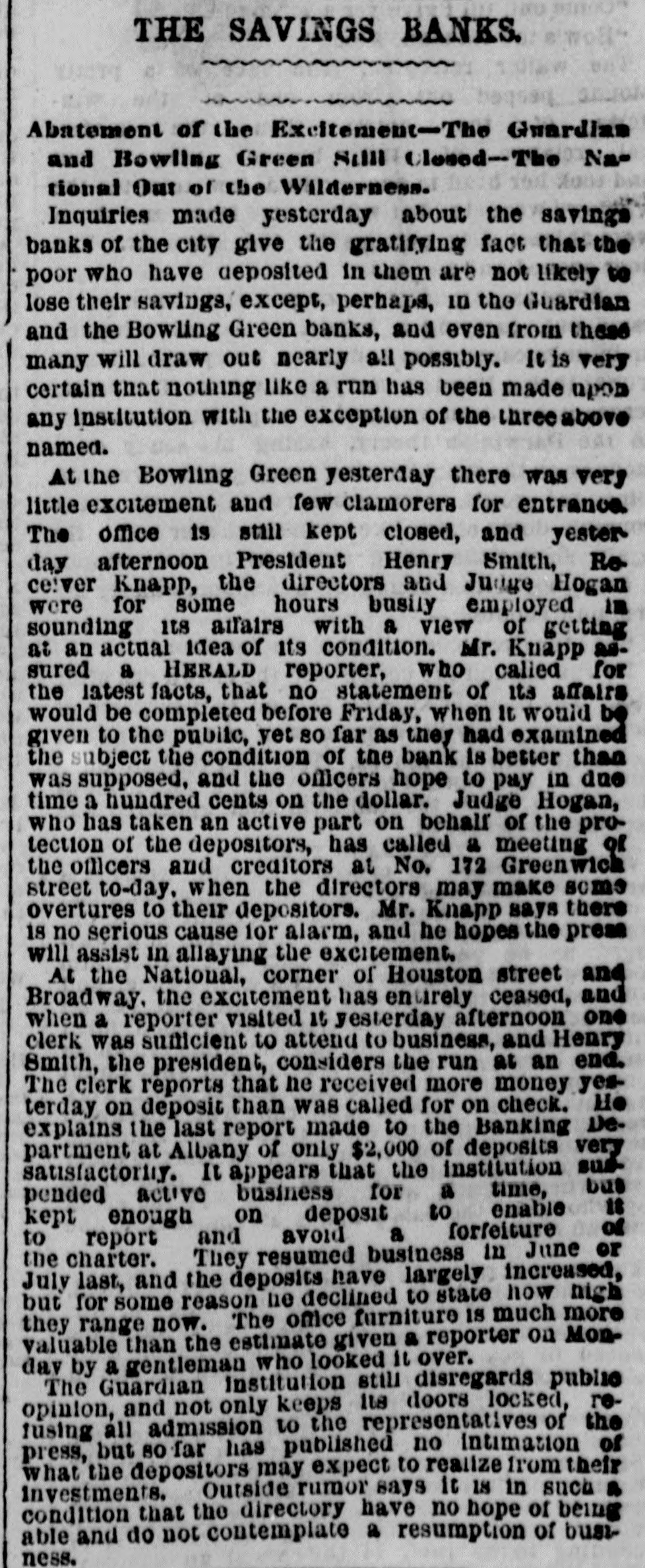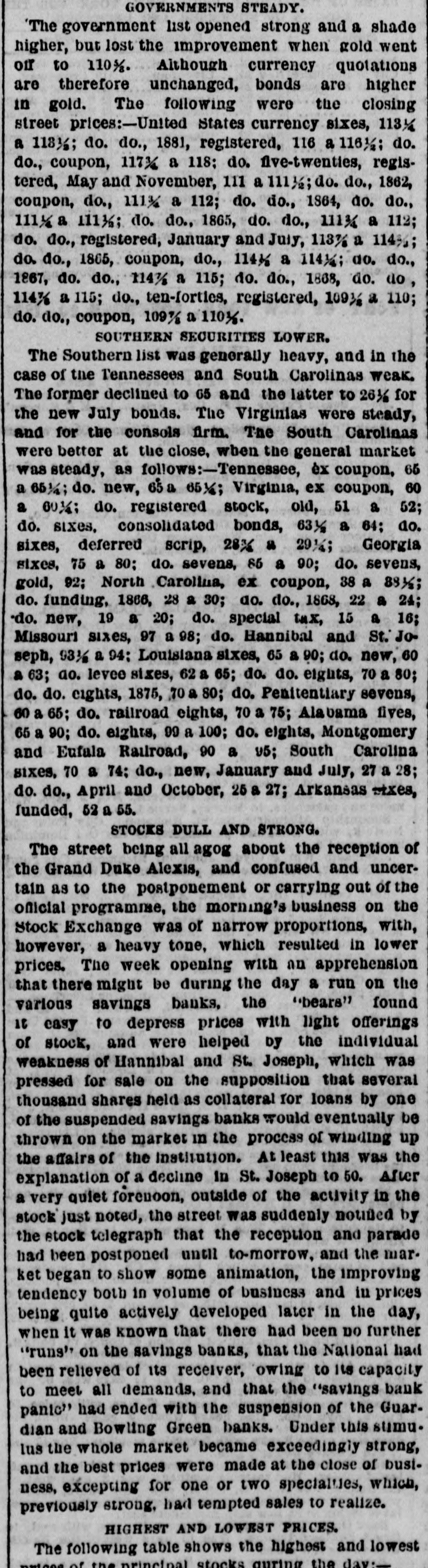 GOVERNMENTS STEADY. The government list opened strong and a shade higher, but lost the improvement when gold went off to 110 1/. Although currency quotations are therefore unchanged, bonds are higher in gold. The following were the closing street prices:-United States currency sixes, 1131/4 a 1131/2; do. do., 1881, registered, 116 a 1161/2; do. do., coupon, 1173 a 118; do. five-twenties, registered, May and November, 111 a 111 1/2; do. do., 1862, coupon, do., 111% a 112; do. do., 1864, do. do., 111 1/4 a 111 1/2; do. do., 1865, do. do., 1113 a 112; do. do., registered, January and July, 113% a 114%; do. do., 1865, coupon, do., 11416 a 1141; do. do., 1867, do. do., 114 1/2 a 115; do. do., 1868, do. do, 114% a 115; do., ten-forties, registered, 1091/6 a 110; do. do., coupon, 109 1/6 a 1101. SOUTHERN SECURITIES LOWER. The Southern list was generally heavy, and in the case of the Tennessees and South Carolinas weak. The former declined to 65 and the latter to 261/6 for the new July bonds. The Virginias were steady, and for the consols firm. The South Carolinas were better at the close, when the general market was steady, as follows:-Tennessee, èx coupon, 65 a 651/4; do. new, 65 a 651/; Virginia, ex coupon, 60 a 6034: do. registered stock, old, 51 a 52; do. sixes, consolidated bonds, 63 1/2 a 64; do. sixes, deferred scrip, 28X u 2914; Georgia sixes, 75 a 80; do. sevens, 86 a 90; do. sevens, gold, 92; North Carolina, ex coupon, 38 a 88 1/2; do. funding, 1866, 28 a 30; do. do., 1868, 22 a 24; do. new, 19 a 20; do. special tax, 15 a 16; Missouri sixes, 97 a 98; do. Hannibal and St. Joseph, 93 1/6 a 94: Louisiana sixes, 65 a 90; do. new, 60 a 63; ao. levee sixes, 62 a 65; do. do. eights, 70 a 80; do. do. eights, 1875, 70 a 80; do. Penitentiary sevens, 60 a 65; do. railroad eights, 70 a 75; Alabama fives, 65 a 90; do. eights, 99 a 100; do. eights, Montgomery and Eufala Raulood, 90 a 95; South Carolina sixes, 70 a 74: do., new, January and July, 27 a 28; do. do., April and October, 25 a 27; Arkansas sixes, funded, 52 a 55. STOCKS DULL AND STRONG. The street being all agog about the reception of the Grand Duke Alexis, and confused and uncertain as to the postponement or carrying out of the oficial programme, the morning's business on the Stock Exchange was or narrow proportions, with, however, a heavy tone, which resulted in lower prices. The week opening with an apprehension that there might be during the day a run on the various savings banks, the "bears" found it easy to depress prices with light offerings of stock, and were helped by the individual weakness of Hannibal and St. Joseph, which was pressed for sale on the supposition that several thousand shares held as collateral for loans by one of the suspended savings banks would eventually be thrown on the market in the process of winding up the affairs of the institution. At least this was the explanation of a decline in St. Joseph to 50. After a very quiet forenoon, outside of the activity in the stock just noted, the street was suddenly notified by the stock telegraph that the reception and parade had been postponed until to-morrow, and the market began to show some animation, the improving tendency both in volume of business and in prices being quite actively developed later in the day, when it was known that there had been DO further "runs' on the savings banks, that the National had been relieved of its receiver, owing to its capacity to meet all demands, and that the "savings bank panic" had ended with the suspension of the Guardian and Bowling Green banks. Under this sumu. lus the whole market became exceedingly strong, and the best prices were made at the close of business, excepting for one or two specialties, which, previously strong, had tempted sales to realize. HIGHEST AND LOWEST PRICES. The following table shows the highest and lowest of the principal stocks auring the day:-