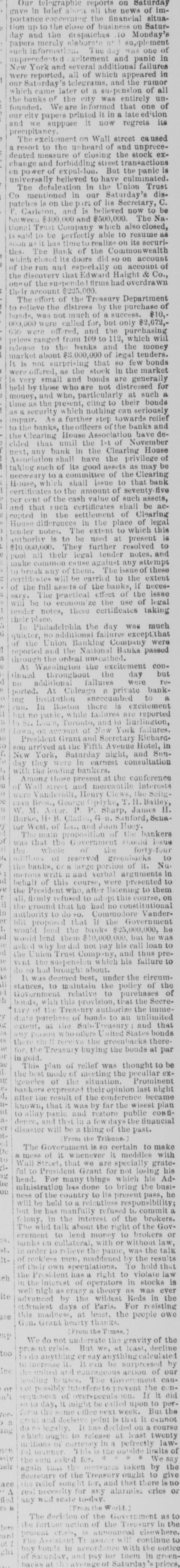outside under to 107 sell stocks rule that it was many Exchange had so impossible many to do it and k pup with the current business RESPENDED. YORK, BANK OF NORTH Sept. AMERIC m.-The Bank SURGING of New North America has suspended. CROWDS. ml At this hour are vest multitudes NEW YORK, Sept.20,1:30 sarging to and frothrough and streets, the Wall, Nassau. New and and Broad lower Broadway, recalling A general Exchange Place scenes of the firing on feeling Fort Sumter or the July riots. of the stock exat the closing who are of relief is expressed by the brokers, from the change of escape. through any means Stock Exchange glad pressure. The firmer, and tremendous open on Monday. Gold advices relative to a will probly under Washington is now 112 % advancing, further issue of currency. The price the NOTICE FROM THE LEARING-HOUSE been issued by The following Notice notice has is hereby given that a clearing-house: clearance cannot be effected the dealers this day, find general owing to the fact that their many checks of certified in a it impossible manner. to get All statements, tickets appli- and checks proper will be returned to the dealers on cation $10,000,000 to the bank. IN LOAN CERTIFICATES. afternoon NEW YORK, Sept. The bank presidents resolution at their to issue meeting immediately this ten millions in loan THE GONE certificates. NATIONAL SAN OF THE COMMONWEALTH NEW commonwealth YORK, Sept. has just The suspended. National bank of the BANK. RUN ON THE FOURTH The run en the NEW YORK, Sept. bank continues, but up to this Fourth Natioral institution is paying all demands, STREET. The hour the THE EXCITEMENT IN excitement in the NEW YORK, Sept. which followed the suspen Bank on of Stock Exchange Urion Trast company and escription. the The of Commonwealth was the beyond mad a house, and the exchange re embled blocked a ith people, all laboring Prices tumstreets under great were excitement and trenzy. and stocks were bled from 2 to 16 per cent., apparent regard to slaughtered without upon cheer any followed from the ADDITIONAL brokers value. Cheer when the Stock Exchange closed. a. 11:45 snsm. New NEW YORK, Taussig Sept. Fisher, P. M Meyers, Del- Mil pensions: Lawrens Josephs, Fearing & head. linger, ler & Walsh, Williams & Bostwick, and E.C. BroadA DEPALCATION exists in the Union Trust Company; cannot say to what extent. BANK OF NORTH AMERICA. certifiNEW THE YORK, Sept. Bank of North p. America have cations drawn of the out of the clearing house, which been rise to the rumor of its suspension. DEPALCATION gave TRUST COMPANY in THE NEW UNION YORK, Sept. amounts defalcation to $500,000. the Union Trust Company Charles F Carleton, is said to be the defaulter. The secretary He has not been seen since yesterday afternoon. NATIONAL TRUST COMPANY till say that THE they could then have have kept been up payment short. They Monday, the but street would with an amount of currence at a discame on but could find no buyers ef used to sixes, of 30 to 40 per tent and they for better count sacrifice, and suspended Have sell at such of themselves and customers. protection no advances on railroad securities. THE BANK OF that the run on the 4th National customers Bank says ipitated on US, and one of our their account pr Edwerd Haight Co.) overdrew make it amount of $200,000. and did Under not these to the the extent of $170,000. STOCKS OPENED circumstances good to we thought it best to suspend." govenment's with an advance of 4 to 6 on the buy bonds, but announcement the that failures it would of the nion Trust DEFAULTING fell 2 to 25 on Company and of the Commonwealth. SECRETARY YORK, THE Sept. Carlton, the default had NEW of the Union Trust ng secretary friends and relatives, on securimade loans to regarded sdoubtful, luding ties which were father, Rev. Dr. Carla loan of @20,000 to his priety. of the Method Book Concern others ton, The secretary for one loan is good; the are of no value. IN ALBANY. ALBANY, FAILURE Sept. is rumored that the banking house of Squires & Son, of this city, hrs spspended. STOCK QUOTATIONS YORK, LATES Sept. The follow ing were the the NEW quotations before the closing of ock latest stock board, as well as could be ascertain Central, Island, 87, cash; Ohio's, New York Lake Western Union, 57: Pacific mail, 32; Erie, 87: 89: Union Pacitic, 18; Harlem, 103 44. 55 Shore, St. Paul, 32%; C. C. and C., 20; Wabash, $2,483,000 BONDS ACCEPTED. NEW YORK, 483,000 of bonds were accept 1.rom 109 to 111.25. STATE BONDS no was There price There have been no transactions for money in before state bonds. the closing of the stock exchange. there Since being then ruled at per cent. currency. no it demand for it, as no st ock transactions have taken place. HALF MILLION DEPALCATION. NEW YORK, Sept. 20, 1:25 p. It is now rethat the defalcations in the Union Trust Company ported ill amount fully half million of a that they have been extending over do lars; iderable time, and were committed by one or officers. While the story is generally is of the lit d. it is deni d by others. The culprit cr reported to have fled city this morning. UNION TRUST COMPANY REVIVING. YORK, Sept. Checks drawn upon NEW Union Trust Company are now (half-past the (wo o'clock) being cashed by the Manhaitan Barking Company. CLOBING PRICE OF GOLD. New YORK, Sept. -Gold close at 11136 The payments that are being made by the Mauhattan Banking Company on account of the diUrion Trust Comp .ny are on checks drawn on them prev OUS to this morning, and r against et money deposited by the Trust Company. The Situation in Philadelphia. FAILURE OF THE UNION BANKING COMPANY. PHILADELPHIA, Sept. 20. The Union Bankcompany have failed. This bank is a state chartered ing affair, and bore a heavy run yesterday. THE SUSPENSION TEMPORARY. PHILADELPHIA, Sept. 20 Third street is comparative quiet this morning. The run on the Fidelity Trust company has almost subsided. The Union banking company, at 4th door stated that and Chestnut streets, did not open t