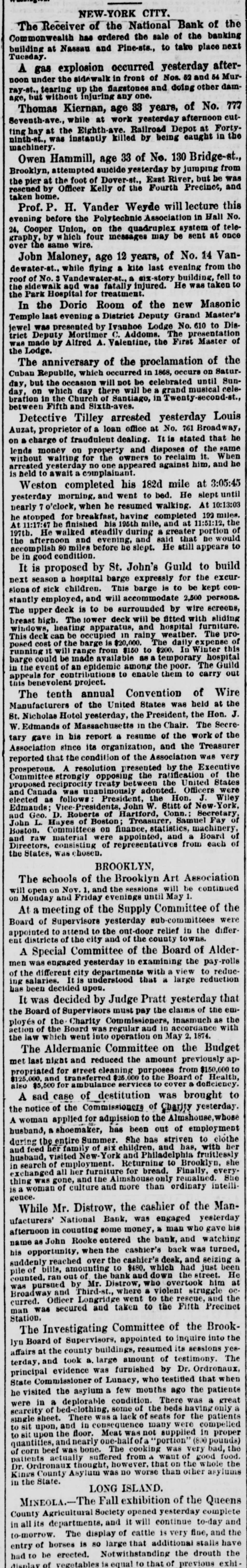NEW-YORK CITY. The Receiver of the National of the Commonwealth has ordered the sale of the banking building at Nassau and Pine-sts., to take place next Tuesday. A gas explosion occurred yesterday afternoon under the sidewalk in front of Nos. 52 and 54 Murray-st., tearing up the flagstones and doing other damage, but without injuring any one. Thomas Kiernan, age 33 years, of No. 773 Seventh-ave., while at work yesterday afternoon cutting hay at the Eighth Railroad Depot at Fortyninth-st., was instantly killed by being eaught in the machinery. Owen Hammill, age 33 of No. 130 Bridge-st., Brooklyn, attempted suicide yesterday by jumping from the pier at the foot of Dover-st., East River, but be was rescued by Officer Kelly of the Fourth Precinct, and taken home. Prof. P. H. Vander Weyde will lecture this evening before the Polytechnic Association in Hall No. 24, Cooper Union, on the quadruplex system of telegraphy, by which four messages may be sent at once over the same wire. John Maloney, age 12 years, of No. 14 Vandewater-st., while flying a kite last evening from the roof of No. 3 Vandewater-st., a six-story building, fell to the sidewalk and was fatally injured. He was taken to the Park Hospital for treatment. In the Doric Room of the new Masonic Temple last evening a District Deputy Grand Master's jewel was presented by Ivanhoe Lodge No. 610 to District Deputy Mortimer C. Addoms. The presentation was made by Alfred A. Valentine, the First Master of the Lodge. The anniversary of the proclamation of the Cuban Republic, which occurred in 1868, occurs on Saturday, but the occasion will not be celebrated until Sunday, on which day there will be a grand musical celebration in the Church of Santiago, in Twenty-second-st., between Fifth and Sixth-aves. Detective Tilley arrested yesterday Louis Auzat, proprietor of a loan office at No. 761 Broadway, on a charge of fraudulent dealing. It is stated that he lends money on property and disposes of the same without waiting for the owners to reclaim it. When arrested yesterday no one appeared against him, and he is held to await a complainant. Weston completed his 182d mile at 3:05:45 yesterday morning, and went to bed. He slept until nearly 7 o'clock, when he resumed walking. At 10:13:03 he stopped for breakfast, having completed 192 miles. At 11:17:47 he finished his 195th mile, and at 11:51:12, the 197th. He walked steadily during a greater portion of the afternoon and evening, and said that be would accomplish 80 miles before he slept. He still appears to be in good condition. It is proposed by St. John's Guild to build next season a hospital barge expressly for the excursions of sick children. This barge is to be kept constantly employed, and will accommodate 2,500 persons. The upper deck is to be surrounded by wire screens, breast high. The lower deck will be fitted with sliding windows, heating apparatus, and hospital furniture. This deck can be occupied in rainy weather. The proposed cost of the barge is $20,000. The daily expense of running it will range from $150 to $200. In Winter this barge could be made available as a temporary hospital in the event of an epidemic among the poor. The Guild appeals for contributions to enable them to carry out this benevolent project. The tenth annual Convention of Wire Manufacturers of the United States was held at the St. Nicholas Hotel yesterday, the President, the Hon. J. W. Edmands of Massachusetts in the Chair. The Secretary gave in bis report a resume of the work of the Association since its organization, and the Treasurer reported that the condition of the Association Was very prosperous. A resolution presented by the Executive Committee strongly opposing the ratification of the proposed reciprocity treaty between the United States and Canada was unanimously adopted. Officers were elected as follows President, the Hon. Wiley Edmands; Vice-Presidents, John W. Stitt of New York, and Geo. D. Roberts of Hartford, Conn.: Secretary, John L. Hayes of Boston Treasurer, Samuel Fay of Boston. Committees on finance, statistics, machinery, and raw material were appointed, and a Board of Directors, consisting of representatives from each of the States, was chosen. BROOKLYN, The schools of the Brooklyn Art Association will open on Nov. and the sessions will be continued on Monday and Friday evenings until May 1. At a meeting of the Supply Committee of the Board of Supervisors yesterday sub-committees were appointed to attend to the ont-door relief in the different districts of the city and of the county towns. A Special Committee of the Board of Aldermen was engaged yesterday in examining the pay-rolls of the different city departments with a view to redueing salaries. It is understood that a large reduction has been decided upon. It was decided by Judge Pratt yesterday that the Board of Supervisors must pay the claims of the employés of the Charity Commissioners, inasmuch as the action of the Board was regular and in accordance with the law which went into operation on May 2, 1874. The Aldermanic Committee on the Budget met last night and reduced the amount previously appropriated for street cleaning purposes from $150,000 to $125,000, and transferred $25 000 to the Board of Health, also $5,500 for ambulance services to cover a deficiency. A sad case of destitution was brought to the notice of the Commissioners of Charity yesterday. A woman applied for admission to the Almshouse,whose husband, a shoemaker, has been out of employment during the entire Summer. She has striven to clothe and feed her family of six children, and has, with her husband, visited New- York and Philadelphia fruitlessly in search of employment. Returning to Brooklyn she exchanged all her furniture for bread. Finally, everything was gone, and the Almshouse only remained. She is woman of culture and more than ordinary intelligence. While Mr. Distrow, the cashier of the Manufacturers' National Bank, was engaged yesterday afternoon in coun