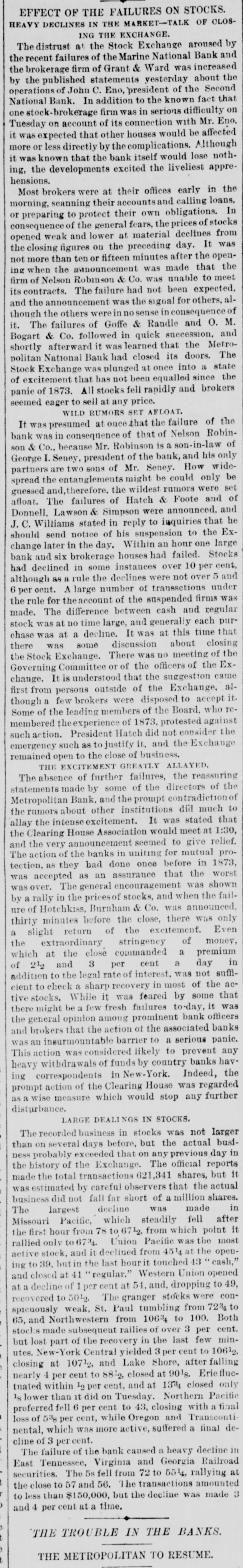 EFFECT OF THE HEAVY DECLINES IN THE MARKET-TALK OF CLOSING THE EXCHANGE. The distrust at the Stock Exchange aroused and by failures of the Marine National Bank firm of Grant & Ward was the the recent brokerage yesterday increased about the by the published statements Second of John C. Eno, `president of the In addition to the firm was in serious operations x-brokerage Bank. known difficulty fact Mr. that on account of its connection that other houses would less by the it one Tuesday National more was or expected directly complications. would with be lose Although affected noth- Eno, on it known that the bank itself excited the were at their offices scanning their accounts and ing, morning, hensions. Most was the brokers developments obligations. liveliest calling early in appre- loans, the In or preparing to protect their own of stocks of the general fears, the prices from weak and lower at material figures on the preceding than ten or fifteen minutes closing more after the that the announcement was made consequence opened the not ing when unable declines day. to It open- meet was the Nelson Robinson & Co. was The failure had not been its firm contracts. of others, expected, alannouncement was the signal for the others were in no sense in failures of Goffe & Randle and it. though the The succession, consequence of and O. and M. & Co. followed in quick afterward it was learned that The National Bank had closed its shortly politan Bogart doors. the Metro- state Stock Exchange was plunged at once into a of excitement that has not been equalled since brokers the panic of 1873. All stocks fell rapidly and seemed eager to sell at any price. WILD RUMORS SET AFLOAT. It presumed at once that the failure of Robin- the in of that of of because Mr. Robinson is a bank & was was Co., consequence Nelson son-in-law and his only son president of the bank, are two sons of Mr. Seney. the entanglements might be partners George spread I. Seney, could How were only wide- be and, therefore. the wildest rumors The failures of Hatch & and Lawson & Simpson were he Williams stated in reply to afloat. guessed Donnell, C. inquiries announced, Foote the that and set of send notice of his suspension to later in the day. Within an one and six brokerage houses had declined in some instances over 10 per 5 as a rule the declines were not over although J. should bank had change hour failed. Stocks under large cent, and ExA large number of transactions for the account of the 6 per cent. rule suspended and firms was difference between cash was at no time large, and generally was at a decline. It was at this some discussion Exchange. There was no Exmade. stock chase there the the Stock The was about meeting time each the regular closing of pur- that Committee or of the officers of Governing suggestion came the It is understood that the outside of the it. a few brokers were disposed to first change. though from persons Exchange, accept who althe leading members of the theexperience of 1873, membered Some of protested Board, consider against the resuch action. President Hatch did not emergency such as to justify it, and the Exchange remained open to the close of business. THE EXCITEMENT GREATLY ALLAYED. absence of further failures, the reassuring of the The made by some of the directors of statements Bank, and the prompt contradiction about other institutions intense excitement. It was allay Metropolitan the rumors the did stated much at 1:30, that to Clearing House Association would meet relief. the announcement seemed to proof the banks in uniting for and The the action very before mutual give in 1873, as they had done once worst as an assurance was The general encouragement was tection, was over. accepted that when the the shown failin the prices of stocks, and a of Hotchkiss, Burnham & Co. was ure minutes before the close, Even by thirty rally excitement. there announced, was only return of the a stringency the slight extraordinary of premium money, 3 cent which at the close commanded a a day in per of addition 212 to and the legal rate of interest, was not the suffi- accheck a sharp recovery in most of that While it was feared by some was be a few fresh failures tive cient there stocks. to might to-day, bank officers it general opinion amoug prominent banks the brokers that the action of the associated panic. and insurmountable barrier to a serious This was an action was considered likely to prevent banks hav- any heavy correspondents withdrawals of funds in New-York. by country Indeed, the ing action of the Clearing House was regarded further as prompt wise measure which would stop any disturbance. LARGE DEALINGS IN STOCKS. The recorded business in stocks was not larger busion several days before, but the actual than probably exceeded that on any previous reports day in the ness history of the Exchange. The official but it the total transactions 621,341 shares, actual was estimated made by careful observers that the shares. business did not fall far short of a million made in The largest decline was Pacific, which steadily fell after hour from 78 to 6712, from to 6734. Union Pacific was and it declined from 45 14 at active but in the last hour touched 39. stock, only 43 the to at 41 'regular." Western rallied and ing Missouri the first closed which Union the point opened cash," to open- most 49, it of 1 per cent at 54, and, conat a to The granger decline stocks dropping were to weak, St. Paul tumbling Both Northwestern from 10634 to 65, made subsequent railies of over of the recovery in the spicuously recovered and 5012 from 3 100. per 7234 10612, cent. minNew-York Central yielded 3 per cent to lost part last after few and Lake Shore, cent to 882 closed at only 12 per cent, and at 1334 utes. stocks closing but nearly tuated 4 within at per 10712, Northern 9018. closed Erieflue- Pacific falling than it did on Tuesday. fell 6 per cent to 43, closing a preferred 1g lower with Transconti- final of 53g per cent, while Oregon a