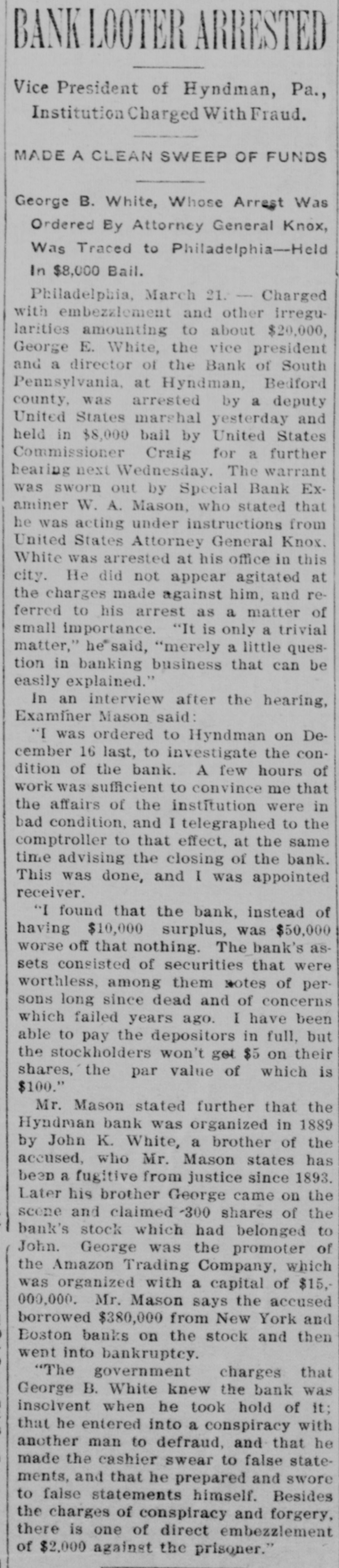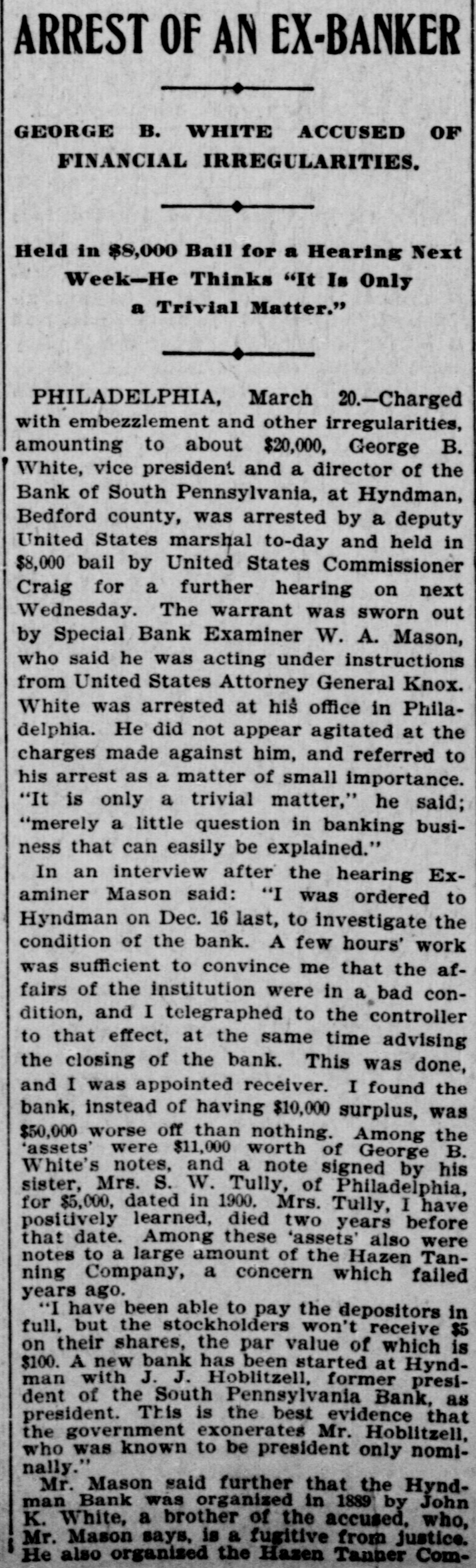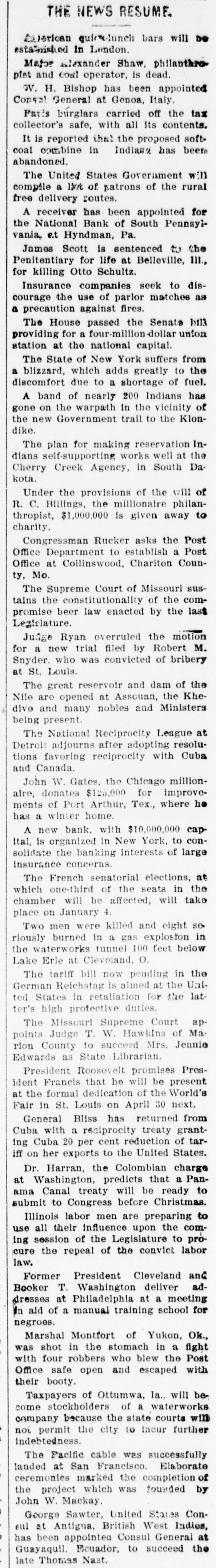 Capital Notes. Government receipts, Tuesday: From internal revenue, $464,985; customs, $915,045; miscellaneous, $181,824; expenditures, $1,259,000. It is understood that the President has decided to appoint Dr. W. D. Crum. the colored applicant, as collector of the port of Charleston. Comptroller of the Currency Ridgley, has closed the National Bank of South Pennsylvania, at Hyndman, Pa., and has appointed Walter R. Mason, bank examiner as receiver. General Tasker H. Bliss, who was sent to Havana, to aid Minister Squiers in drafting a reciprocity treaty between the United States and Cuba, reached Washington, Tuesday, and delivered to Sec. Hay the treaty signed in Havana, last week. It provides for a 20 per cent. reduction in the tariff charges on Cuban products entering the United and heavy reductions on American exports to Cuba. While the final arrangements for the obsequies of Mrs. Grant have not been made it is settled that the body will be placed by the side of that of her husband in the tomb at Riverside park, New York. The secretary of war has directed that all the army officers stationed in New York and vicinity shall attend the services at the tomb in full dress uniform. Secretary. Root and many other prominent officials will accompany the funeral party to New York and attend the services at the tomb. Representative McCall, Masachusetts. Tuesday, introduced in the House a resolution directing the secretary of state to inform the House concerning any understanding or agreement between the governments of Great Britain and Germany and the diplomatic officers of the United States or any assurances by these governments to the diplomatic officers of the United States as to the nature, extent or purpose of the joint demonstration of these governments against Venezuela and particularly with reference to the occupation of the territory of Venezuela. The resolution also asks that correspondence regarding this subject be transmitted to the House. Secretary Wilson, Tuesday, issued an order directing that all freight cars which have carried animals within the limits of Connecticut, Rhode Island and Massachusetts or Vermont, which have been quarantined on account of the outbreak of the foot and mouth disease. shall be cleaned and disinfected before leaving the state where loaded. The order also provides: "The the hides. skins, hair. horns or hoofs of ruminants or swine shall not be allowed to be taken out of either of the said quarantined states: provided that such articles. imported at any port in said states where an inspector of this department is stationed, may be forwarded under certificate of said inspector." An investigation into the advance in the freight rates on grain and grain products, dressed meats and provisions from the Mississippi river, Chicago, etc., to New York and Eastern points governed by the New York rate, was begun, Friday, by the interstate commerce commission. The testimony added to the profits of one road alone showed that $400,000 revenue would be by the contemplated increase. It was claimed that the advances were justi_ fied by the increased cost of operations. At the suggestion of counsel and officials of the roads represented, the commission decided to require the raile roads to file written statements by d Jan. 10 next. setting forth the reasons they rely on to justify the advance in r rates.