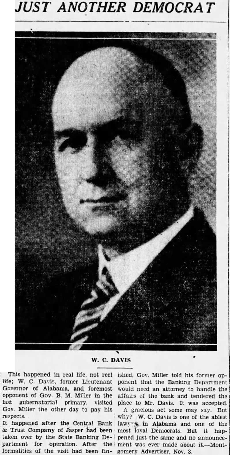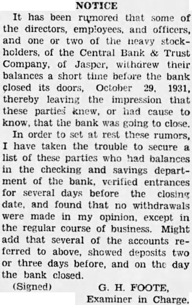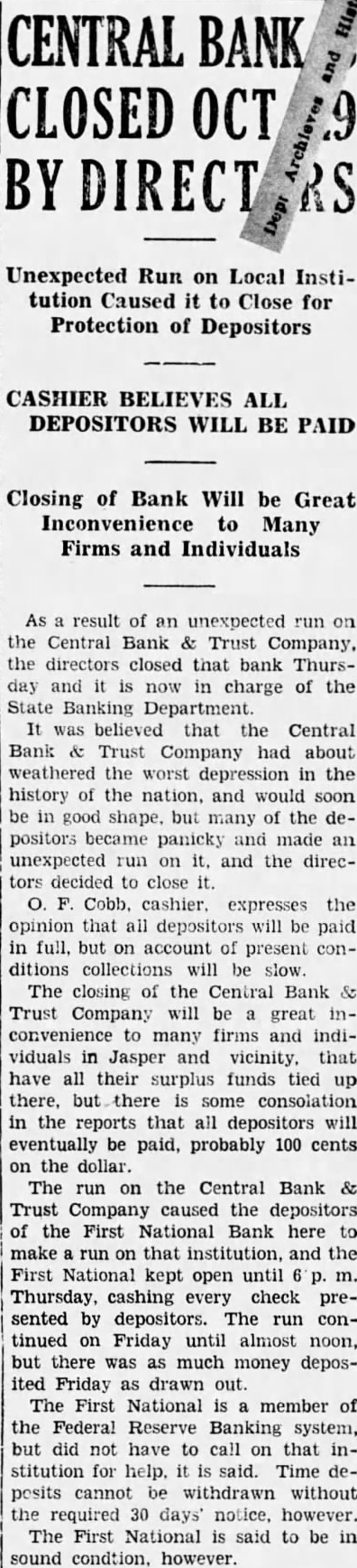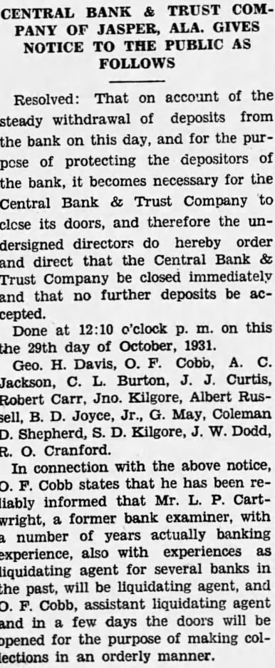 TRUST COMCENTRAL BANK JASPER, ALA. GIVES PANY OF TO THE PUBLIC AS NOTICE FOLLOWS That account of the Resolved: on steady withdrawal of deposits from the bank on this day, and for the purpcse of protecting the depositors of the bank, it becomes necessary for the Central Bank & Trust Company to close its doors, and therefore the undersigned directors do hereby order and direct that the Central Bank & Trust Company be closed immediately and that no further deposits be accepted. Done at 12:10 o'clock p. m. on this the 29th day of October, 1931. Geo. H. Davis, Cobb, A. C. Jackson, C. L. Burton, J. Curtis, Robert Carr, Jno. Kilgore, Albert Russell, B. D. Joyce, Jr., G. May, Coleman D. Shepherd, S. D. Kilgore, W. Dodd, R. Cranford. In connection with the above notice, Cobb states that he has been reliably informed that Mr. L. Cartwright, former bank examiner, with number of years actually banking experience, also with experiences as liquidating agent for several banks in the past, will be liquidating agent, and Cobb, assistant liquidating agent and in a few days the doors will be opened for the purpose of making collections in an orderly manner.