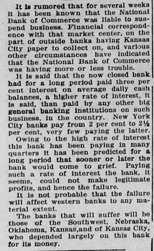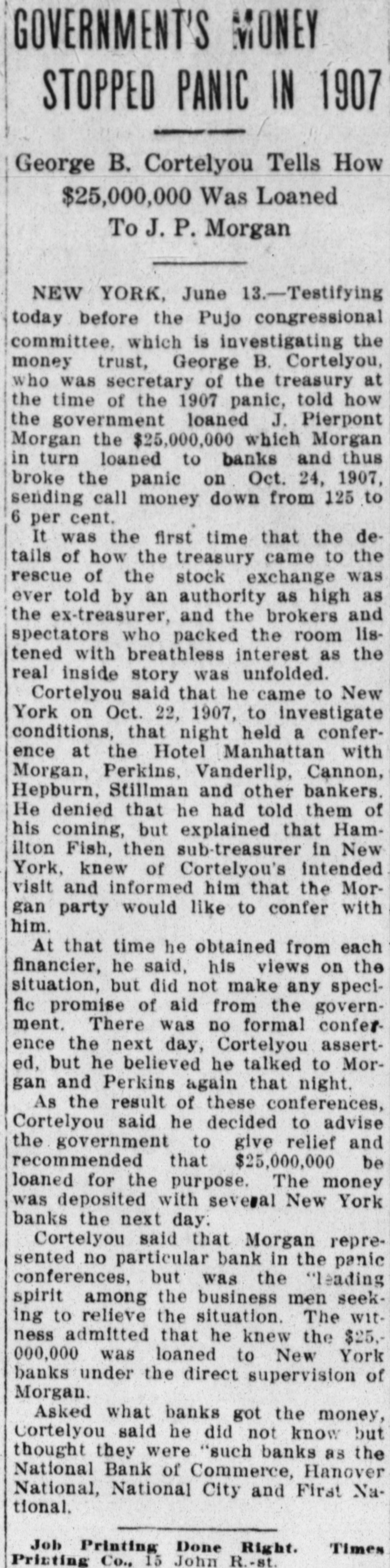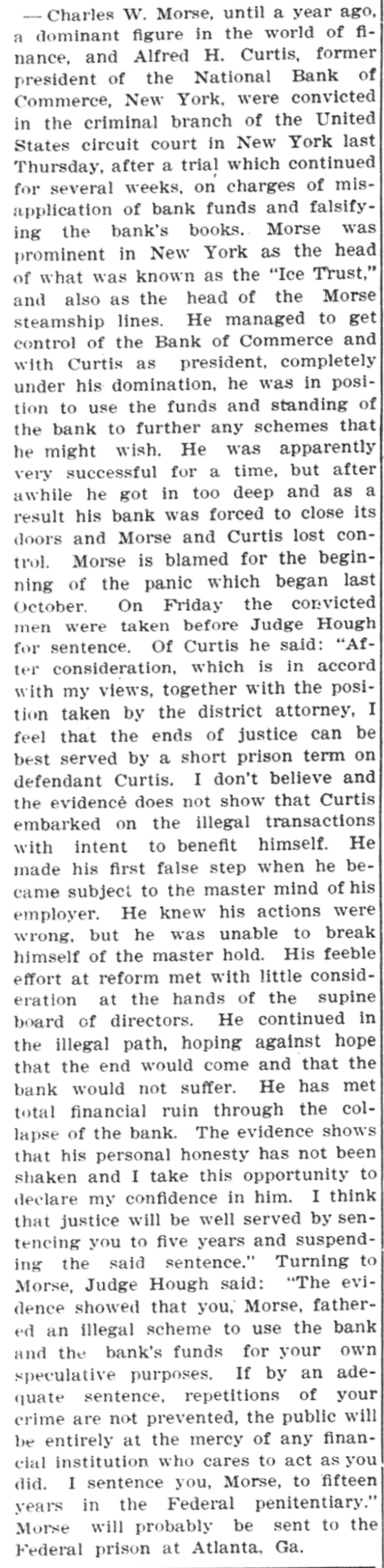 FINANCIAL Jan. 21-Merchants' and Farmers' bank of Fairmont, Minn., suspended. Feb. 2-F. D. Gilman, former president suspended Home bank of Goodland, Ind., found guilty of embezzlement. 8-F. D. Gilman, Indiana banker, sentenced to term of one to three years in state prison. $-Disappearance of $173,000 from subtreasury at Chicago made public. Mar. 14-Virtual pante in Wall street; Secretary Cortelyou relieved the situation. 19-Citizens' State bank of Firth, Neb., closed by state. IS-Corbin Banking company of New York, assigned; assets, $3,000,000: Habillties, $1,700,000 Apr. 2-Maj. H. W. Salmon of Warsaw, Mo., convicted of illegal banking. sentexced three years in penitentiary. 11-Bank of Conception, at Clyde, Mo., ordered closed. 19-Ex-Judge Smith of Chicago, found guilty of conspiring to defraud stockholders and depositors of Bank of America. of which he was president; penalty, Imprisonment and $1,000 fine. Jul. 1-Citizens' bank of Eureka Springs, Ark., suspended. &-Fort Dallas National bank of Miami, Fla., closed. 20-Farmers' National bank of Boyertown. Pa., ordered closed. Aug. 3-People's State bank of Brownstown, Ind., closed by state authorities It Receivers appointed for Pope Mfg. Co., of Hartford, Conn.: failure ascribed to stringency of money market. Sep -Watson & Co., members of New York stock and produce exchanges and of Chicago board of trade, failed. Oct. 9-Union bank of Richland, and Bowman bank of Kalamazoo, Mich., both private institutions, closed doors. 16-Collapse of Heinze corner in copper caused violent slump in stocks in New York: firm of Otto Heinze & Co., suspended from stock exchange. I9-New York clearing house committee declared that the Heinre, Morse and Thomas interests had been eliminated from banking organizations of New York. -Knickerbocker Trust Co., New York's second largest financial institution, forced to suspend; great stump In securities: call money at 20 per cent. 23-Secretary of treasury ordered deposit of $15,000,000 of government funds in New York banks. Four Westinghouse companies at Pittsburg and one trust company forced into hands of receivers because of financial stringency State Bank and Trust Co., of Carson, Nevada, falled. 14-Three minor banks in New York forced to close. Bouthern Steel Co., of Birmingham, Ala., filed Involuntary petitlon in bankruptcy. more minor banking institutions In New York closed doors Union Trust Co., of Providence, R. 1., suspended. 26 Banks in New York and Chicago, and many other cities adopted clearing house loan certificate system to prevent draining of supplies of currency and made withdrawal of savings deposits subject to legal notice $9 0-California Safe Deposit & Trust Co. bank. at Ban Francisco, closed Financlal conditions in New York practically normal again. Nov. 4-Three small banks In Kansas closed United States Steel corporation secured controlling interest in Tennessee Coal & Iron Co. -Receiver appointed for Arnold Print works of North Adams, Muss, one of largest textile concerns in country. If-Merchants National bank of Portland, Ore, California bank of Oakland, Cal. and Farmers' & Merchants' bank of Sapulpa, LT, suspended. 15 -Secretary of Treasury Cortelyou ordered Issue of $50,000,000 of Panama bonds and $108,000,000 certificates of indebtedness na means of relieving finandal situation City National bank of Frederick, Okla., failed. IT-American Hilk Co. capital stock, $11,000,000, which operated mills in several cities, placed in hands of receiver Dec. Chelsea Savings abnk of Chelnea. Mich, owned by State Treasurer Glazier, closed. National Bank of Commerce, one of largest financial institutions of Manage CITY, suspended Fort Fill National bank of Pittsburs closed K-Jewelers' National bank at North Attleboro, Mass., in hands of receiver.