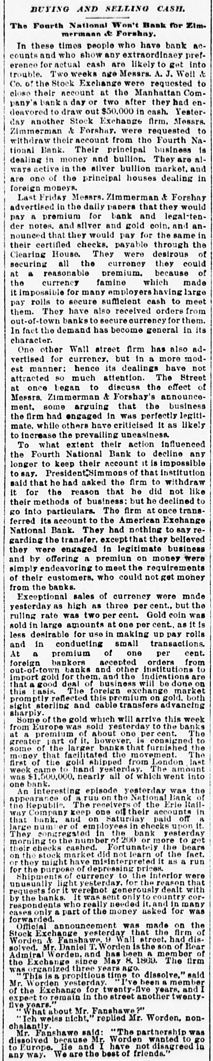 BUYING AND SELLING CASH. The Fourth National Won't Bank for Zimmermann & Forshay. In these times people who have bank accounts and who show any extraordinaey preference for actual cash are likely to get into trouble. Two weeks age Messrs. A. J. Well & Co. of the Stock Exchange were requested to close their account at the Manhattan Company's bank a day or two after they had endeavored to draw out $50,000 in cash. Yesterday another Stock Exchange firm. Messrs. Zimmerman & Forshay. were requested to withdraw their account from the Fourth National Bank. Their principal business is dealing in money and bullion. They are always active in the silver bullion market. and are one of the principal houses dealing in foreign moneys. Last Friday Messrs. Zimmerman & Forshay advertised in the daily papers that they would pay a premium for bank and legal-tender notes. and silver and gold coin. and announced that they would pay for the same in their certified checks. payable through the Clearing House. They were desirous of securing all the currency they could at a reasonable premium. because of the currency famine which made it impossible for many employers having large pay rolls to secure sufficient cash to meet them. They have also received orders from out-of-town banks to secure currency for them. In fact the demand has become general in its character. One other Wall street firm has also advertised for currency. but in a more modest manner: hence its dealings have not attracted SO much attention. The Street at once began to discuss the effect of Messrs. Zimmerman & Forshay's announcement. some arguing that the business the firm had engaged in Was perfectly legitimate. while others have criticised it as likely to increase the prevailing uneasiness. To what extent their action influenced the Fourth National Bank to decline any longer to keep their account it is impossible to say. President:Simmons of that institution said that he had asked the firm to withdraw it for the reason that he did not like their methods of business: but he declined to go into particulars. The firm at once transferred its account to the American Exchange National Bank. They had nothing to say regarding the transfer. except that they believed they were engaged in legitimate business and by offering a premium on money were simply endeavoring to meet the requirements of their customers. who could not get money from the banks. Exceptional sales of currency were made yesterday as high as three per cent., but the ruling rate was two per cent. Gold coin was sold in large amounts at one per cent., as it is less desirable for use in making up pay rolls and in conducting small transactions. At a premium of one per cent. foreign bankers accepted orders from out-of-town banks and other institutions to import gold for them. and the indications are that a good deal of business will be done on this basis The foreign exchange market promptly reflected this premium on gold. both sight sterling and cable transfers advancing sharply. Some of the gold which will arrive this week from Europe was sold yesterday to the banks at a premium of about one per cent. The greater part of it, however. is consigned to some of the larger banks that furnished the money that facilitated the movement. The first of the gold shipped from London last week came to hand yesterday. The amount was $1,500,000, nearly all of which went into one bank. An interesting episode yesterday was the appearance of it run on the National Bank of the Republic. The receivers of the Erie Railway Company keep one of their accounts in that bank. and on Saturday paid off a large number of employees in checks upon it. They congregated in the bank yesterday morning to the number of 200 or more to get their checks cashed. Fortunately the bears on the stock market did not learn of the fact. or they might have misinterpreted it as a run for the purpose of depressing prices. Shipments of currency to the interior were unusually light yesterday. for the reason that requests for it wereinot generously dealt with by the banks. It was sent only to country correspondents who really needed it, and in many cases only a part of the money asked for was forwarded. Official announcement was made on the Stock Exchange yesterday that the firm of Worden & Fanshawe 9 Wall street. had dissolved. Mr. Daniel T. Worden is the son of Rear Admiral Worden. and has been a member of the Exchange since May 8. 1869. The firm was organized three years ago. "This iss pronitious time to dissolve." said
