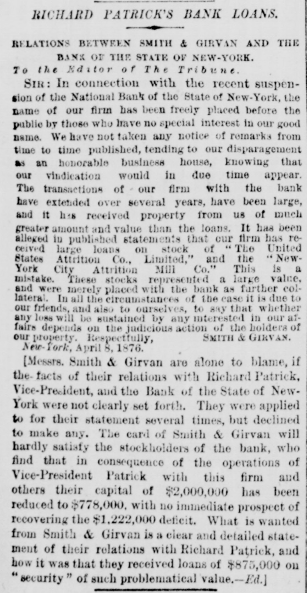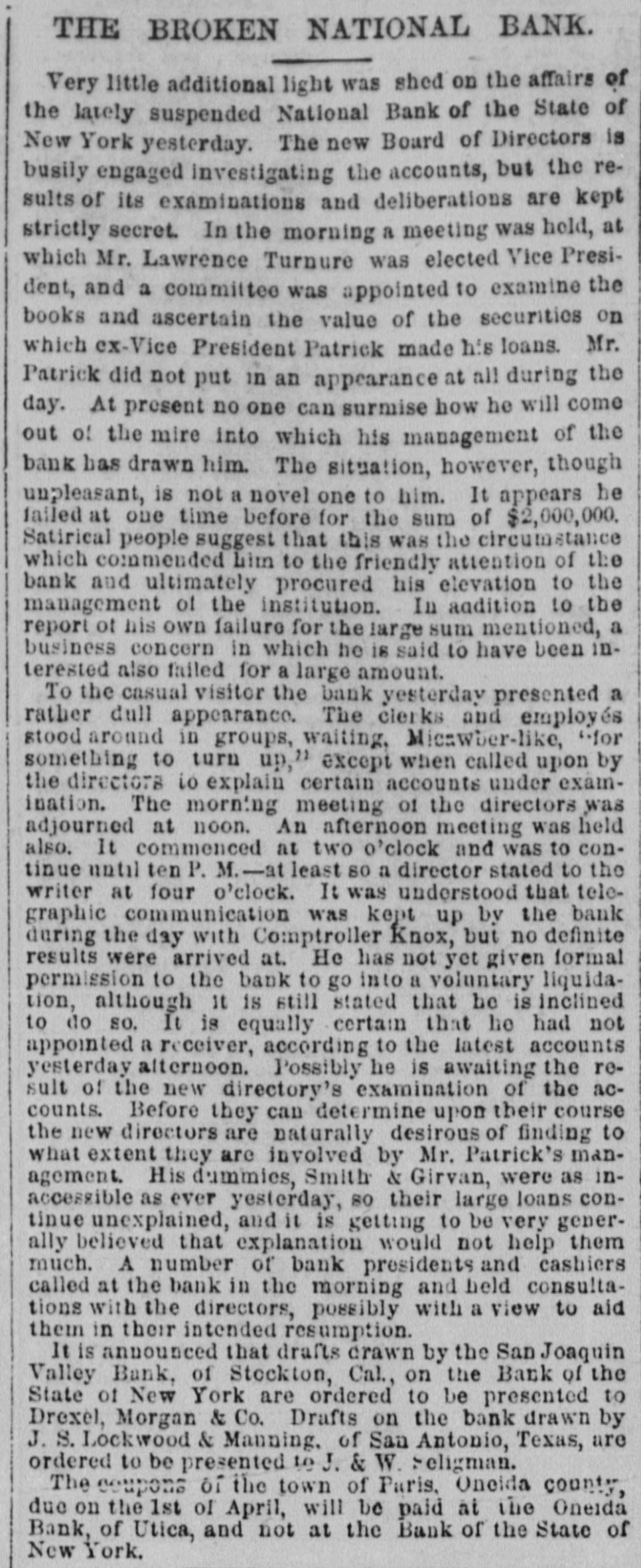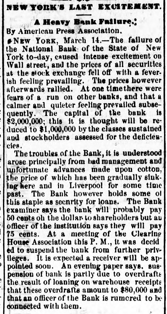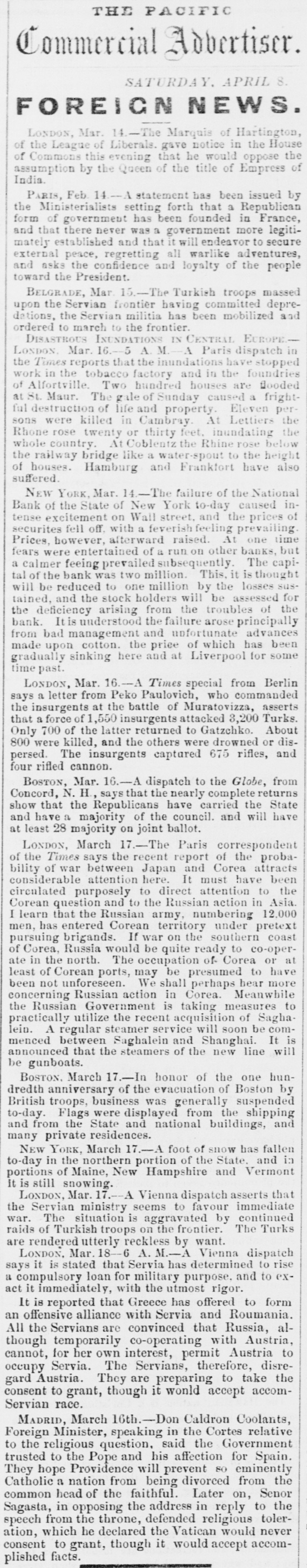 THE PACIFIC Commercial Adbertiscr. SATURDAY, APRIL 8. FOREIGN NEWS. LONDON, Mar. 14.-The Marquis of Hartington, of the League of Liberals. gave notice in the House of Commons this evening that he would oppose the assumption by the Queen of the title of Empress of India. PARIS, Feb 14.--A statement has been issued by the Ministerialists setting forth that a Republican form of government has been founded in France, and that there never was a government more legitimately established and that it will endeavor to secure external peace, regretting all warlike adventures, and asks the confidence and loyalty of the people toward the President. BELGRADE, Mar -The Turkish troops massed upon the Servian frontier having committed depredations, the Servian militia has been mobilized and ordered to march to the frontier. DISASTROUS INUNDATIONS IN CENTRAL ECROPE.LONDON Mar. 16 5 A. M. -A Paris dispatch in the Times reports that the inundations have stopped work in the tobacco factory and in the foundries of Alfortville. Two hundred houses are flooded at St. Maur. The gale of Sunday caused a frightful destruction of life and property. Eleven persons were killed in Cambray. At Lettiers the Rhone rose twenty or thirty feet. inundating the whole country. At Coblentz the Rhine rose below the railway bridge like a water-spout to the height of houses. Hamburg and Frankfort have also suffered. NEW YORK, Mar. 14.-The failure of the National Bank of the State of New York to-day caused intense excitement on Wall street, and the prices of securites fell off. with a feverish feeling prevailing Prices, however, afterward raised. At one time fears were entertained of a run on other banks, but a calmer feeing prevailed subsequently. The capital of the bank was two million. This, it is thought will be reduced to one million by the losses sustained, and the stock holders will be assessed for the deficiency arising from the troubles of the bank. It is understood the failure arose principally from bad management and upfortunate advances made upon cotton. the price of which has been gradually sinking here and at Liverpool for some time past. LONDON, Mar. 16.-A Times special from Berlin says a letter from Peko Paulovich, who commanded the insurgents at the battle of Muratovizza, asserts that a force of 1,550 insurgents attacked 3,200 Turks. Only 700 of the latter returned to Gatzchko. About 800 were killed, and the others were drowned or dispersed. The insurgents captured 675 rifles, and four rifled cannon. BOSTON, Mar. 16.-A dispatch to the Globe, from Concord, N. H., saysthat the nearly complete returns show that the Republicans have carried the State and have a majority of the council. and will have at least 28 majority on joint ballot. LONDON, March 17.-The Paris correspondent of the Times says the recent report of the probability of war between Japan and Corea attracts considerable attention here. It must have been circulated purposely to direct attention to the Corean question and to the Russian action in Asia. I learn that the Russian army, numbering 12.000 men, has entered Corean territory under pretext pursuing brigands. If war on the southern coast of Corea, Russia would be quite ready to co-operate in the north. The occupation of Corea or at least of Corean ports, may be presumed to have been not unforeseen. We shall perhaps hear more concerning Russian action in Corea. Meanwhile the Russian Government is taking measures to practically utilize the recent acquisition of Saghalein. A regular steamer service will soon be commenced between Saghalein and Shanghai. It is announced that the steamers of the new line will be gunboats. BOSTON, March 17.-In honor of the one hundredth anniversary of the evacuation of Boston by British troops, business was generally suspended to-day. Flags were displayed from the shipping and from the State and national buildings, and many private residences. NEW YORK, March 17.-A foot of snow has fallen to-day in the northern portion of the State. and in portions of Maine, New Hampshire and Vermont it is still snowing. LONDON, Mar. 17. A Vienna dispatch asserts that the Servian ministry seems to favour immediate war. The situation is aggravated by continued raids of Turkish troops on the frontier. The Turks are rendered utterly reckless by want. LONDON, Mar. 18--6 A. M.-A Vienna dispatch says it is stated that Servia has determined to rise a compulsory loan for military purpose. and to exact it immediately, with the utmost rigor. It is reported that Greece has offered to form an offensive alliance with Servia and Roumania. All the Servians are convinced that Russia, although temporarily co-operating with Austria, cannot, for her own interest, permit Austria to occupy Servia. The Servians, therefore, disregard Austria. They are preparing to take the consent to grant, though it would accept accomServian race. MADRID, March 16th.-Don Caldron Coolants, Foreign Minister, speaking in the Cortes relative to the religious question, said the Government trusted to the Pope and his affection for Spain. They hope Providence will prevent 80 eminently Catholic a nation from being divorced from the common head of the faithful. Later on, Senor Sagasta, in opposing the address in reply to the speech from the throne, defended religious toleration, which he declared the Vatican would never consent to grant, though it would accept accomplished facts.