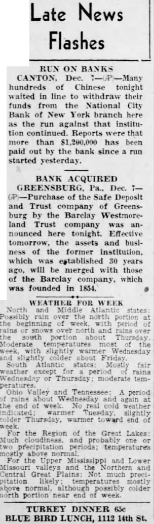 BANK ACQUIRED GREENSBURG, the Safe Deposit and Trust company Greensburg the Barelay Westmoreland Trust company announced tonight. Effective tomorrow, assets and busithe former institution. which established 30 years be merged those Barclay company, which founded in 1854.