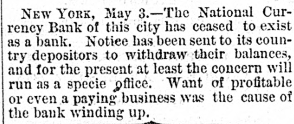 NEW YORK, May 3.-The - National Currency Bank of this city has ceased to exist as a bank. Notice has been sent to its country depositors to withdraw their balances, and for the present at least the concern will run as a specie office. Want of profitable or even a paying business was the cause of the bank winding up.