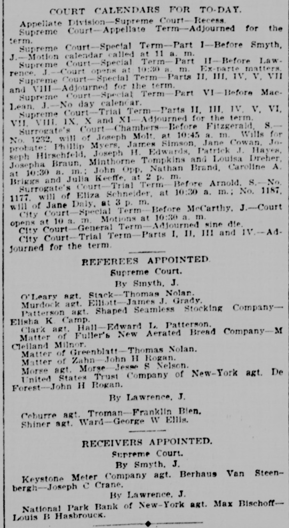 COURT CALENDARS FOR TO-DAY. Appellate Division-Supreme Court-Recess. Supreme Court-Appellate Term-Adjourned for the term. Supreme Court-Special Term-Part I-Before Smyth, J.-Motion calendar called at 11 a. m. Supreme Court-Special Term-Part II-Before Lawrence. J.-Court opens at 10:30 a. m. Ex-parte matters. Supreme Court-Special Term-Parts II, III, IV, V, VII and VIII-Adjourned for the term. Supreme Court-Special Term-Part VI-Before MacLean. J.-No day calendar. Supreme Court-Trial Term-Parts II, III, IV, V. VI, VII, VIII. IX, X and XI-Adjourned for the term. Surrogate's Court-Chambers-Before Fitzgerald, S.No. 1232, will of Joseph Molt, at 10:45 a. m. Wills for probate: Phillip Myers, James Simson, Jane Cowan, Joseph Hirschfeld, Joseph H. Edwards, Patrick J. Hayes, Josepha Braun, Minthorne Tompkins and Louisa Dreher, at 10:30 a. m.: John Opp. Nathan Brand, Caroline A. Briggs and Julia Keeffe, at 2 D. m. Surrogate's Court-Trial Term-Before Arnold. S.-No. 1177. will of Eliza Schneider, at 10:30 a. m.; No. 1187, will of Jane Daly. at 3 p. m. City Court-Special Term-Before McCarthy. J.-Court opens at 10 a. m. Motions at 10:30 a. m. City Court-General Term-Adjourned sine die. City Court-Trial Term-Parts I, II, III and IV.-Adjourned for the term. REFEREES APPOINTED Supreme Court. By Smyth, J. O'Leary agt. Stack-Thomas Nolan. Murdock agt. Elliott-James J. Grady. Patterson agt. Shaped Seamless Stocking CompanyElisha K. Camp. Clark agt. Hall-Edward L. Patterson. Matter of Fuller's New Aerated Bread Company-M Cleiland Milnor. Matter of Greenblatt-Thomas Nolan. Matter of Zahn-John H Rogan. Morse agt. Morge-Jesse S Nelson. United States Trust Company of New-York agt. De Forest-John H Rogan. By Lawrence. J. Ceburre agt. Troman-Franklin Bien. Shiner agt. Ward-George W Ellis. RECEIVERS APPOINTED. Supreme Court. By Smyth. J. Keystone Meter Company agt. Berhaus Van Steenbergh-Joseph C Crane. By Lawrence. J. National Park Bank of New-York agt. Max BischoffLouis B Hasbrouck.