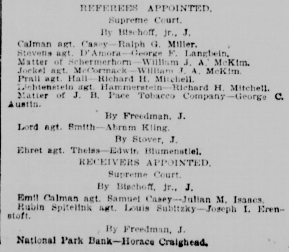 # REFEREES APPOINTED. Supreme Court. By Bischoff, jr., J. Calman agt. Casey-Ralph G. Miller. Stevens agt. D'Amora-George F. Langbein, Matter of Schermerhorn-William J. A. McKim. Jockel agt. McCormack-William J. A. McKim. Prall agt. Hall-Richard H. Mitchell. Lichtenstein agt. Hammerstein-Richard H. Mitchell. Matter of J. B. Pace Tobacco Company-George C. Austin. By Freedman, J. Lord agt. Smith-Abram Kling. By Stover, J. Ehret agt. Theiss-Edwin Blumenstiel. # RECEIVERS APPOINTED. Supreme Court. By Bischoff, jr., J. Emil Calman agt. Samuel Casey-Julian M. Isaacs, Rubin Spitelink agt. Louis Subitzky-Joseph I. Erenstoft. By Freedman, J. National Park Bank-Horace Craighead.