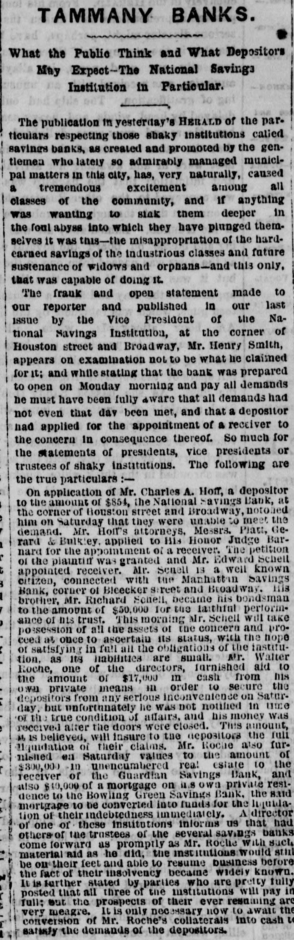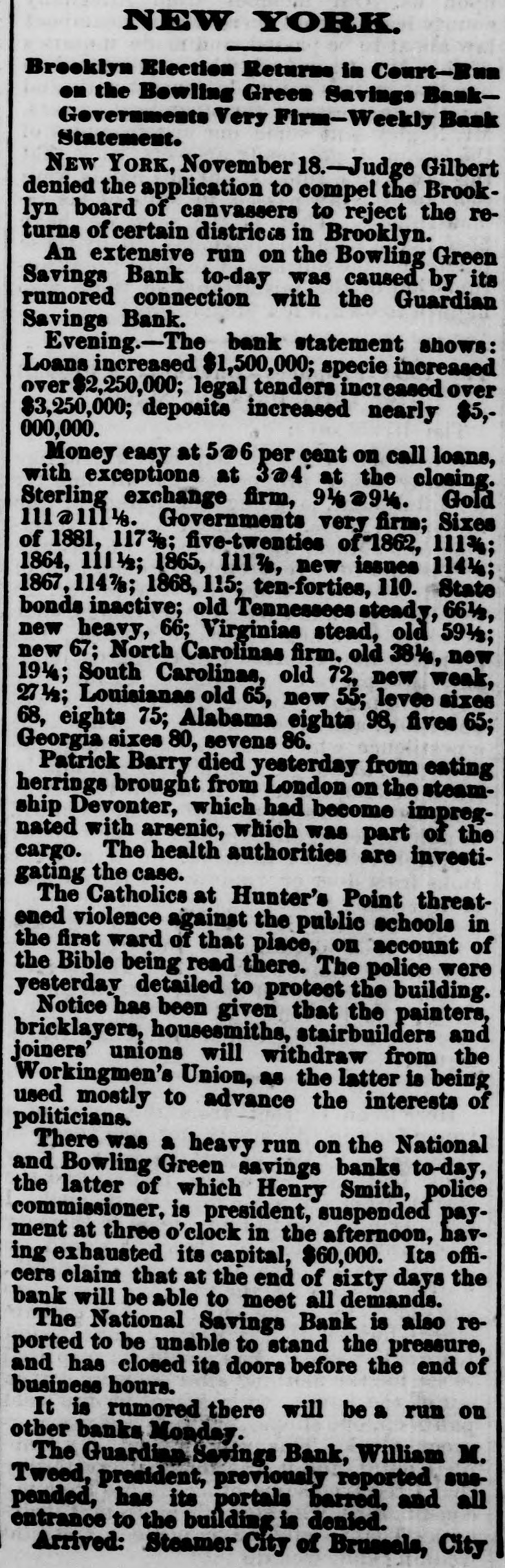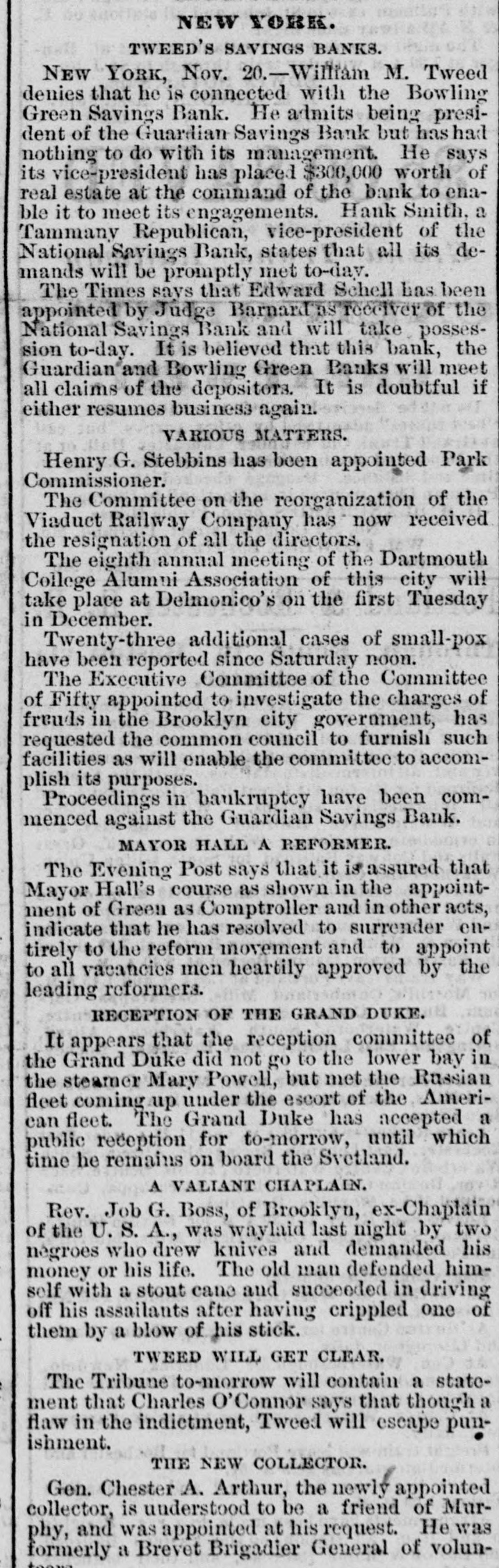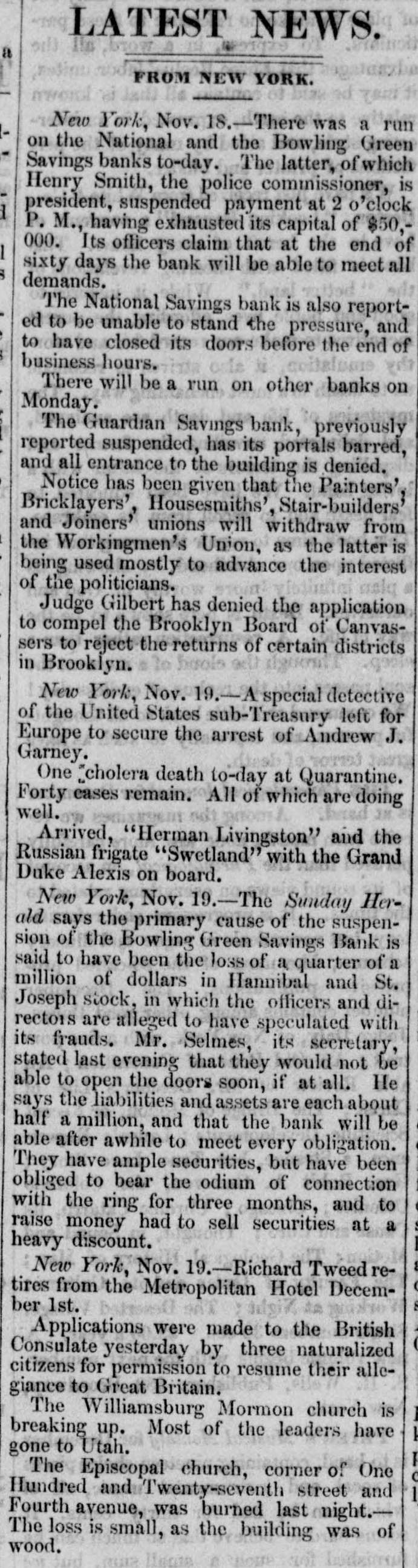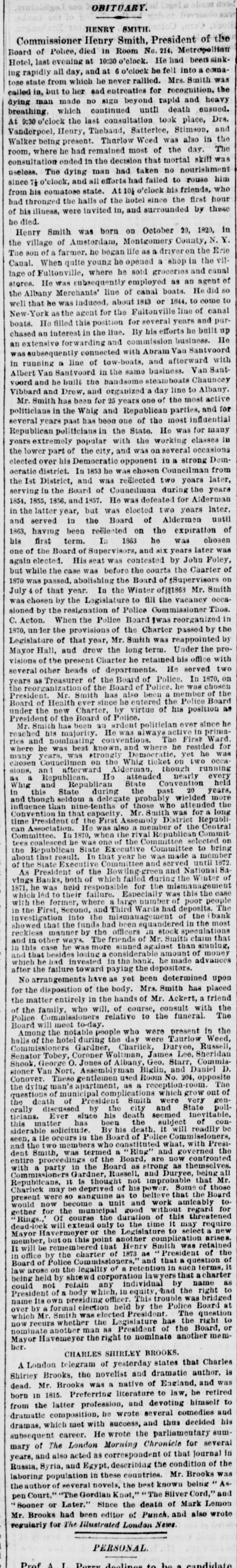 OBITUARY. HENRY SMITH. Commissioner Henry Smith, President of the Board of Police, died in Room No. 214, Metropolitan Hotel, last evening at 10:30 o'elock. He had been sinking rapidly all day, and at 6 o'clock he fell into a connatose state from which he never rallied. Mrs. Smith was called in, but to her sad entreaties for recognition, the dying man made no sign beyond rapid and heavy breathing which continued until death ensued. At o'clock the last consultation took place, Drs. Vanderpoel, Henry, Thebaud, Satterlee, Stimson, and Walker being present. Thurlow Weed was also in the room, where he had remained most of the day. The consultation ended in the decision that mortal skill was useless. The dying man had taken no nourishment since 71 o'clock, and all efforts had failed to rouse him from his comatose state. At 101 o'clock his friends, who had thronged the halls of the hotel since the first hour of his illness, were invited in, and surrounded by these he died. Henry Smith was born on October 20, 1820, in the village of Amsterdam, Montgomery County, N. Y. The son of a farmer. he began life as a driver on the Erie Canal. When quite young he opened a shop in the village of Fultonville, where he sold groceries and canal stores. He was subsequently employed as an agent of the Albany Merchants' line of canal boats. He did so well that he was induced, about 1843 or 1844. to come to New York as the agent for the Fultonville line of canal boats. He filled this position for several years and purchased an interest in the line. By his efforts he built up an extensive forwarding and commission business. He was subsequently connected with Abram Van Santvoord in running & line of tow-boats, and afterward with Albert Van Santvoord in the same business. Van Santvoord and he built the handsome steamboats Chauncey Vibbard and Drew, and organized a day line to Albany. Mr. Smith has bean for 25 years one of the most active politicians in the Whig and Republican parties, and for several years past has been one of the most influential Republican politicians in the State. He was for many years extremely popular with the working classes in the lower part of the city, and was on several occasions elected over his Democratic opponent in a strong Democratic district. In 1853 he was chosen Councilman from the Ist District, and was reelected two years later, serving in the Board of Councilmen during the years 1854. 1855, 1856, and 1857. He was defeated for Alderman in the latter year, but was elected two years later. and served in the Board of Aldermen until 1863, having been reëlected on the expiration of his first term. In 1863 he was chosen one of the Board of Supervisors, and six years later was again elected. His seat was contested by John Foley, but while the case was before the courts the Charter of 1870 was passed, abolishing the Board of #Supervisors on July of that year. In the Winter of Mr. Smith was chosen by the Legislature to fill the vacancy occasioned by the resignation of Police Commissioner Thos. C. Acton. When the Police Board Iwas reorganized in 1870, un der the provisions of the Charter passed by the Legislature of that year, Mr. Smith was reappointed by Mayor Hall, and drew the long term. Under the provisions of the present Charter he retained his office with several other heads of departments. He served two years as Treasurer of the Board of Police. In 1870, on the reorganization of the Board of Police. he was chosen President Mr. Smith has also been a member of the Board of Health ever since he entered the Police Board under the new Charter, by virtue of his position as President of the Board of Police. Mr. Smith has been an ardent politician ever since he reached his majority. He was always active in primaries and nominating conventions. The First Ward where he was best known, and where he resided for many years, was strongly Democratic yet he was chosen Councilmen on the Whig ticket on two occa sions, and afterward Alderman, though running as a Republican. He attended nearly every Whig and Republican State Convention held in this State during the past 20 years, and though seldom a delegate probably wielded more influence than nine-tenths of those who attended the Convention in that capacity Mr. Smith was for a long time President of the First Assembly District Republi can Association. He was also a member of the Central Committee In 1870, when the rival Republican Commit tees coalesced he was one of the Committee selected on the Republican State Executive Committee to bring about that result. In that year be was made a member of the State Executive Committee and served until 1872 As President of the Bowling green and National Savings Banks, both of which failed during the W inter of 1871, he was held responsible for the mismanagement which 1éd to their failure. Especially was this the case with the former, where large number of poor people in the First, Second, and Third Wards had deposits. The investigation into the mismanag of the bank showed that the funds had been squandered in the most reckless manner by the officers stock speculations and in other ways. The friends of Mr. Smith claim that in this case he was more sinned against than sinning, and that besides losing considerable amount of money which he bad invested in the bank, he made advances after the failure toward paying the depositors. No arrangements have as yet been determined upon for the disposition of the body. Mrs. Smith has placed the matter entirely in the hands of Mr. Ackert, a friend of the family, who will, of course, consult with the Police Commissioners relative to the funeral. The Board will meet to-day Among the notable people who were present in the halls of the hotel during the day were Taurlow Weed, Commissioners Gardner, Charlick, Duryee, Russell, Senator Tobey, Coroner Woltman, James Lee, Sheridan Shook George O. Jones of Albany, Geo. Starr, Commissioner Van Nort. Assemblyman Biglin, and Daniel D. Conov
