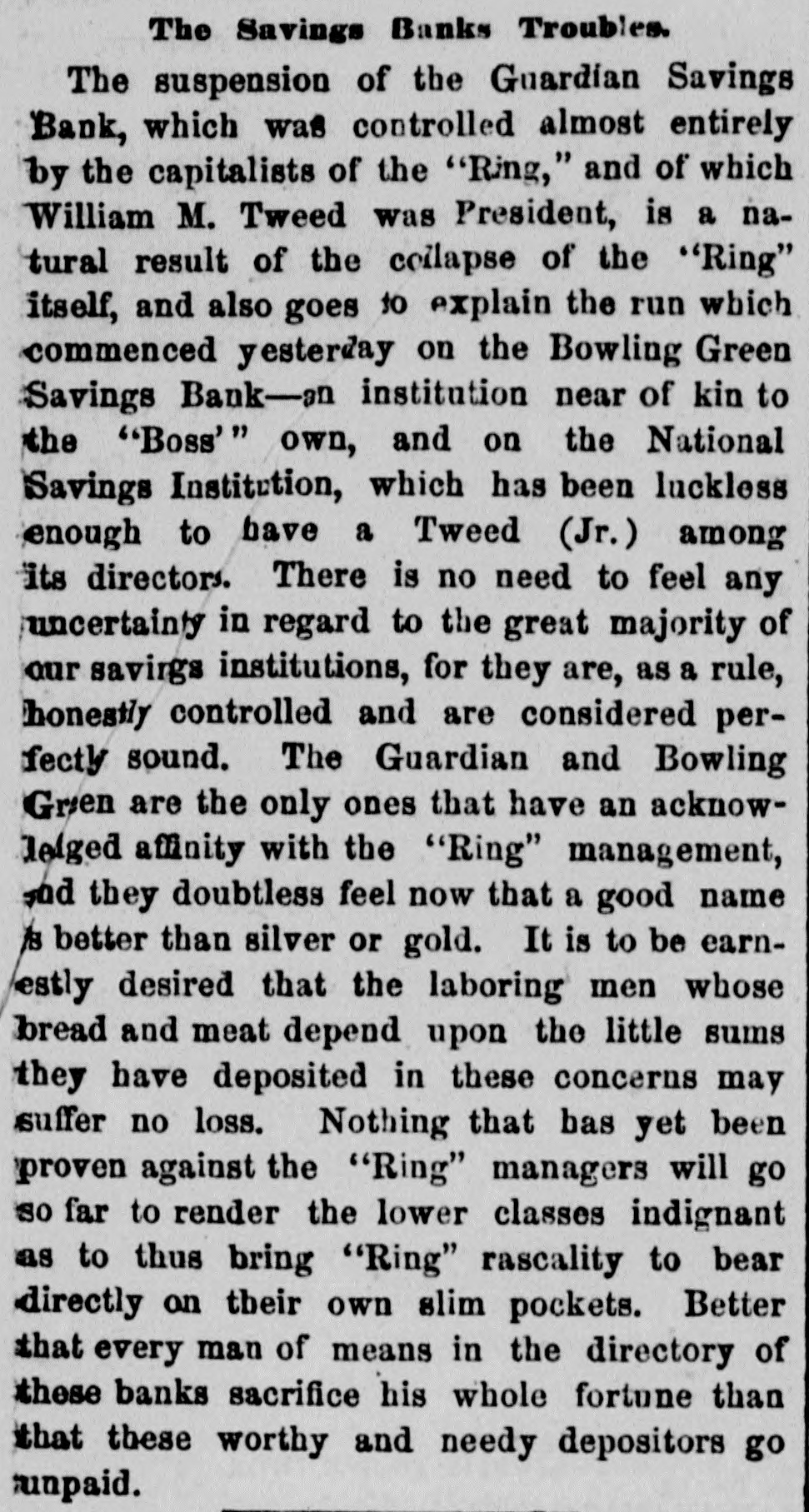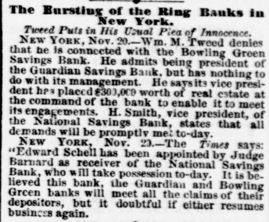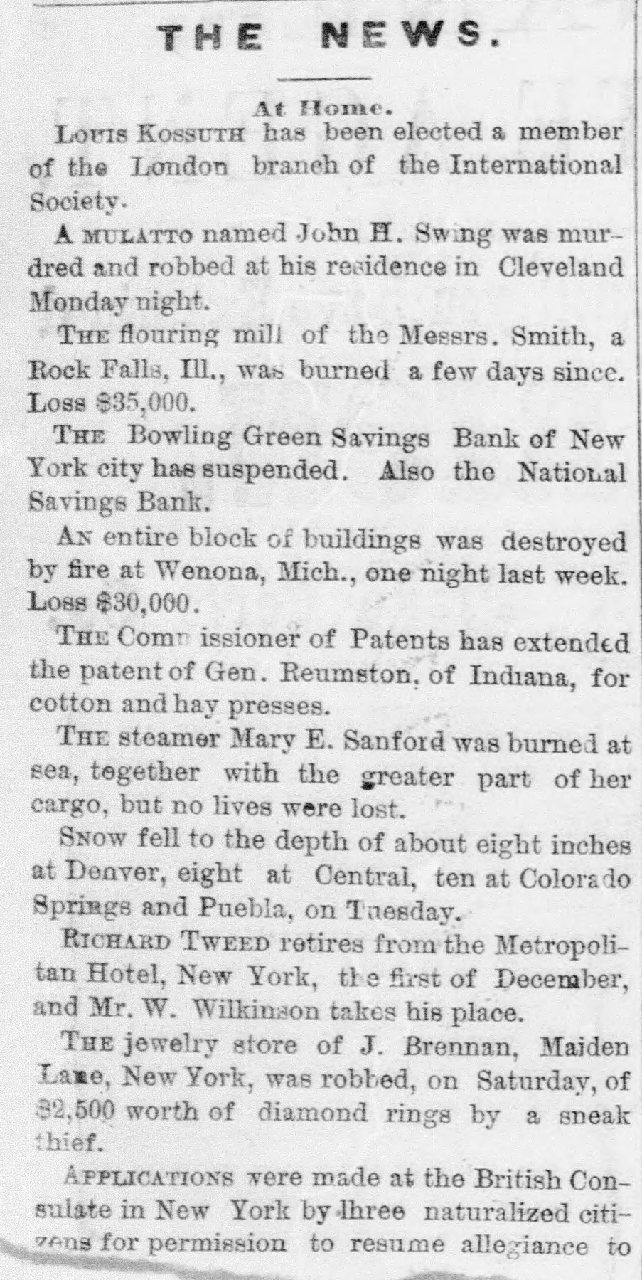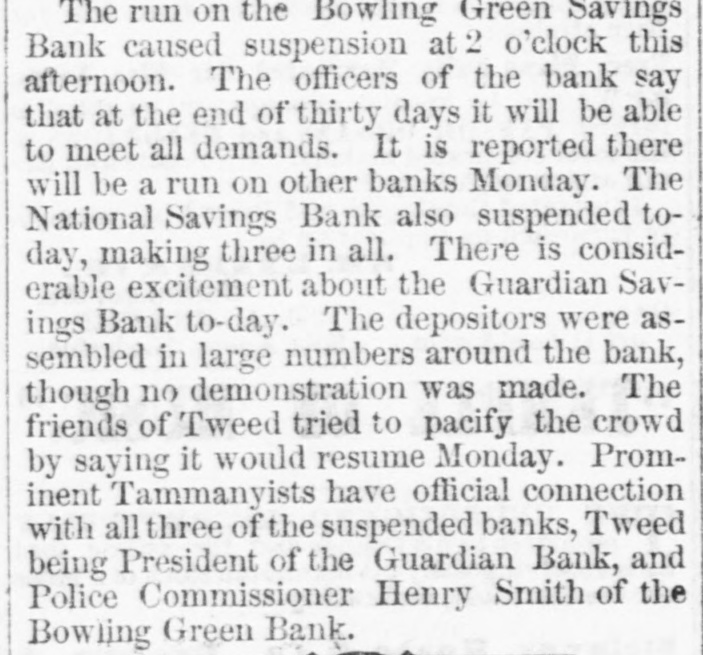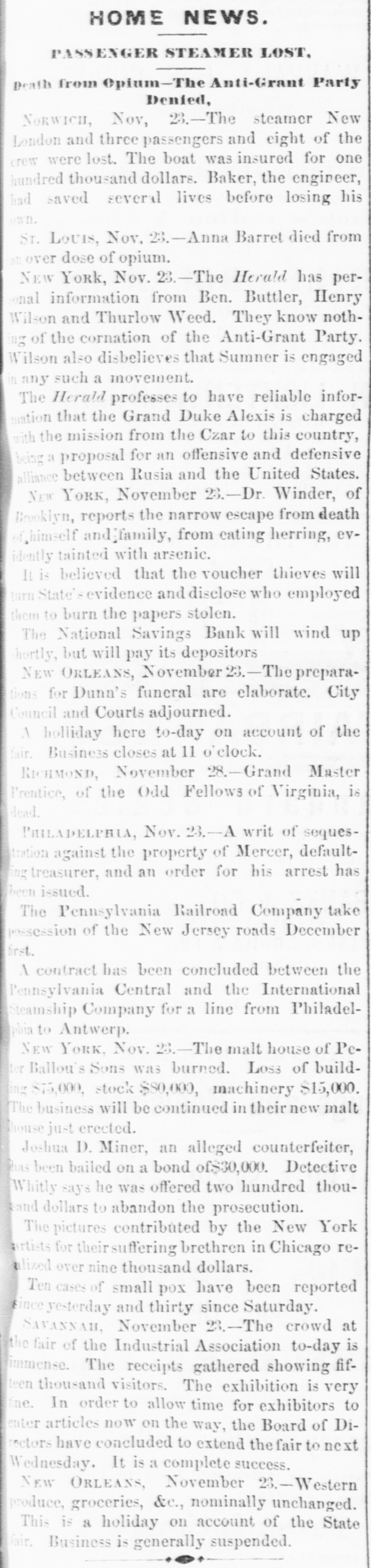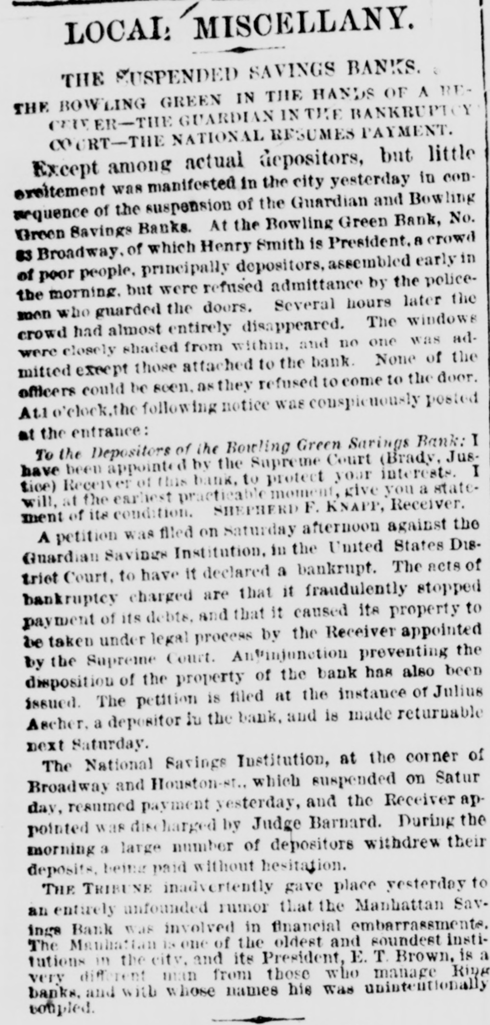OBITUARY. HENRY SMITH. Commissioner Henry Smith, President of the Board of Police, died in Room No. 214, Metropolitan Hotel, last evening at 10:30 o'elock. He had been sinking rapidly all day, and at 6 o'clock he fell into a connatose state from which he never rallied. Mrs. Smith was called in, but to her sad entreaties for recognition, the dying man made no sign beyond rapid and heavy breathing which continued until death ensued. At o'clock the last consultation took place, Drs. Vanderpoel, Henry, Thebaud, Satterlee, Stimson, and Walker being present. Thurlow Weed was also in the room, where he had remained most of the day. The consultation ended in the decision that mortal skill was useless. The dying man had taken no nourishment since 71 o'clock, and all efforts had failed to rouse him from his comatose state. At 101 o'clock his friends, who had thronged the halls of the hotel since the first hour of his illness, were invited in, and surrounded by these he died. Henry Smith was born on October 20, 1820, in the village of Amsterdam, Montgomery County, N. Y. The son of a farmer. he began life as a driver on the Erie Canal. When quite young he opened a shop in the village of Fultonville, where he sold groceries and canal stores. He was subsequently employed as an agent of the Albany Merchants' line of canal boats. He did so well that he was induced, about 1843 or 1844. to come to New York as the agent for the Fultonville line of canal boats. He filled this position for several years and purchased an interest in the line. By his efforts he built up an extensive forwarding and commission business. He was subsequently connected with Abram Van Santvoord in running & line of tow-boats, and afterward with Albert Van Santvoord in the same business. Van Santvoord and he built the handsome steamboats Chauncey Vibbard and Drew, and organized a day line to Albany. Mr. Smith has bean for 25 years one of the most active politicians in the Whig and Republican parties, and for several years past has been one of the most influential Republican politicians in the State. He was for many years extremely popular with the working classes in the lower part of the city, and was on several occasions elected over his Democratic opponent in a strong Democratic district. In 1853 he was chosen Councilman from the Ist District, and was reelected two years later, serving in the Board of Councilmen during the years 1854. 1855, 1856, and 1857. He was defeated for Alderman in the latter year, but was elected two years later. and served in the Board of Aldermen until 1863, having been reëlected on the expiration of his first term. In 1863 he was chosen one of the Board of Supervisors, and six years later was again elected. His seat was contested by John Foley, but while the case was before the courts the Charter of 1870 was passed, abolishing the Board of #Supervisors on July of that year. In the Winter of Mr. Smith was chosen by the Legislature to fill the vacancy occasioned by the resignation of Police Commissioner Thos. C. Acton. When the Police Board Iwas reorganized in 1870, un der the provisions of the Charter passed by the Legislature of that year, Mr. Smith was reappointed by Mayor Hall, and drew the long term. Under the provisions of the present Charter he retained his office with several other heads of departments. He served two years as Treasurer of the Board of Police. In 1870, on the reorganization of the Board of Police. he was chosen President Mr. Smith has also been a member of the Board of Health ever since he entered the Police Board under the new Charter, by virtue of his position as President of the Board of Police. Mr. Smith has been an ardent politician ever since he reached his majority. He was always active in primaries and nominating conventions. The First Ward where he was best known, and where he resided for many years, was strongly Democratic yet he was chosen Councilmen on the Whig ticket on two occa sions, and afterward Alderman, though running as a Republican. He attended nearly every Whig and Republican State Convention held in this State during the past 20 years, and though seldom a delegate probably wielded more influence than nine-tenths of those who attended the Convention in that capacity Mr. Smith was for a long time President of the First Assembly District Republi can Association. He was also a member of the Central Committee In 1870, when the rival Republican Commit tees coalesced he was one of the Committee selected on the Republican State Executive Committee to bring about that result. In that year be was made a member of the State Executive Committee and served until 1872 As President of the Bowling green and National Savings Banks, both of which failed during the W inter of 1871, he was held responsible for the mismanagement which 1éd to their failure. Especially was this the case with the former, where large number of poor people in the First, Second, and Third Wards had deposits. The investigation into the mismanag of the bank showed that the funds had been squandered in the most reckless manner by the officers stock speculations and in other ways. The friends of Mr. Smith claim that in this case he was more sinned against than sinning, and that besides losing considerable amount of money which he bad invested in the bank, he made advances after the failure toward paying the depositors. No arrangements have as yet been determined upon for the disposition of the body. Mrs. Smith has placed the matter entirely in the hands of Mr. Ackert, a friend of the family, who will, of course, consult with the Police Commissioners relative to the funeral. The Board will meet to-day Among the notable people who were present in the halls of the hotel during the day were Taurlow Weed, Commissioners Gardner, Charlick, Duryee, Russell, Senator Tobey, Coroner Woltman, James Lee, Sheridan Shook George O. Jones of Albany, Geo. Starr, Commissioner Van Nort. Assemblyman Biglin, and Daniel D. Conov