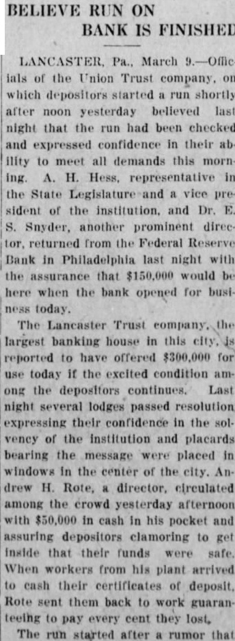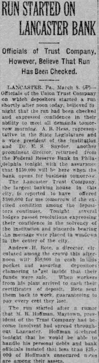 March Officials of the Union Trust Company which depositors started run shortly after noon today. believed to night that the run had been checked and expressed confidence in their ability to meet all demands tomortative in the State Legislature and president the institution and Dr another prominent director, returned from the Federal Reserve Bank in Philadelphia tonight with the assurance that will be here when the bank opens for business The Lancaster Trust Company the largest banking house in this city is reported have offered $300,000 for use tomorrow if cited condition among the Jepositors Tonight several lodges passed resolutions expressing their confidence in the solvency institution and placards bearing the message placed in windows in the center of the city culated among the crowd this afternoon with $59,000 cash pocket and assuring depositors clamoring inside that their funds were safe. When workers from his plant arrived to cash their certificates of deposit. Rote sent them back to work, guaranteeing pay every cent they lost. The run started after rumor that Hoffman. Maytown, ident of the Trust Company had come Insolvent had spread throughLancaster Hoffman tonight that would be able handle his personal debts and bank officials insisted that less than 000 of Hoffman's unsecured are among their assets.