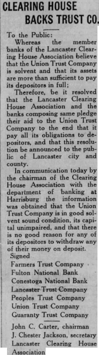 To the Public: Whereas the member banks of the Lancaster Clearing House Association believe that the Union Trust Company is solvent and that its assets are more than sufficient to pay its depositors in full; Therefore, be it resolved that the Lancaster Clearing House Association and the banks composing same pledge their aid to the Union Trust Company to the end that it pay all its obligations to depositors, and that this resolution be announced to the public of Lancaster city and county. In today by the chΓ irman of the Clearing House Association with the department banking at Harrisburg the information obtained that the Union Trust Company is in good solvent sound condition, its capital unimpaired, and that there is no good reason for any of its depositors to withdraw any of their money on deposit. Signed Farmers Trust Company Fulton National Bank Conestoga National Bank Company Peoples Trust Company Union Trust Company Guaranty Trust Company